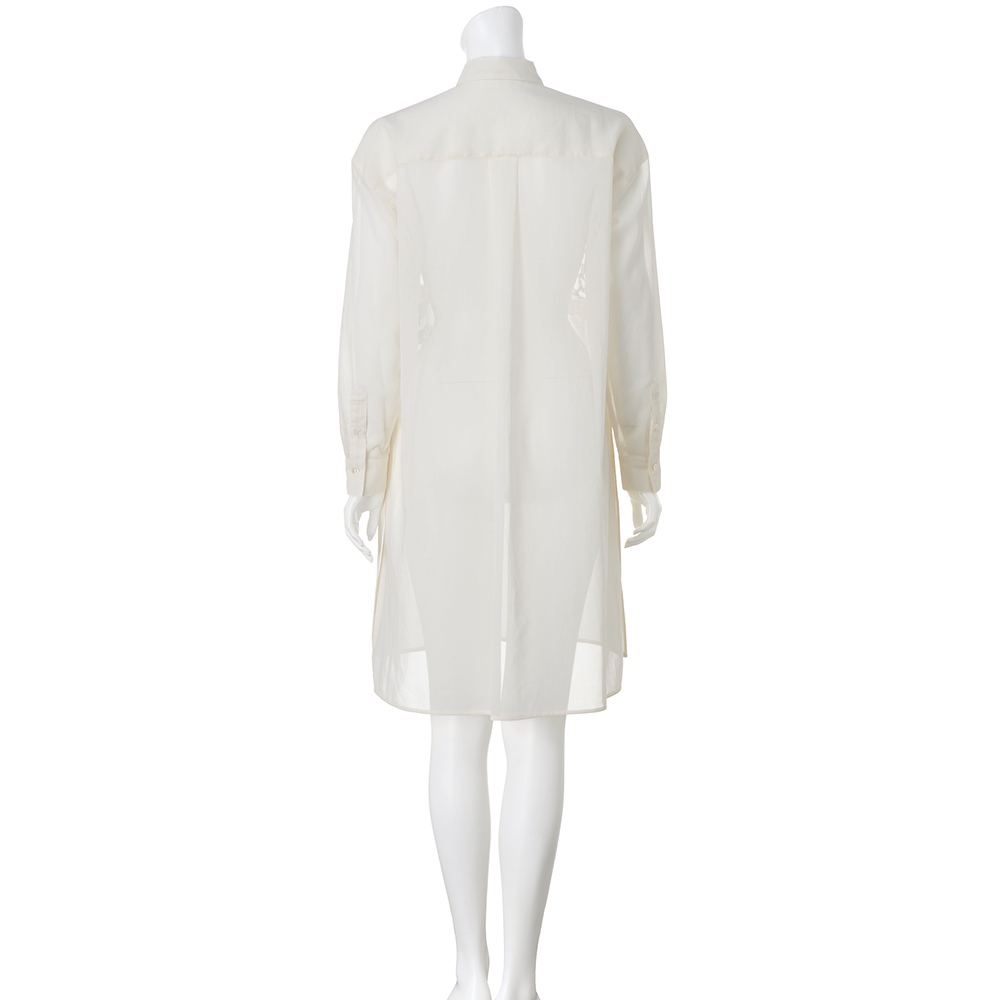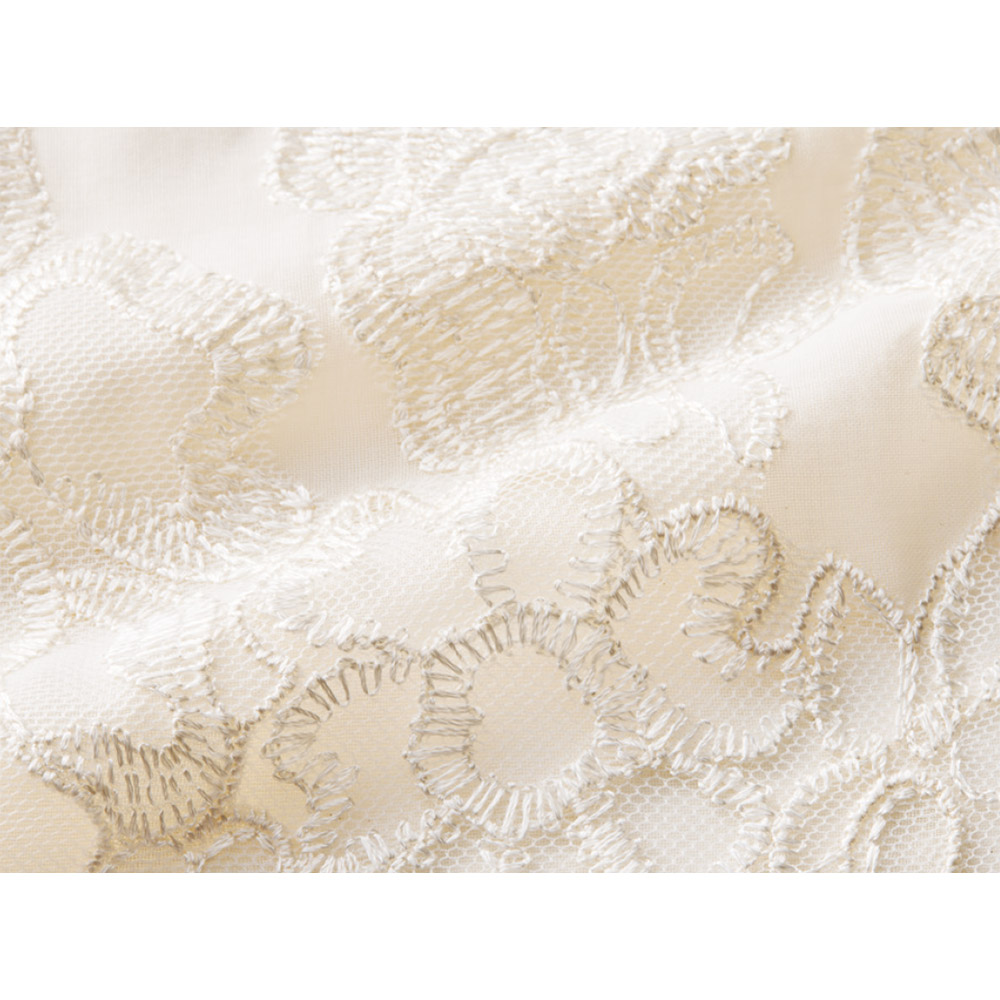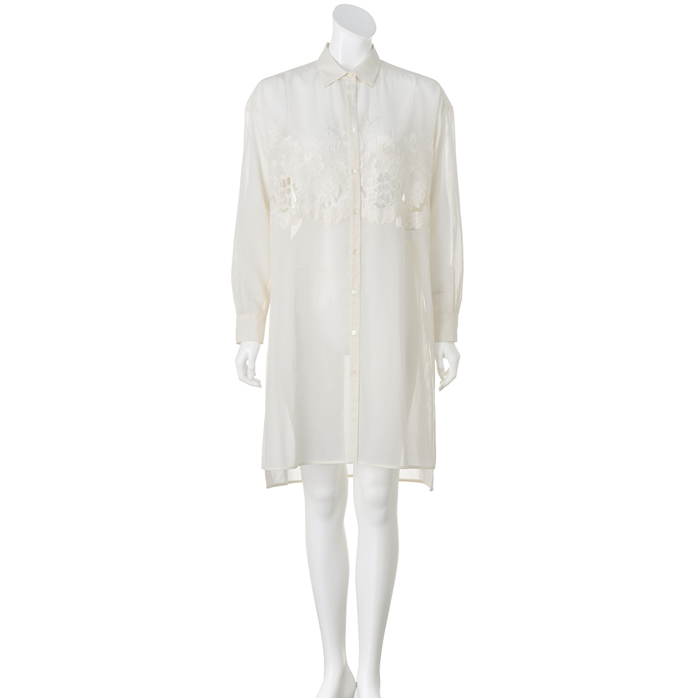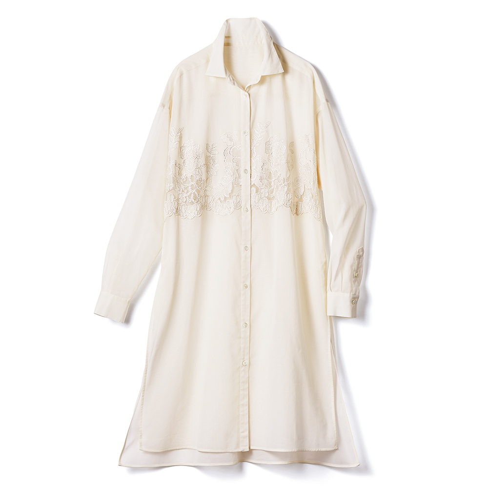 自然のニュアンスを装いに載せて。心和むナチュラルカラーや自然モチーフを、リュクスに再解釈。優しさとモード感が調和したデイリーワードローブをお届けします。着こなしが洗練する清らかな華やぎブラウスベースの生地は上品な透け感のコットンボイルオーガンジー素材。フロントの胸元に「敦賀繊維(株)」のクラシカルなフラワー柄のエンブロイダリーレースをあしらい、チュールを裏打ちして柄の一部の身生地をハンドカット。陰影豊かにモチーフを浮きあがらせる、ラグジュアリーでエアリーな美しさにときめきます。両サイドに入れたベントも、さりげなくも効果的な着映えポイント。前を留めても軽く羽織っても、優雅な躍動感に心が躍ります。≫ POINT繊細なフラワー柄のエンブロイダリーレースを胸元に配置。透明感のあるオーガンジー素材とのコントラストが、上品な印象です。