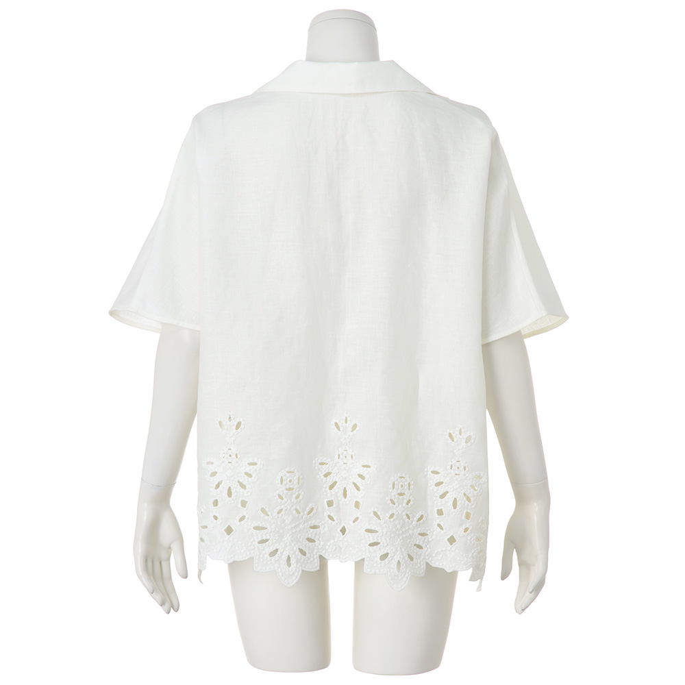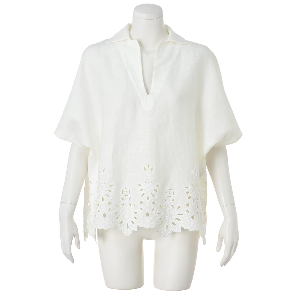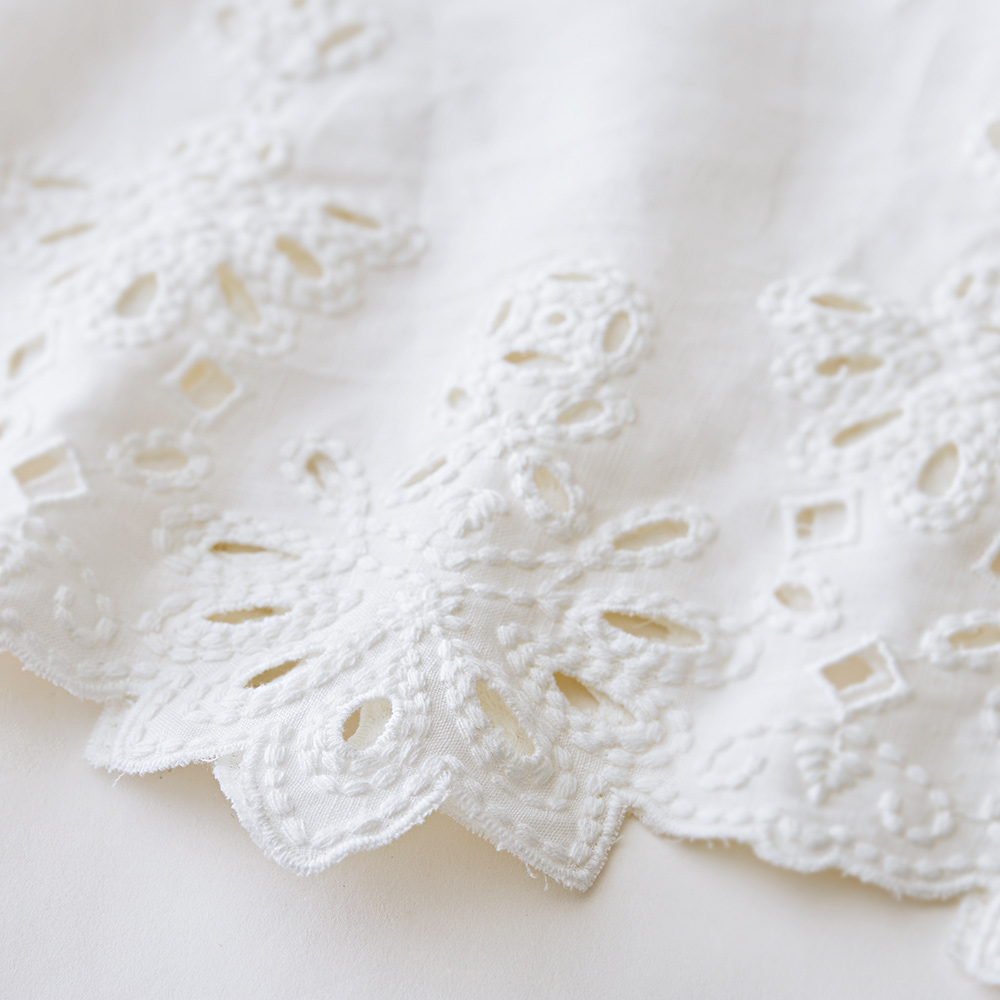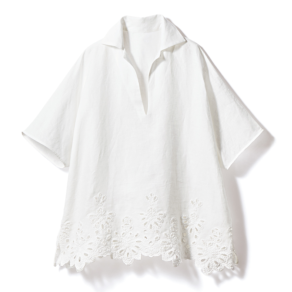 本物を装うリラックス気分で纏うカットワークレースが大人の余裕を物語る清らかなラグジュアリー感を放つチュニックは、「敦賀繊維(株)」のフレンチリネン100%のカットワークレース素材。幾何学柄ベースのモチーフだから甘くなりすぎず、モダンアートのような雰囲気を醸すのが大人好みです。デザインは、生地の美しさを贅沢に活かしたスクエアフォルムの身頃に、立たせても絵になる襟と深いV開きの組み合わせ。開きは見返し仕立てにしているからラインがシャープに仕上がりすっきりとした襟周りを演出。涼しくリラックスした着心地でありながら凛としたエレガンスが香ります。清涼美を描くカットワークリネン。人気のカットワークレースこそ大人の女性にふさわしい品格と華やぎに拘りたい…。これもまた、「本物を装う」企画の譲れない視点です。たどり着いたのが、企画から製造までを一貫して自社で手掛け、丁寧な仕事に裏打ちされたJAPAN QUALITYを誇るエンブロイダリーメーカー「敦賀繊維(株)」のテキスタイルです。ドライで清涼感溢れるフレンチリネンのキャンバス地に存在感のあるコットン糸で密に刺しゅうしているのでモチーフに程良い立体感があり、カットワークやアイレットとの涼やかな対比を楽しめます。すっと風が抜けるシンプルなチュニックに仕立て、涼やかさもラグジュアリー感も気負いなく楽しめる一着が完成しました。