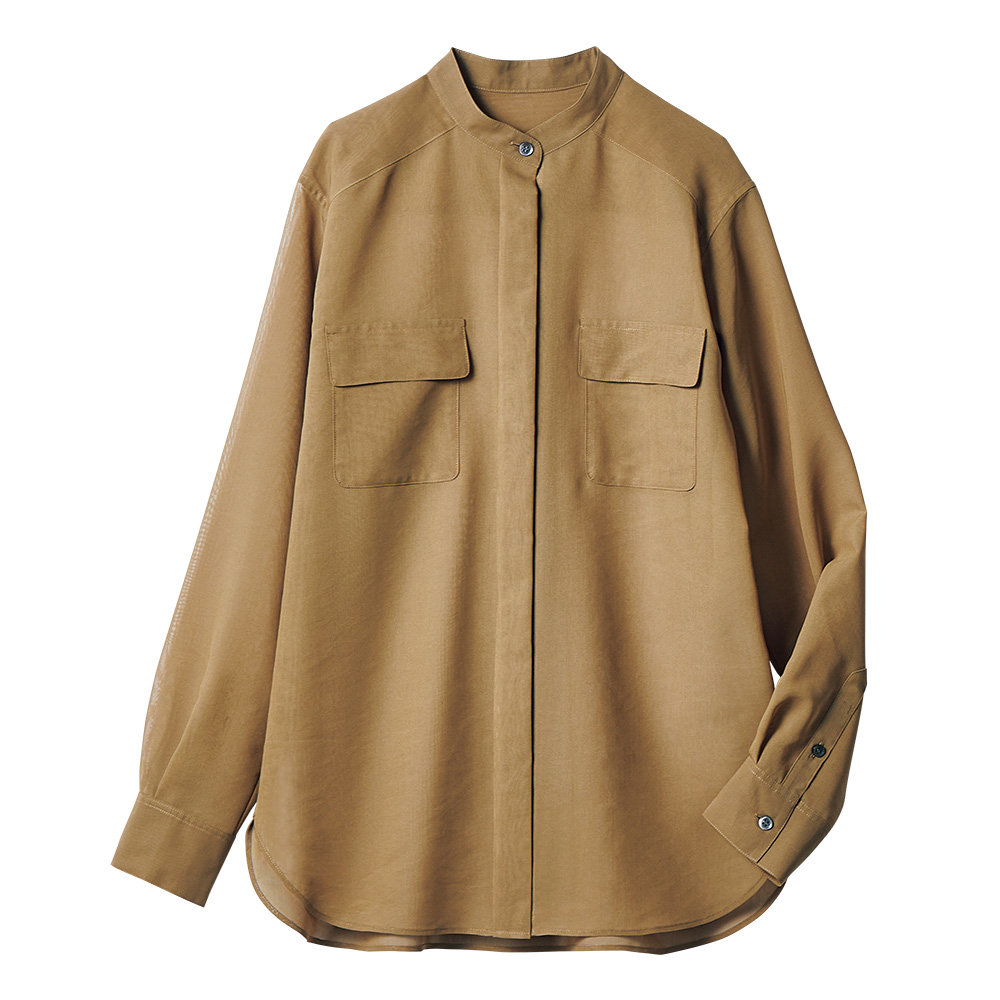 軽やかに知性を香らせて仕事服に求めるのは、きちんと感だけでなく、知的な女性らしさも。オフィスにも映える上品なシアー感上品な透け感のオーガンジー。キャリアシーンでも知的さを損なうことなくシアー素材を着こなせるよう、バンドカラーに比翼前立ての凜としたシャツに仕立てました。裾はラウンドスリット入りで、インでもアウトでも、前だけインにしても。100番手双糸を織り上げた薄く繊細なボイル生地に特殊なオーガンジー加工を施した生地は、シャリ感とハリ感があって爽やか、肌当たりはなめらか。ゆとりを持たせたサイズ感には、肌離れの良さを高めるだけでなく、透け感を和らげる効果も。オンオフ問わず着こなせる汎用性の高さも魅力のアイテム。