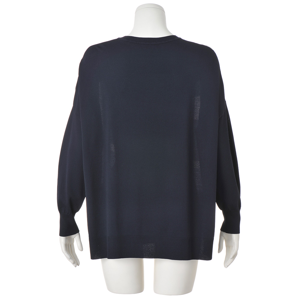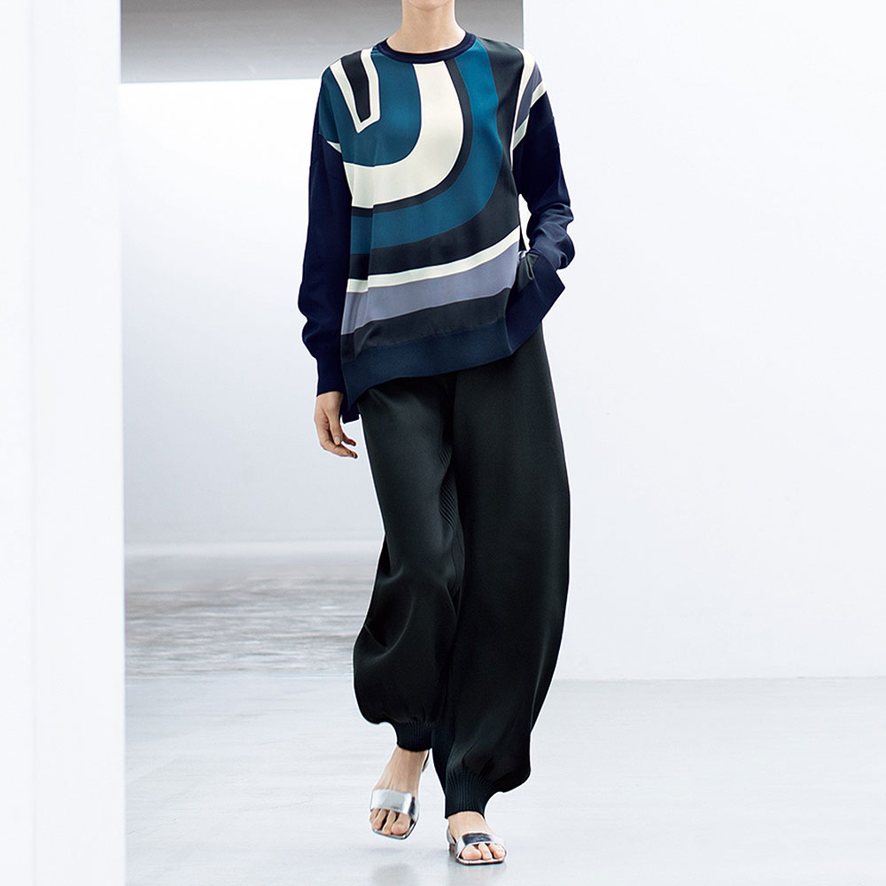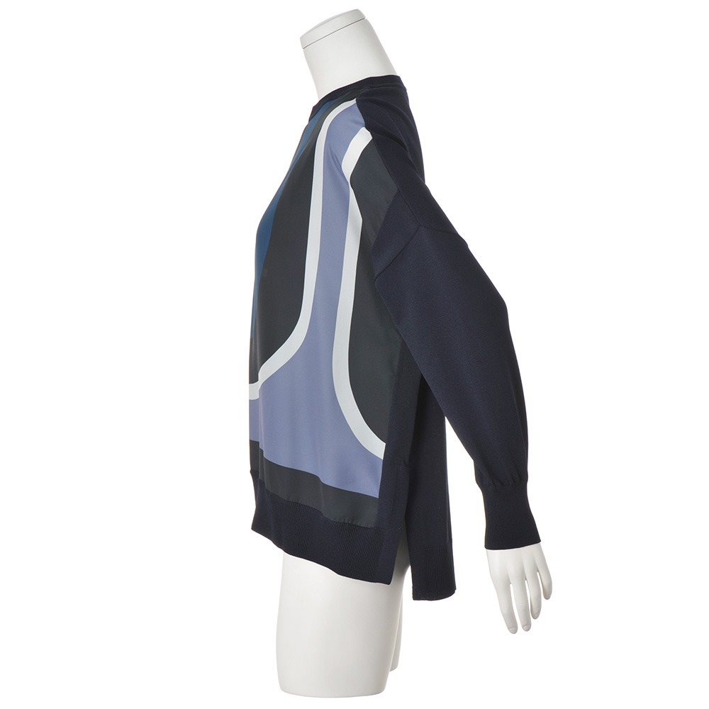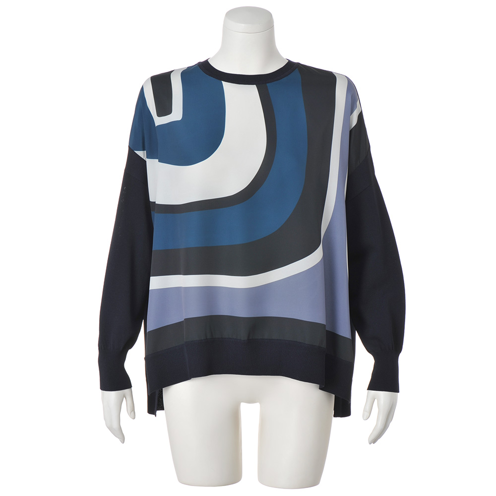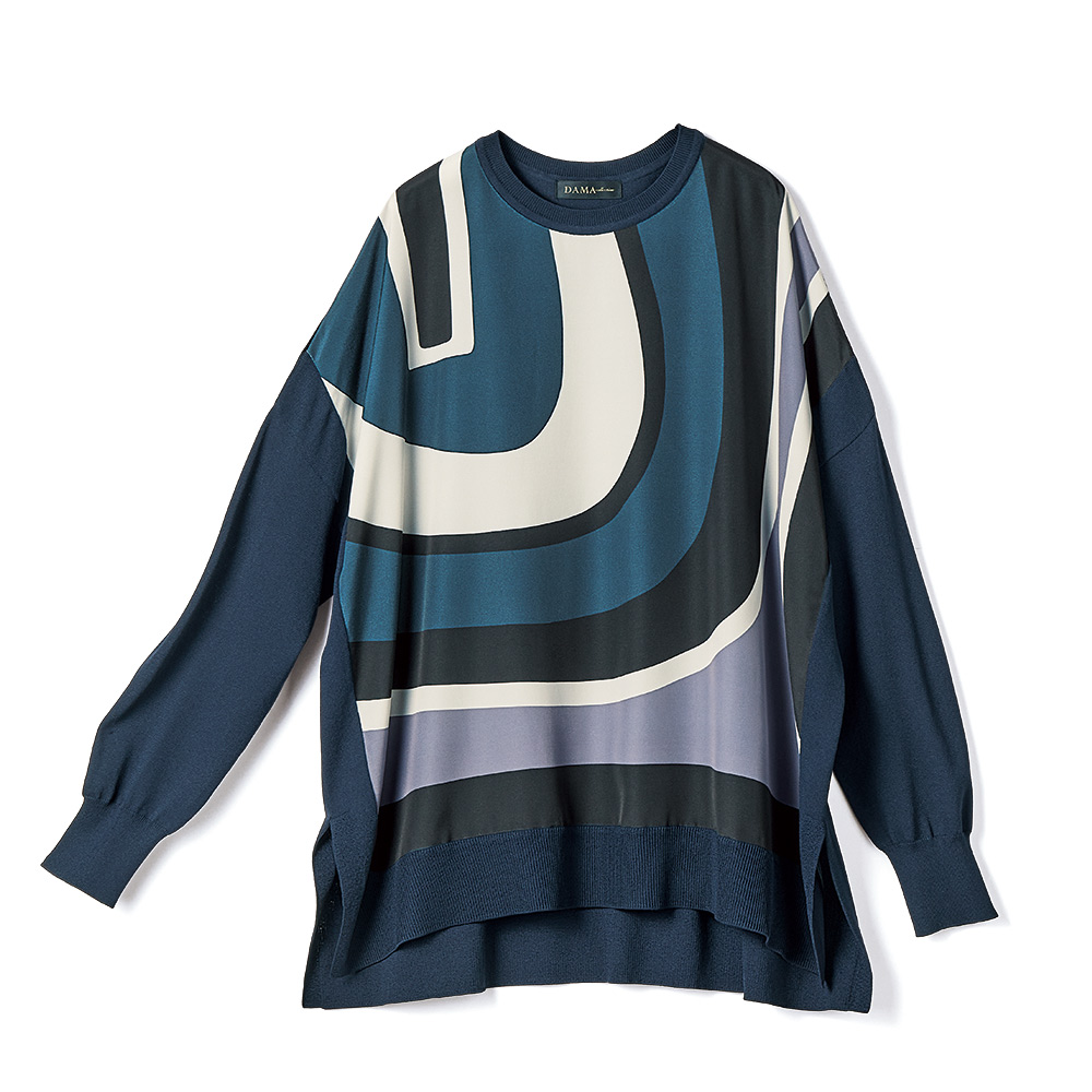 形とバランスで魅せるミニマル構築的なフォルムやディテール…。ミニマルの中で際立つモダンな着映えを約束します。遠目にも際立つクール・モダン着こなしやすいスクエアフォルムをベースにして、流線形の柄の個性を軽やかに印象付ける異素材コンビのプルオーバー。前身頃に配したプリント生地は、程良い厚みとソフトな風合いのデシン素材。大胆な柄を寒色系でまとめたクール・モダンなテイストは、大人のお洒落心を刺激します。袖や後ろ身頃のネイビーのニット部分は、滑らかなレーヨン混糸のハイゲージ天竺。襟ぐりと裾にはリブ編みを合わせてエッジ部分を引き締めて。脇線の切り替えをやや前側にして、すっきりと細見え効果を叶えました。≫ POINT体型カバー力を発揮するスクエアシルエット。短めの前身頃と脇スリットで、軽やかなバランスです。