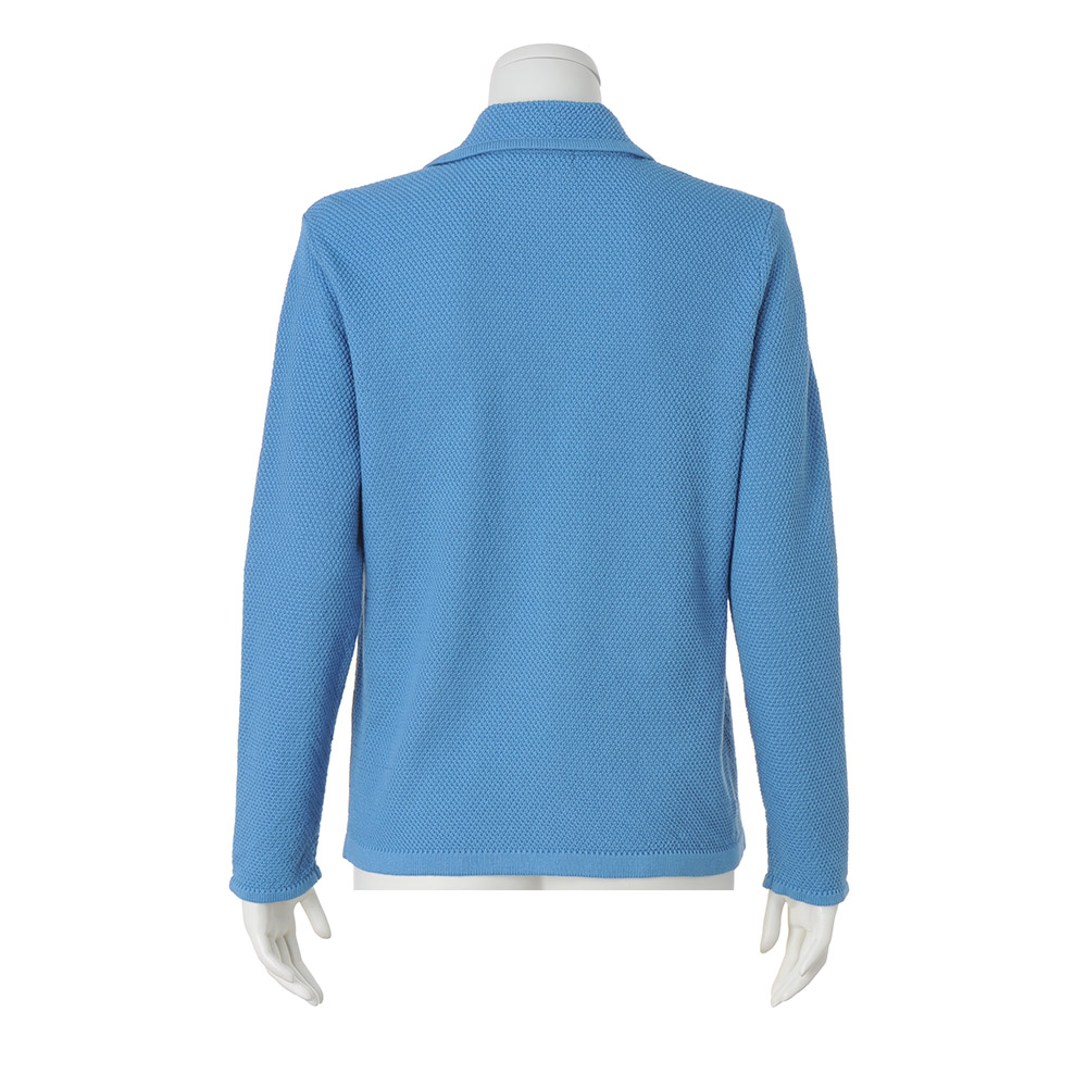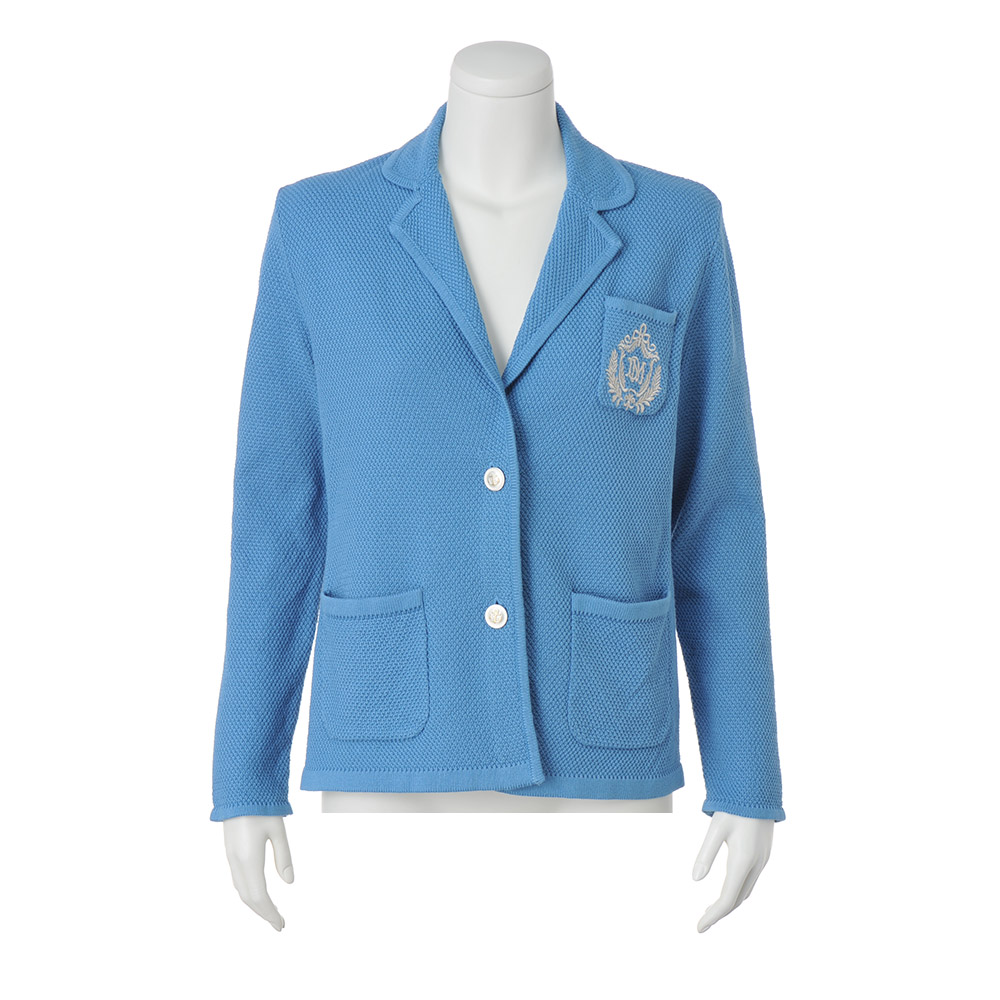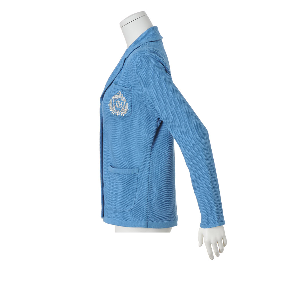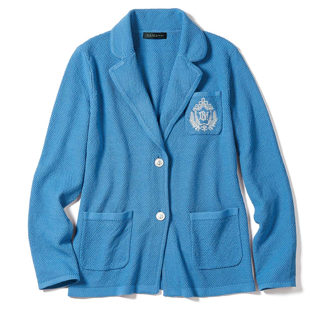 軽く羽織るだけで際立つ端正でクリーンな佇まい肩肘張らず、サッと羽織ることができるニットジャケットは、きちんと感と空調除けにマストハブのアイテムです。糸はイタリア「SESIA」社の中でも、ハイグレードのエジプト綿を選りすぐったもの。原綿の白度が高く、美しい染め上がりと艶やかな光沢、しなやかさを兼ね備えています。編み地はミドルゲージの鹿の子編みで、肌離れがよくさらりとしながら、型崩れしにくい端正な作り。胸ポケットには、マットシルバーのボタンと色を揃えたエンブレムを刺しゅうし華やかに。≫ POINT顔映りのよいブルーとマットシルバーボタンが軽快。ニットの柔らかな着心地が、カーディガン感覚で気楽に羽織れます。