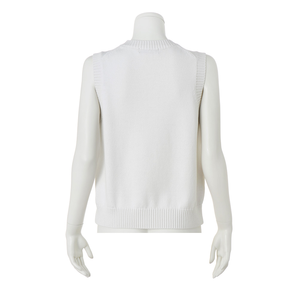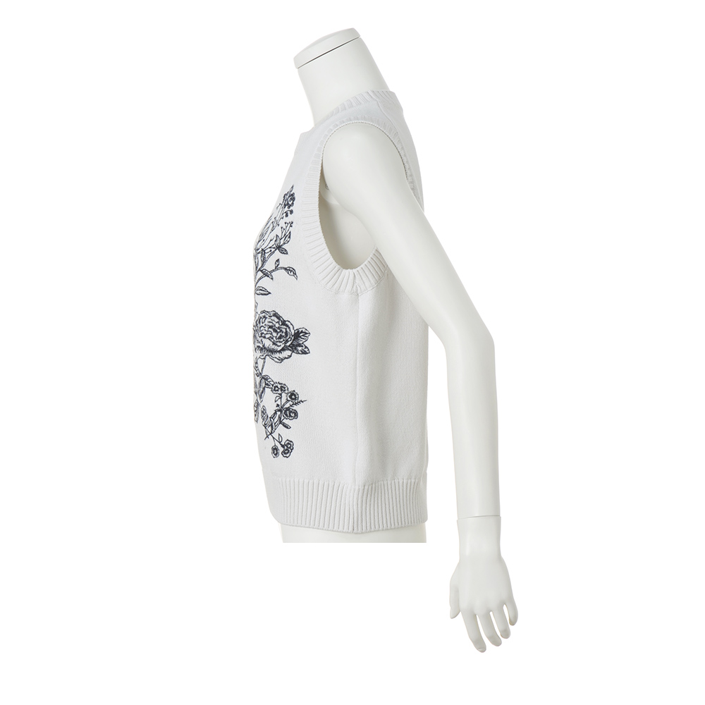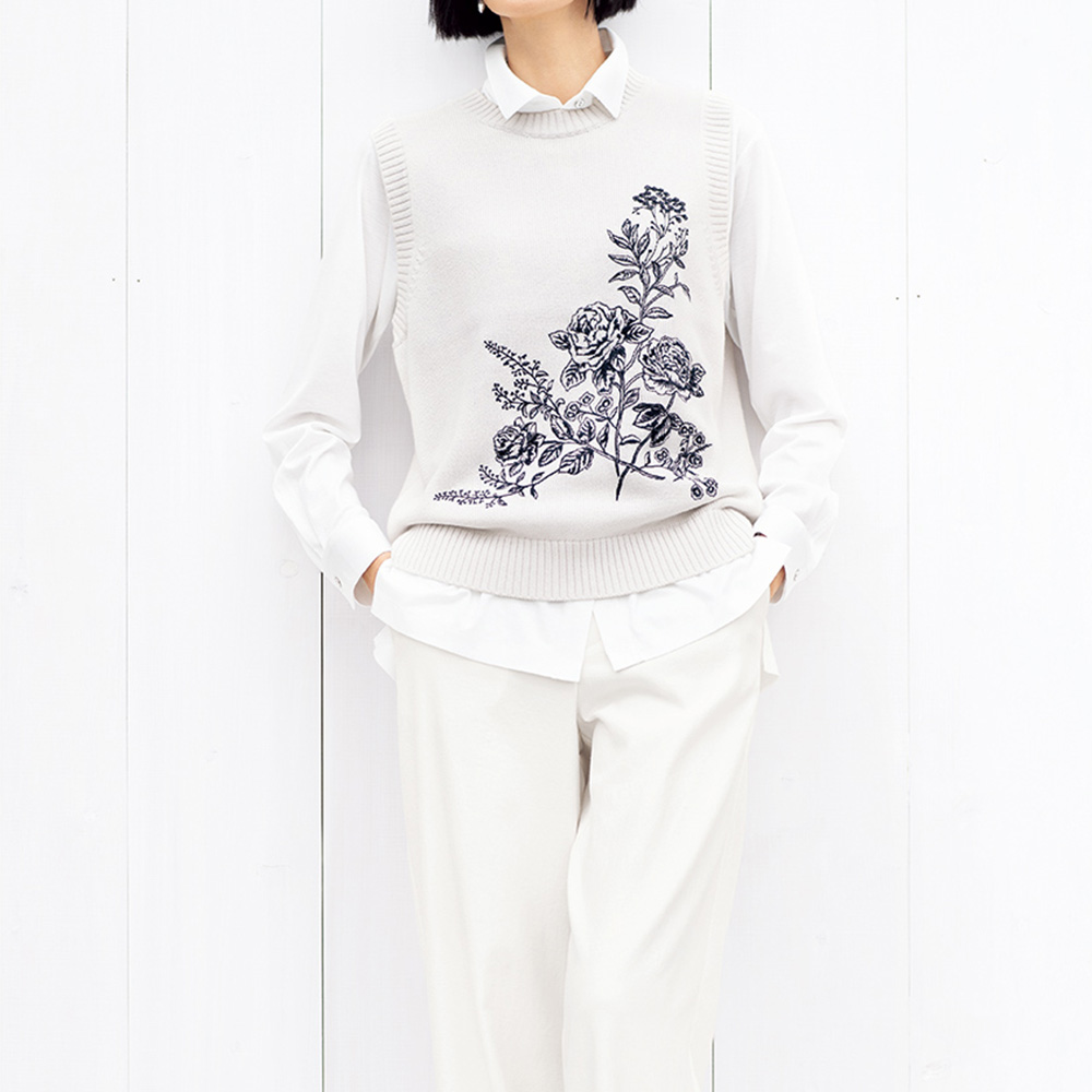 ネイビー刺しゅうの繊細な甘さが香り立つ着こなしが平坦になりがちな季節に、レイヤードで奥行きあるスタイリングを叶えてくれるベストはいかがでしょう?明るいアイスグレーのニットは、特殊な加工のひと手間で糸に空気層を持たせることで柔らかな着心地を実現。ミドルゲージの天竺編みをベースに裾リブが腰辺りで止まり、雰囲気のあるドレープが生まれるよう計算しています。前身頃にはボタニカル柄をネイビーの糸でミシン刺しゅう。針数を詰め過ぎずゆったりと刺すことで、刺しゅう部分がソフトに仕上がり、まるでプリントを重ねたような繊細でなめらかな着心地に。単品でプルオーバーとしても心地良く着られる一着です。