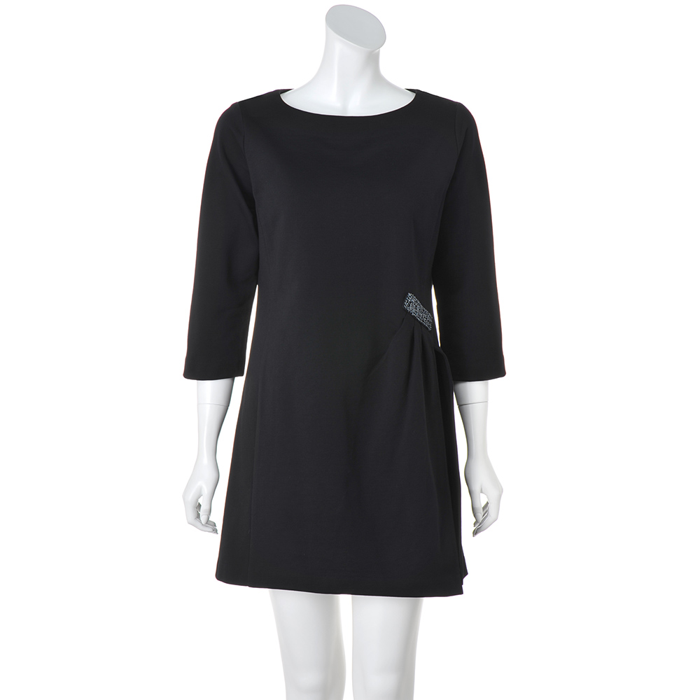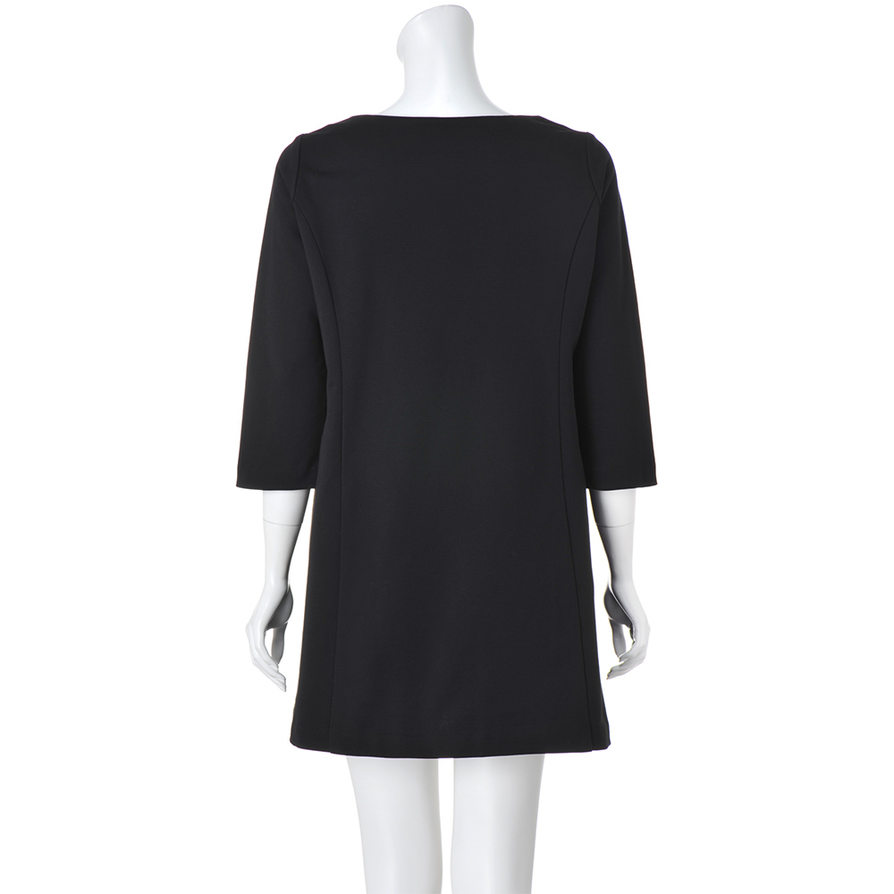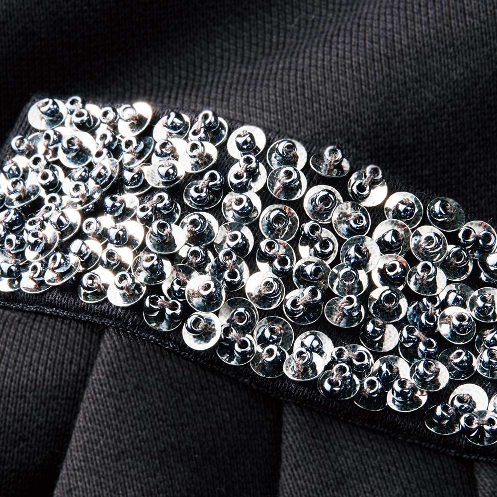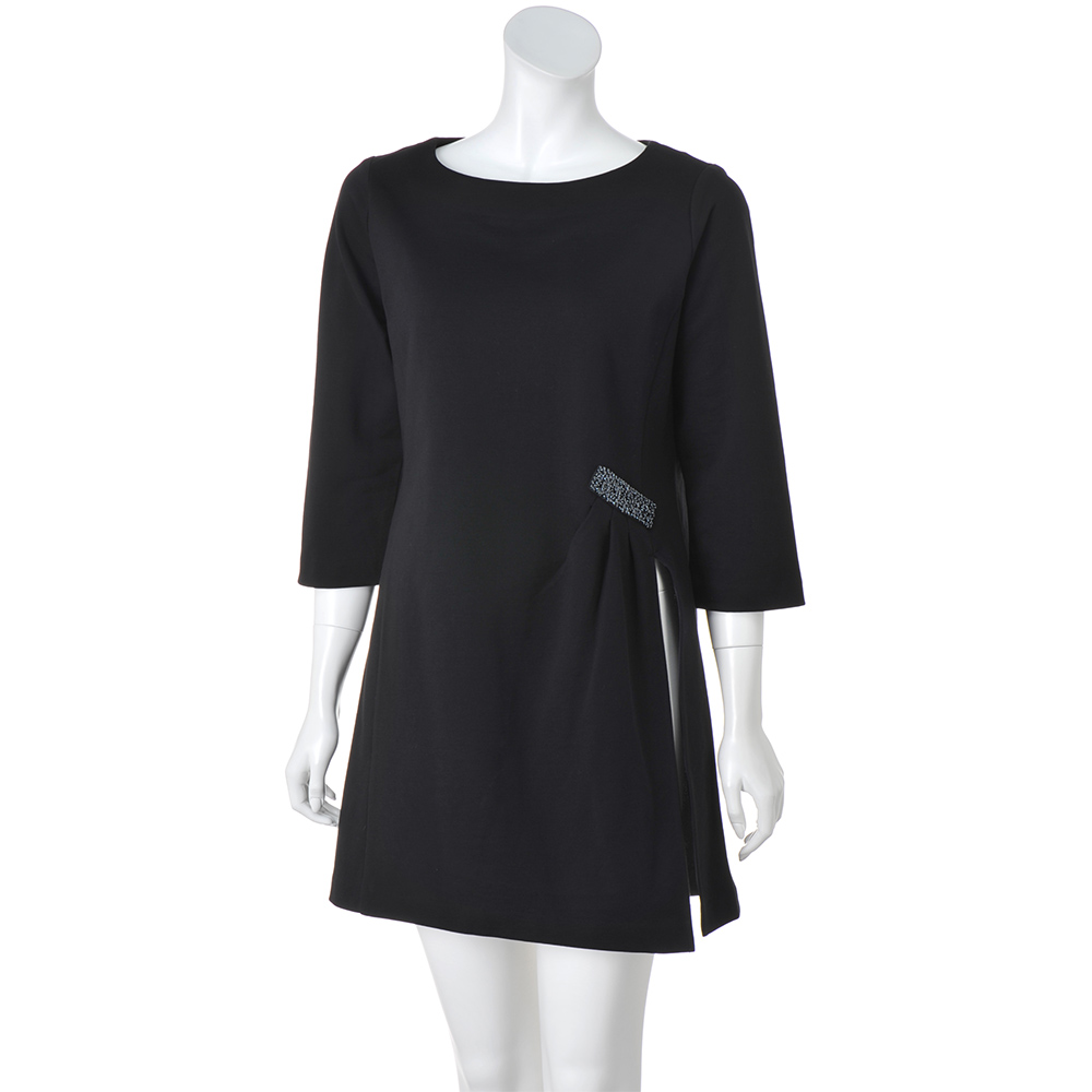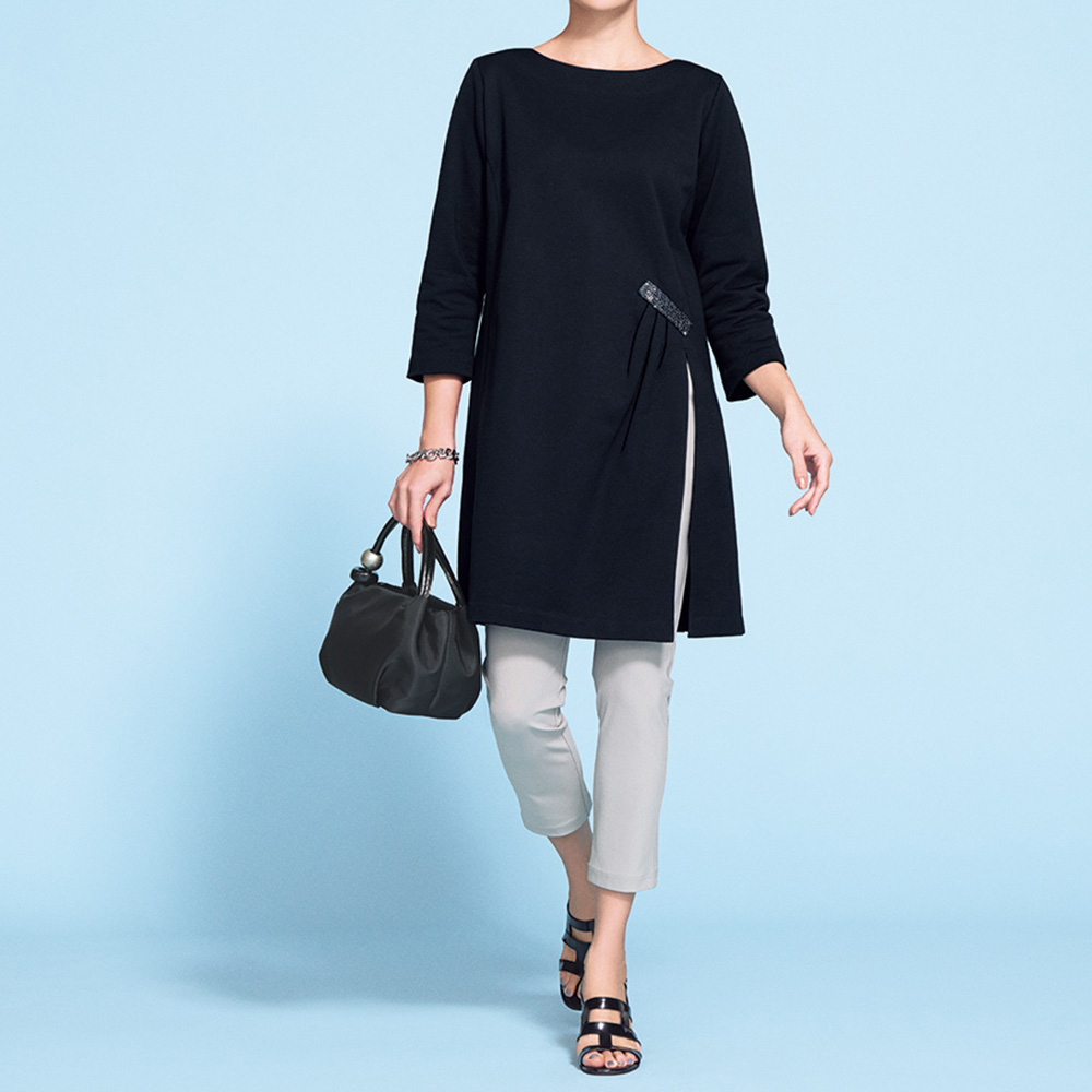 爽やかな風が吹き抜ける、美麗なチュニック華やかなデザイン、清涼感あふれる素材のチュニックで、理想の着こなしを。計算されたタックとビジューで美しさの可能性をアップデート落ち着いた光沢ときれいなシルエットを保つハリ感があり、身体のラインを拾いにくいハイゲージの裏毛ジャージー。超長綿“スーピマコットン”を特殊加工することで、しっかりとフォルムをつくる上質素材が実現しました。ボートネック、七分袖がすっきり見える長め丈のチュニックは、ボディラインを美しく描くよう、縦にパネルで切り替えを入れて。左腰位置には、タックと手刺ししたスパンコールとビーズのブローチ風モチーフで立体的な煌めきを添えました。深く大胆にスリットを入れることで、黒に抜け感が生まれ、配色を効かせたパンツが、さらに脚長効果を発揮します。
