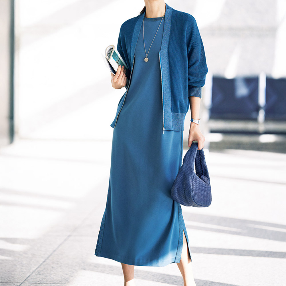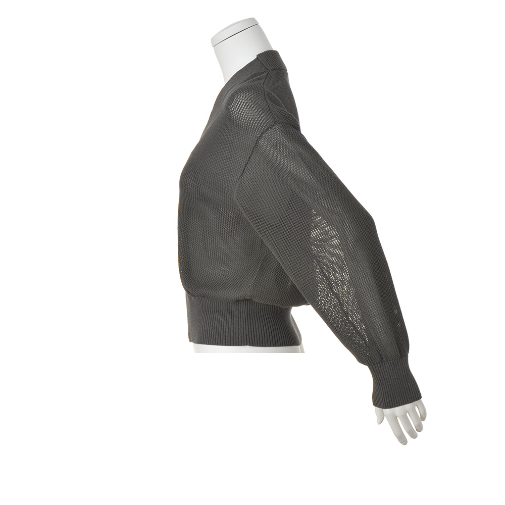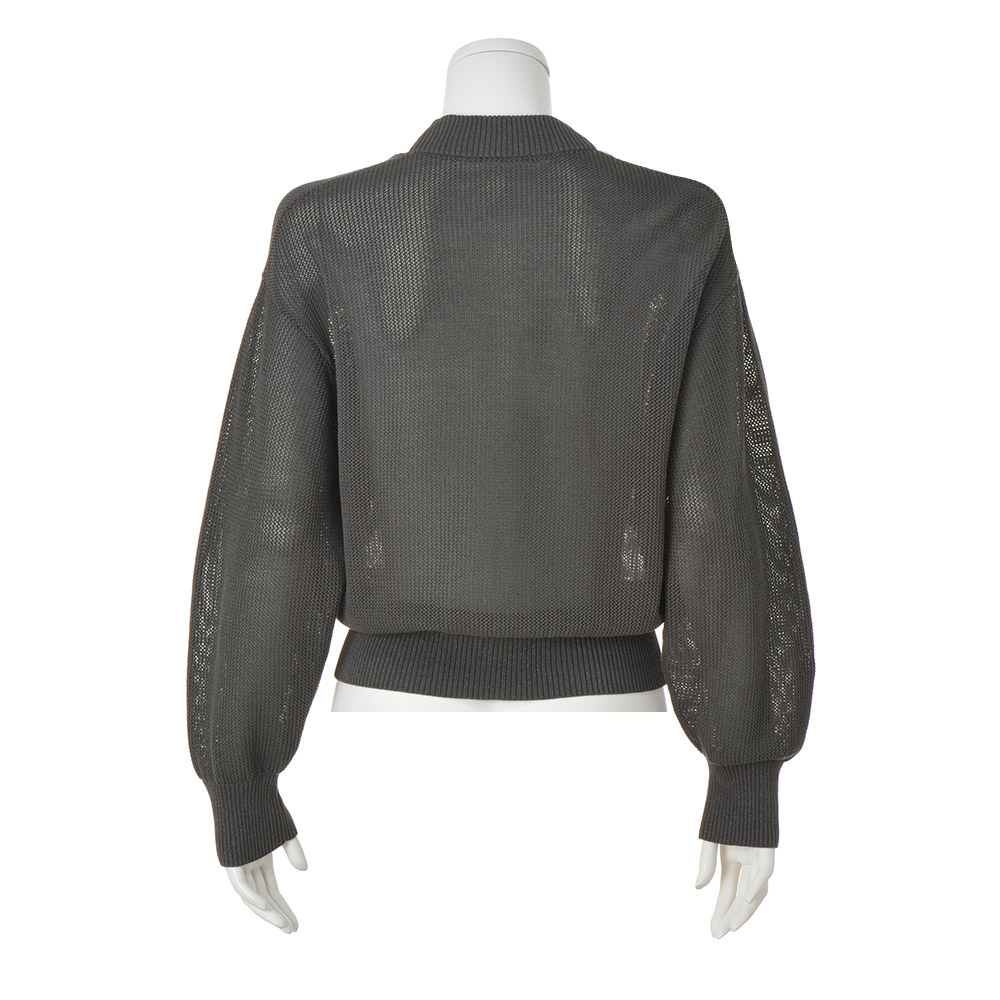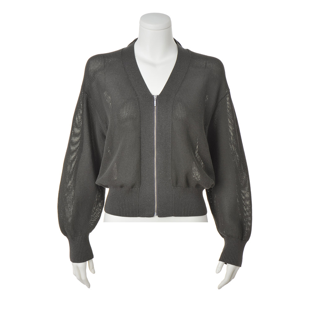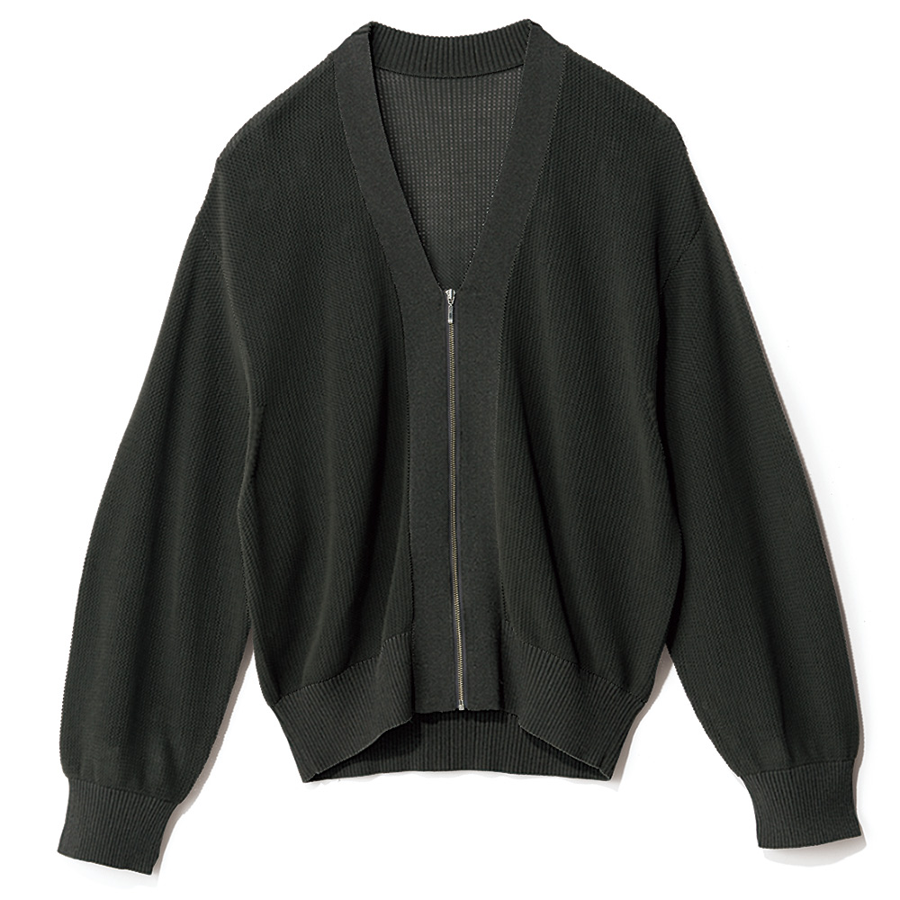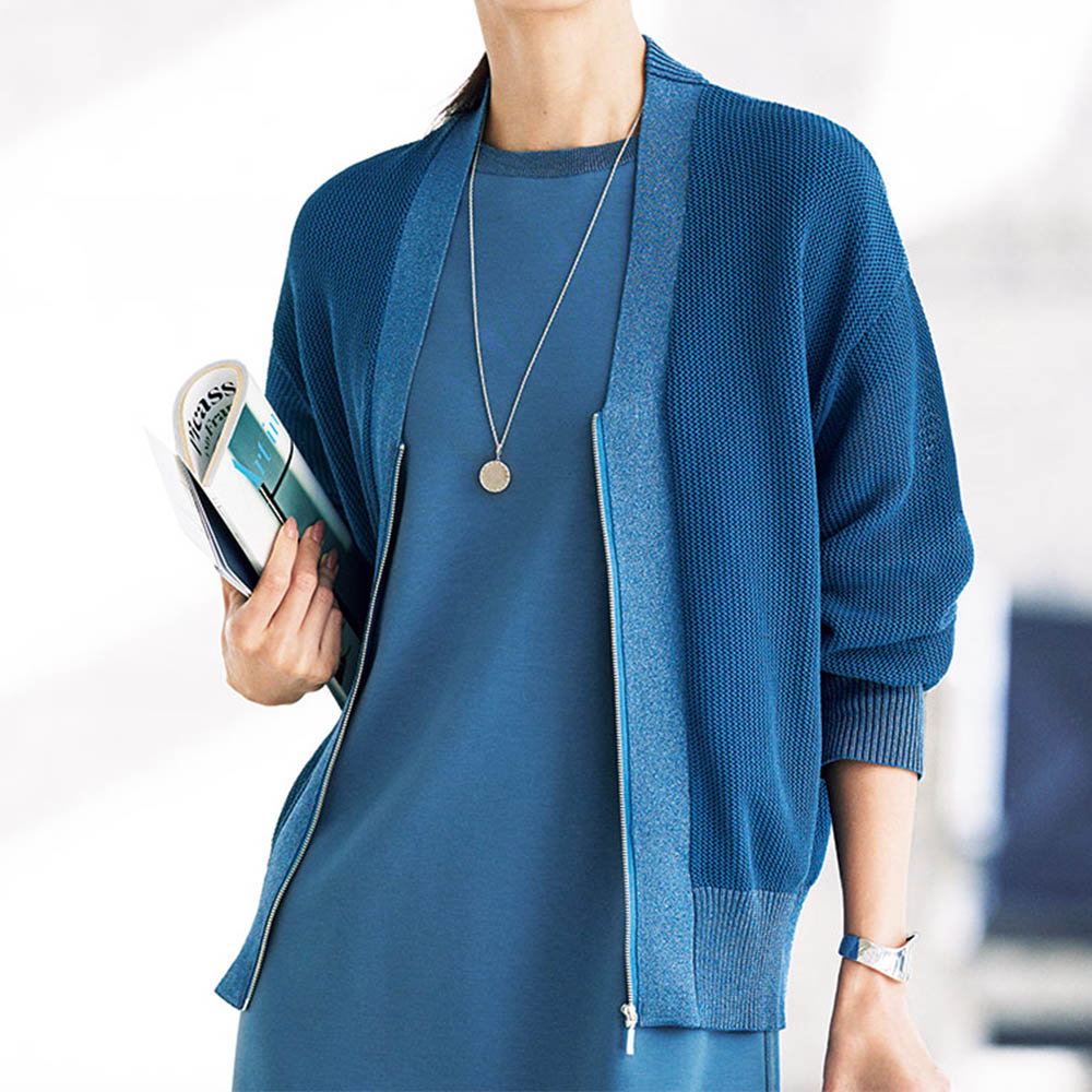 トレンドが薫る異素材のコンポジション旬のスポーティームードで、リラックス感のあるセットアップに新風を吹き込みました。涼し気なメッシュ編みのカーディガンは、前立てや裾、袖口にラメ糸を引き揃えたニットリブや総針テープを配して、繊細な輝きをトッピング。ドロップショルダーのゆったりしたフォルムを、深めのVネックとメタルファスナーの縦のラインで、洗練されたバランスで着こなせます。≫ POINTコットン混のさらっとした肌触りが魅力。スタイルアップするコンパクトな着丈です。