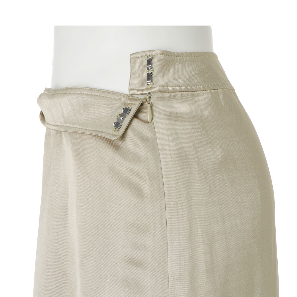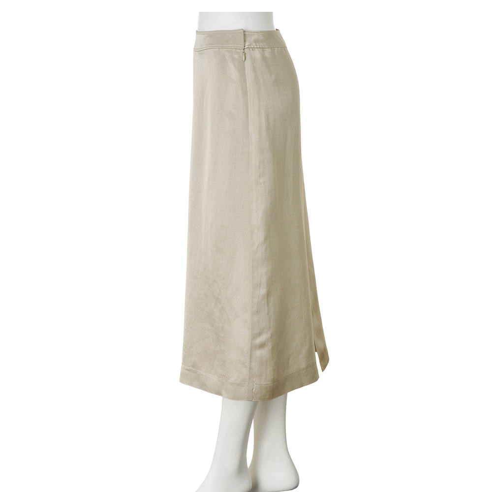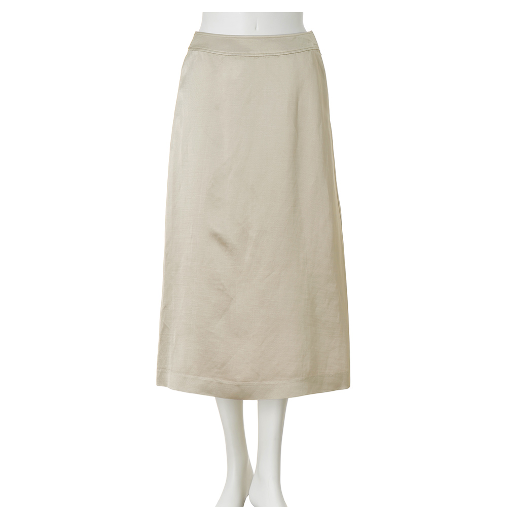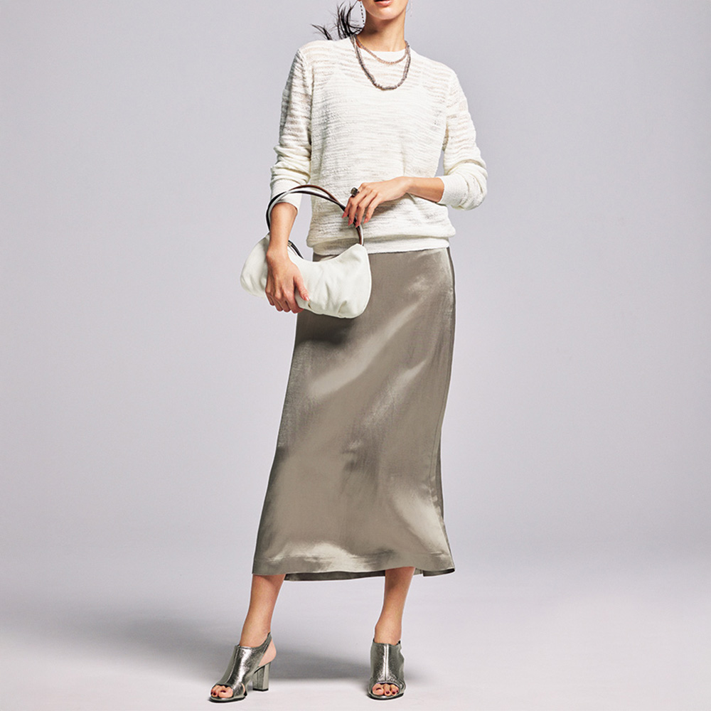 リッチな合わせ技で輝きを謳歌一点投入でワードローブがリフレッシュする、トレンド顔のシャイニースカート。アセテートに麻を絡めたカルゼ素材で、大人を魅了するリュクスな光沢感を叶えました。デザインは汎用性の高いセミタイト。コクのあるグレージュが深みを添えて、落ち着いた輝きを演出します。≫ POINT腰沿いのいいカーブベルトはタックインもきれい。麻特有のナチュラルなシワ感がカルゼ素材の上品な光沢感を柔らかく引き立てます。