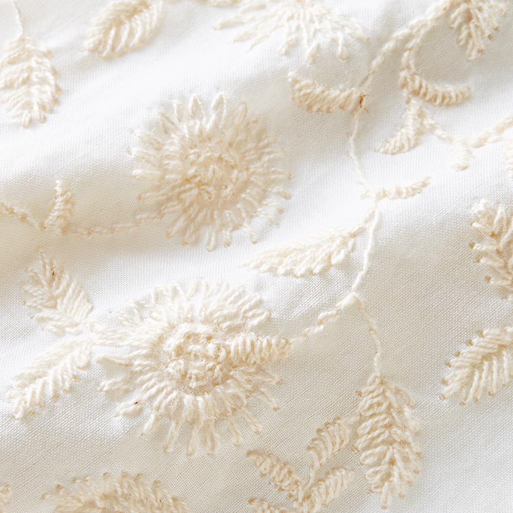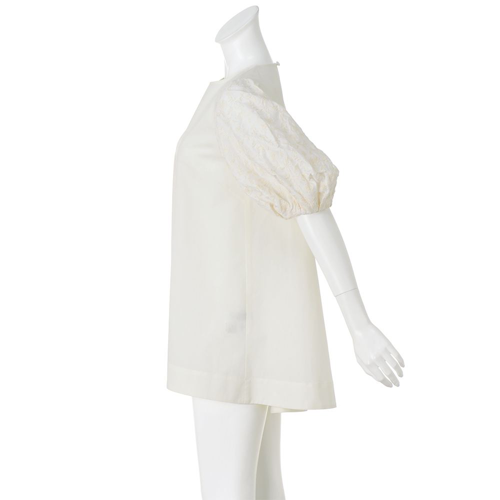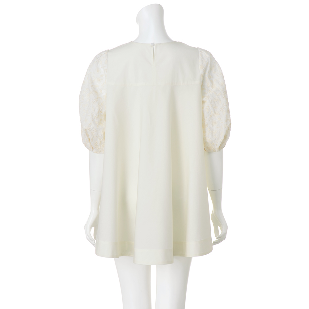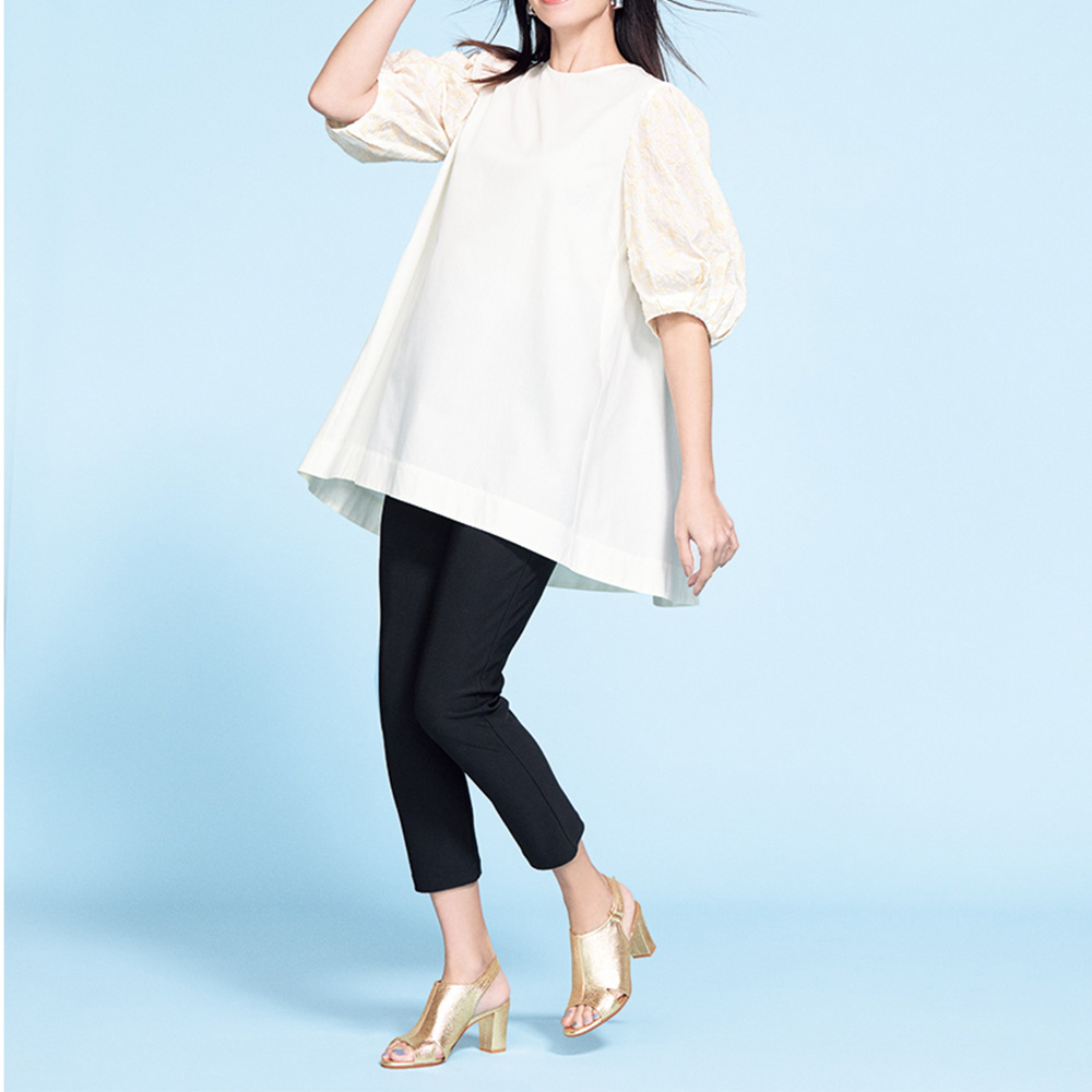 爽やかな風が吹き抜ける、美麗なチュニック華やかなデザイン、清涼感あふれる素材のチュニックで、理想の装いを始めたい。花が舞う愛らしいスリーブと流麗なシルエットに魅せられて動きに合わせてひらりと泳ぐシルエット、何気ない仕草さえ優雅に見せてくれるチュニックがお目見え。身頃は、自然なシワ感が残るソフトな風合いのブロード生地。パフスリーブは、太番手の綿糸で立体的なボタニカル刺しゅうを施したコットンローン。異素材のコントラストに上質な遊び心を忍ばせつつ、前後でシルエットが異なるのもポイント。前身頃は胸元にダーツを入れたすっきりAライン、後ろ身頃はヨーク下から生地をバイアスに使い、ふわっと広がるフレアーラインに。ボリュームのあるパフスリーブは甘すぎないよう肩幅を狭くし華奢な印象を醸して。後ろ裾が長く、気になるヒップ周りを美しくカバーしてくれます。