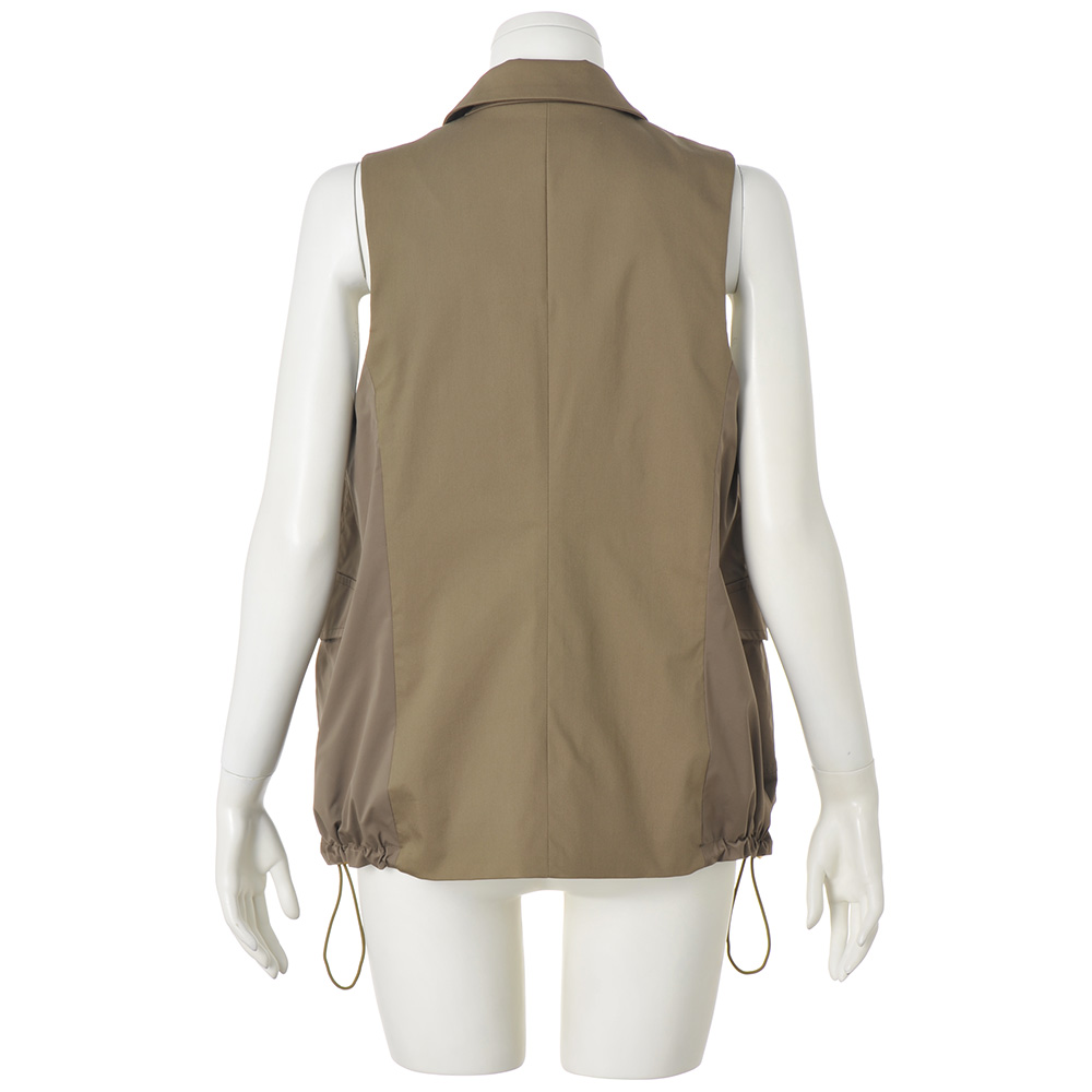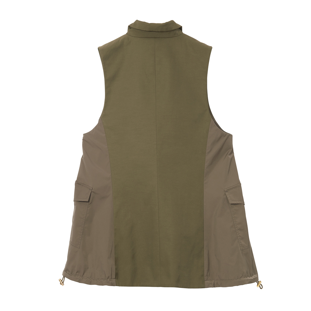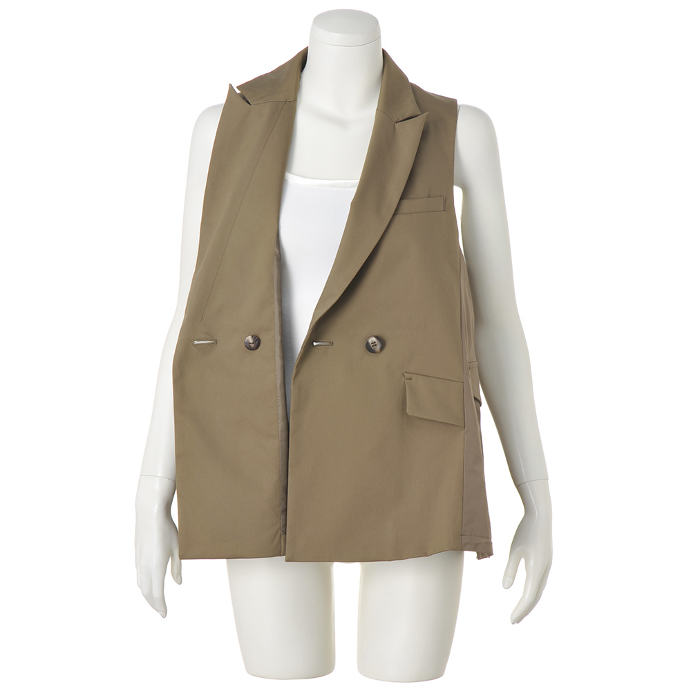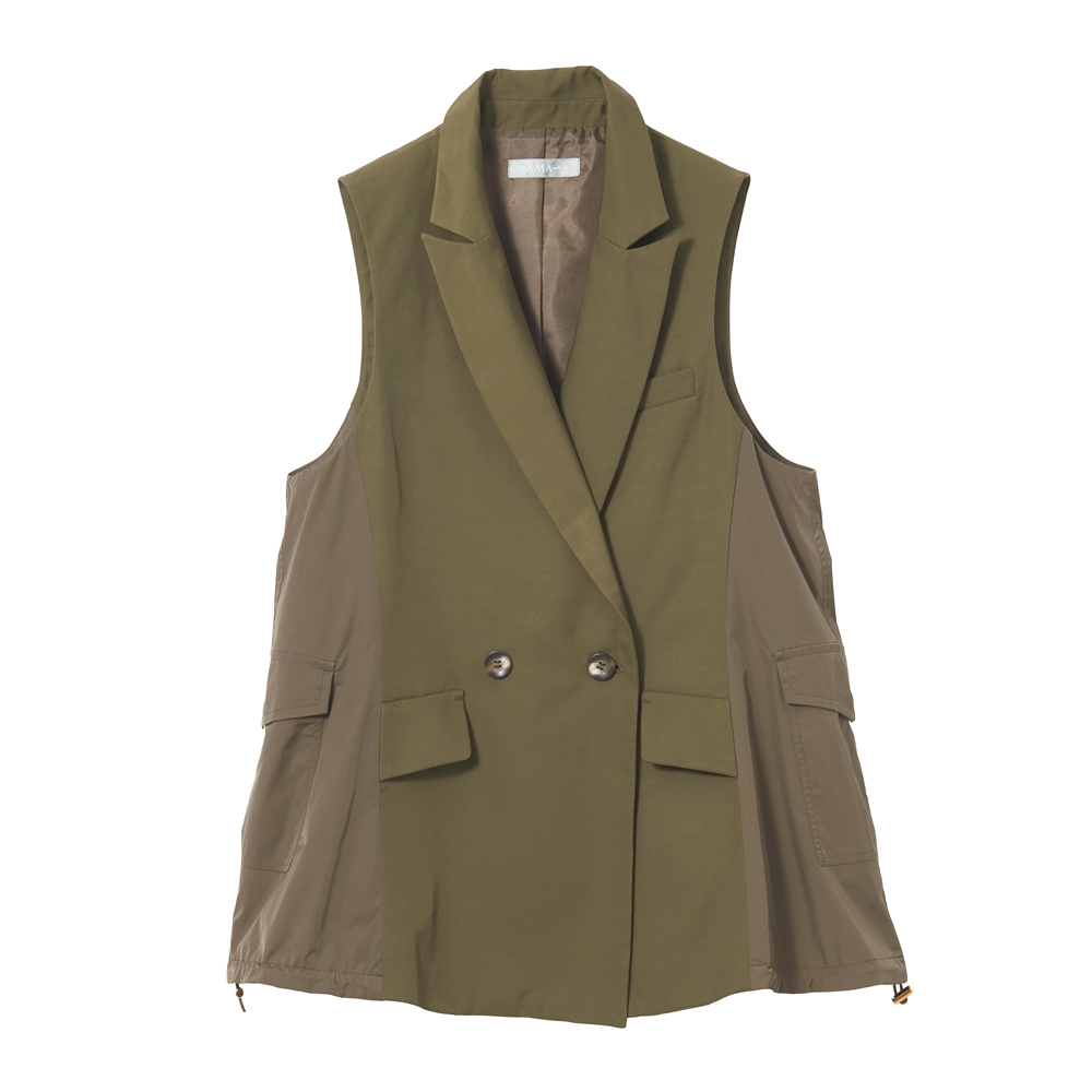 ひとクセありなジレでカジュアルをキレ味よく。休日にお洒落を楽しむためのジレなら、ちょっとモードな遊び心があっていい。正面はコットン混素材で仕立てた端正なテーラードカラー&ダブルフロント、両脇はカジュアルなタフタ素材で切り替えて大きなフラップポケットを利かせたミリタリー風。裾のサイドに入れたゴムヒモを絞ったふんわりまろやかなシルエットで、女性らしさも忘れずに。ヒップが隠れる丈感で、パンツやスカート、ワンピースとも好相性。≫ POINT異素材使い、トラッド×ミリタリーのテイストミックス、ゴムヒモによる脇のシルエットのアレンジで着映え度満点!