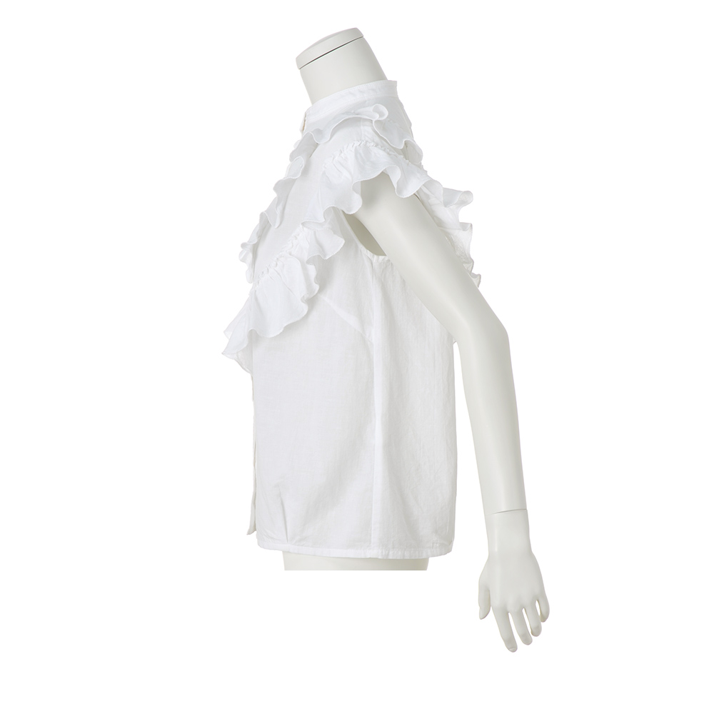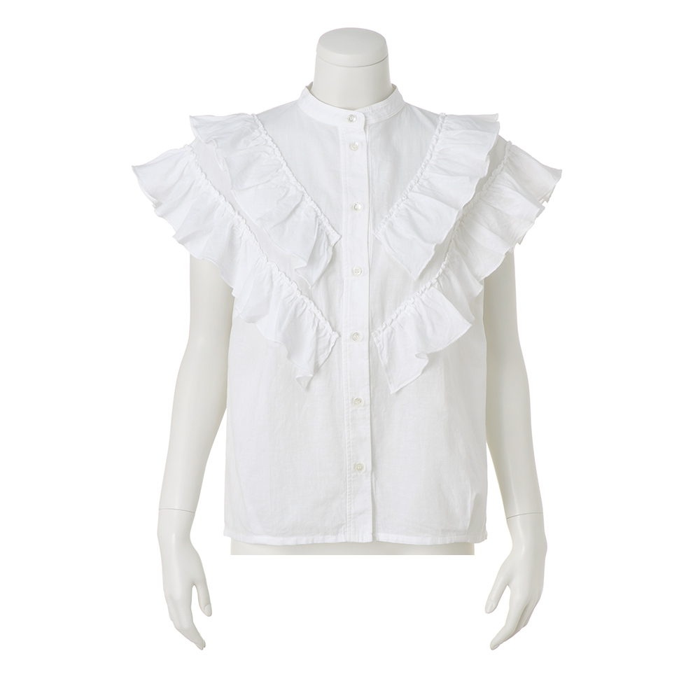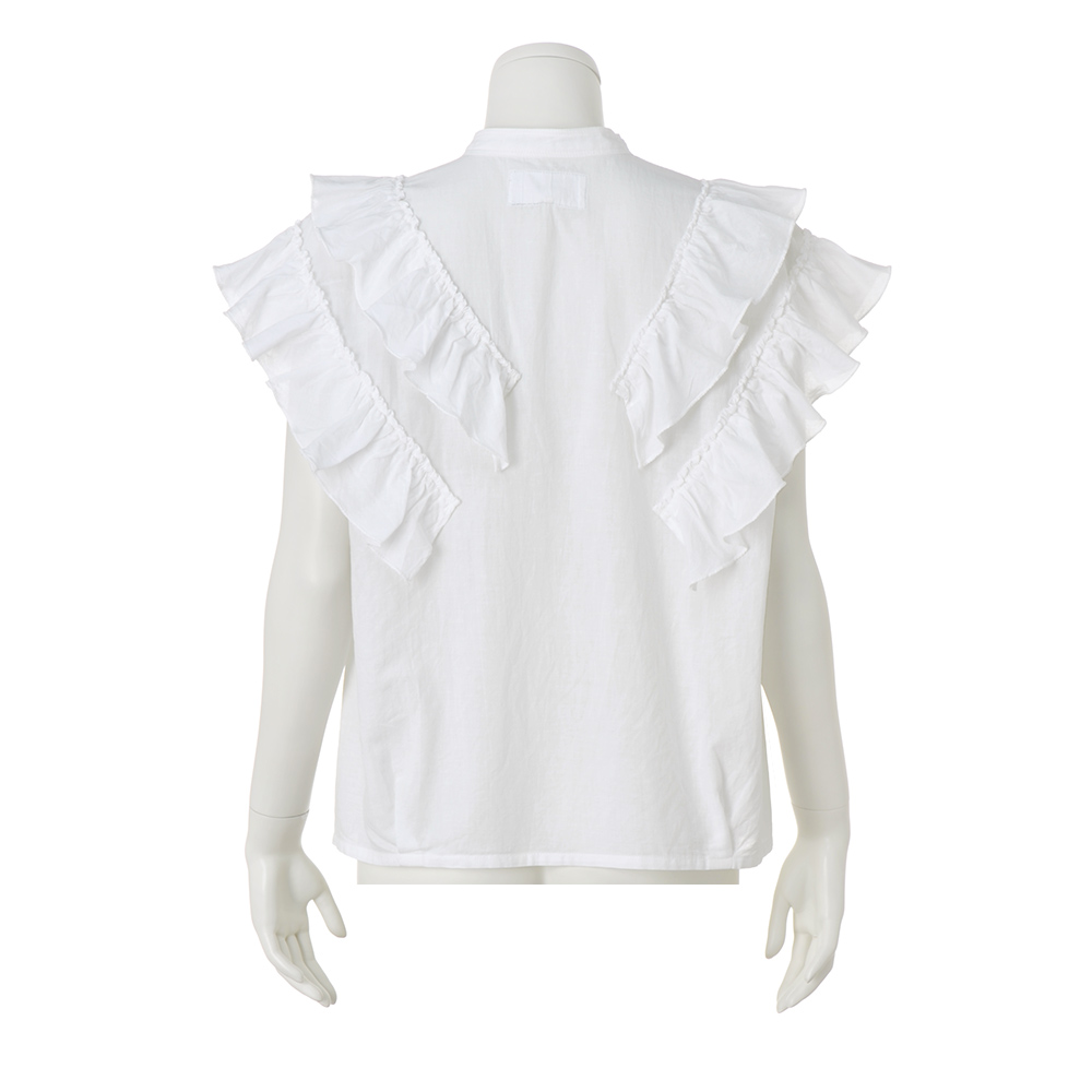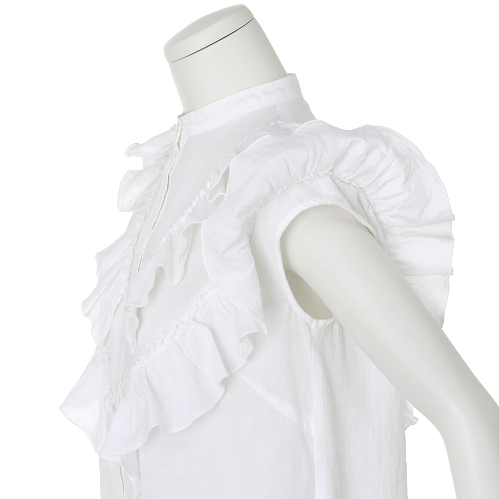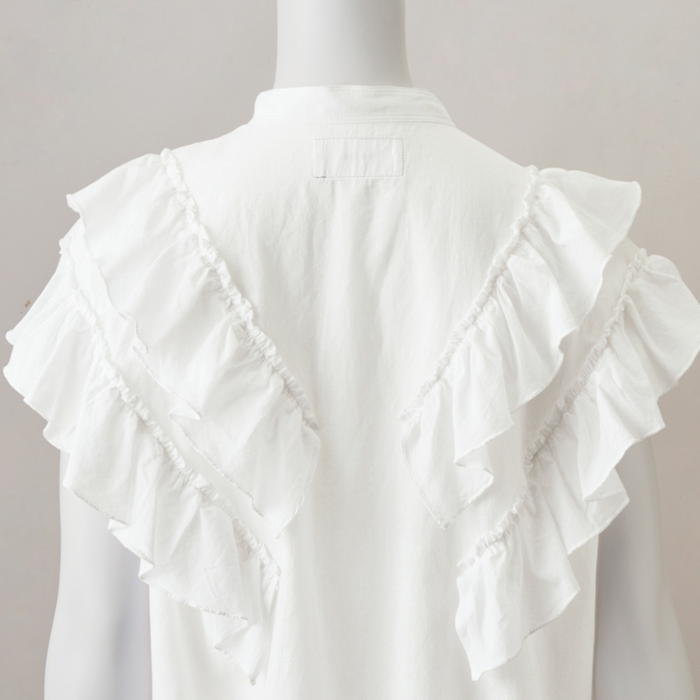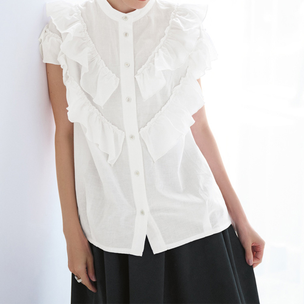 フリルが大人可愛い。ほめられブラウス。「いつまでも可愛い女性でいたい…」、そんな願いを叶えてくれる2段フリルのブラウス。大人の甘さに昇華するため、生地は洗いをかけた表情とオフホワイトの色みがナチュラルなコットンリネン、フリルは細見え効果を狙ったVラインに。腰まわりに沿うよう裾に入れたタックも、あるとないとではスッキリとした印象が大違い。ボリュームを重く見せないフリルで二の腕が美しくカバーされて。≫ POINT・洗いをかけた肌なじみのよさ、後ろネックのタグを留めたシルバーステッチに「TEEE」らしさが光ります。・前立てから肩、背中にかけてあしらわれた2段フリルで、360度可愛く。コットンの柔らかさとリネンのシャリ感を併せ持った肌触りも魅力。