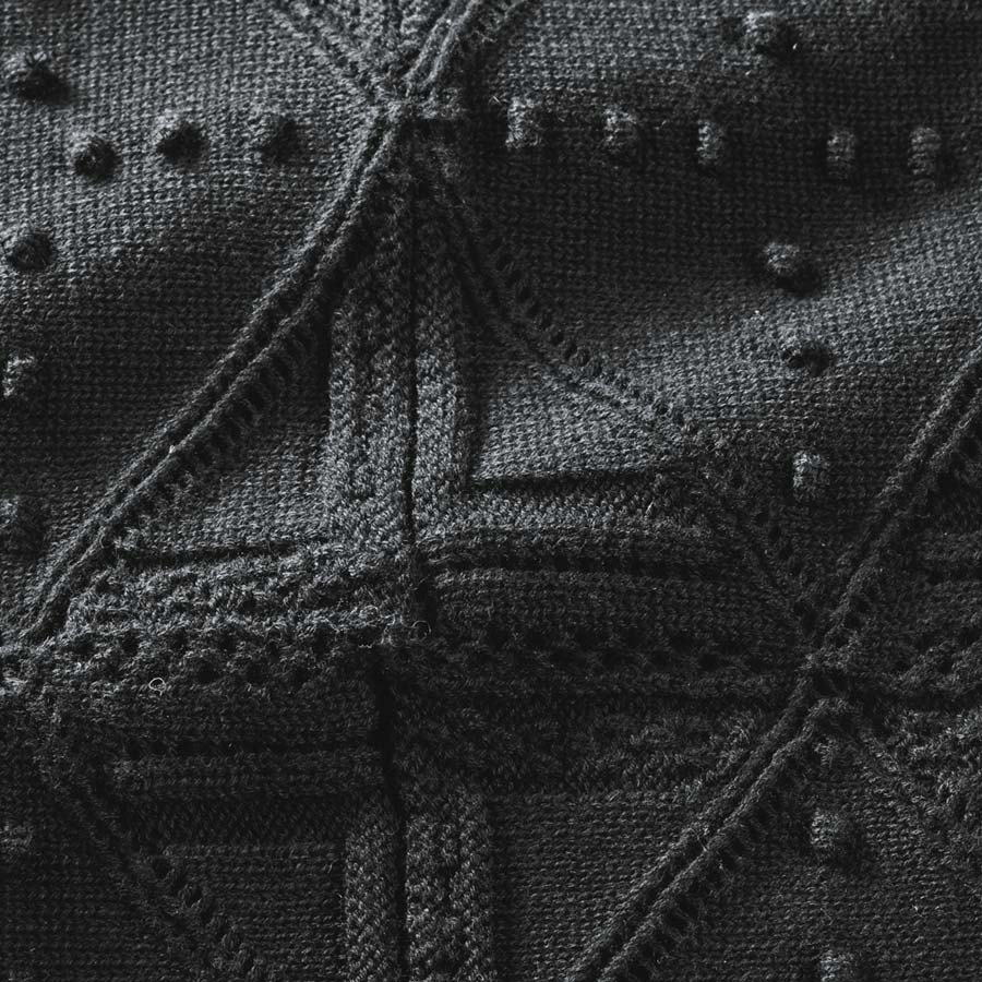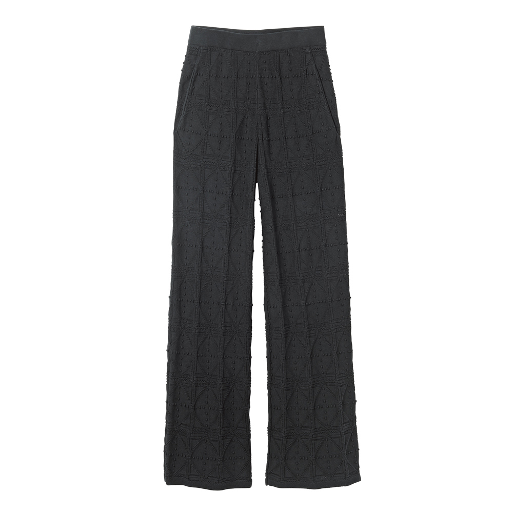 ラクしてフェミニンなパンツスタイル。幾何学柄の立体的な編み柄が身体のラインを目立たせず、色は視覚的に引き締まる黒。肉感を拾いやすいと敬遠しがちなニットパンツも、これならトライしやすいはず。糸はドライタッチな強撚コットン。ニットの伸びやかさを邪魔しない、編み地タイプの裏地付きです。≫ POINTポコポコとしたドット、ダイヤ形、ハシゴレース風など、凝った幾何学柄編みが大人好み。ウエストゴムのプルオンタイプ、ポケット付きなのも便利。
