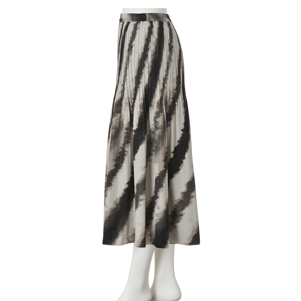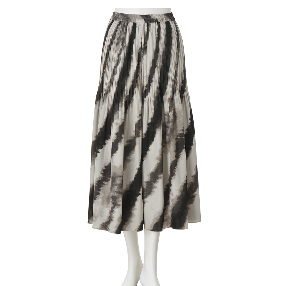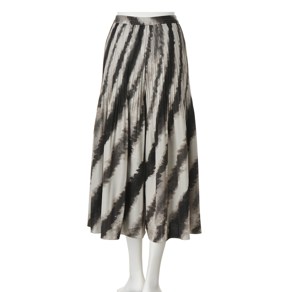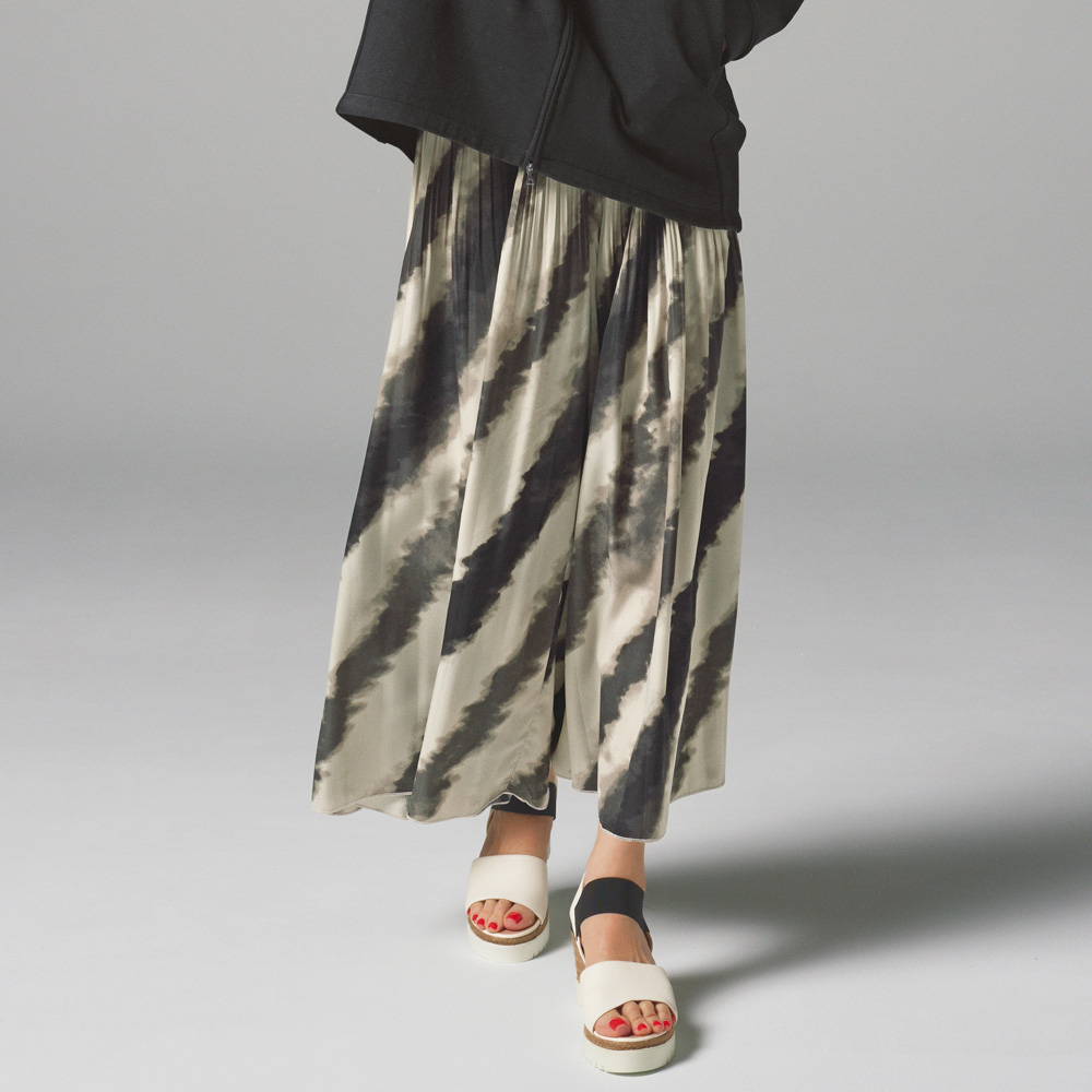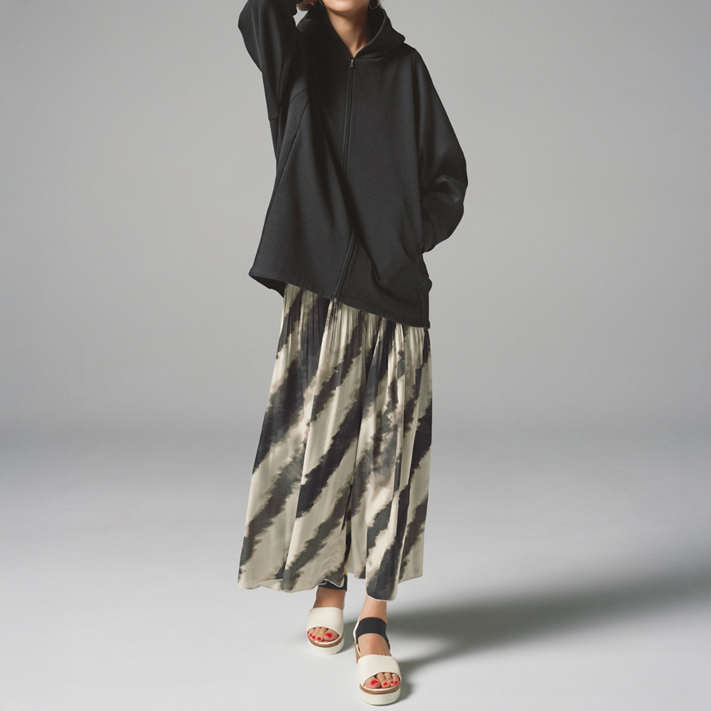 ボリュームアイテムこそ工夫と技術ですっきりとデザインポイントの裾に向かって消えるように施されたプリーツ加工とフレアシルエットは、個性的な柄を適度に崩し、着こなしやすくする効果も。少し長めに設定したレングスもポイントです。≫ POINTウエストは総ゴム仕様でラクチンなプルオンタイプ。気になる腰からウエストはプリーツでボリュームを抑え、裾はエレガントに揺れるフレアに。