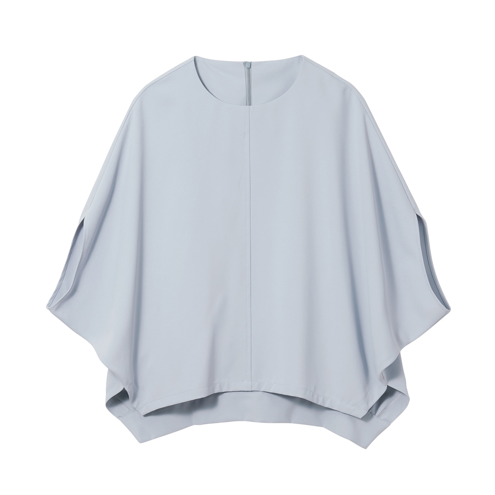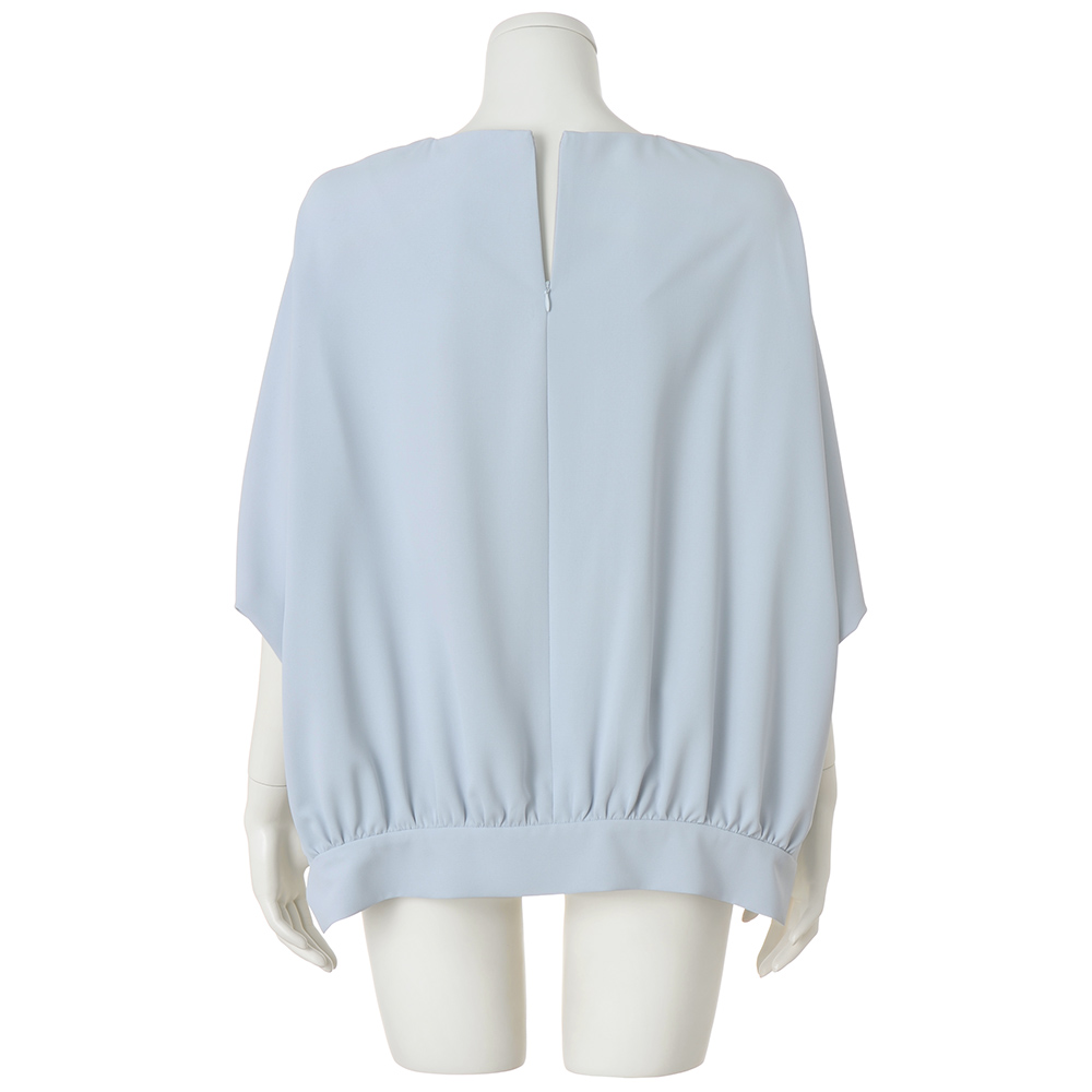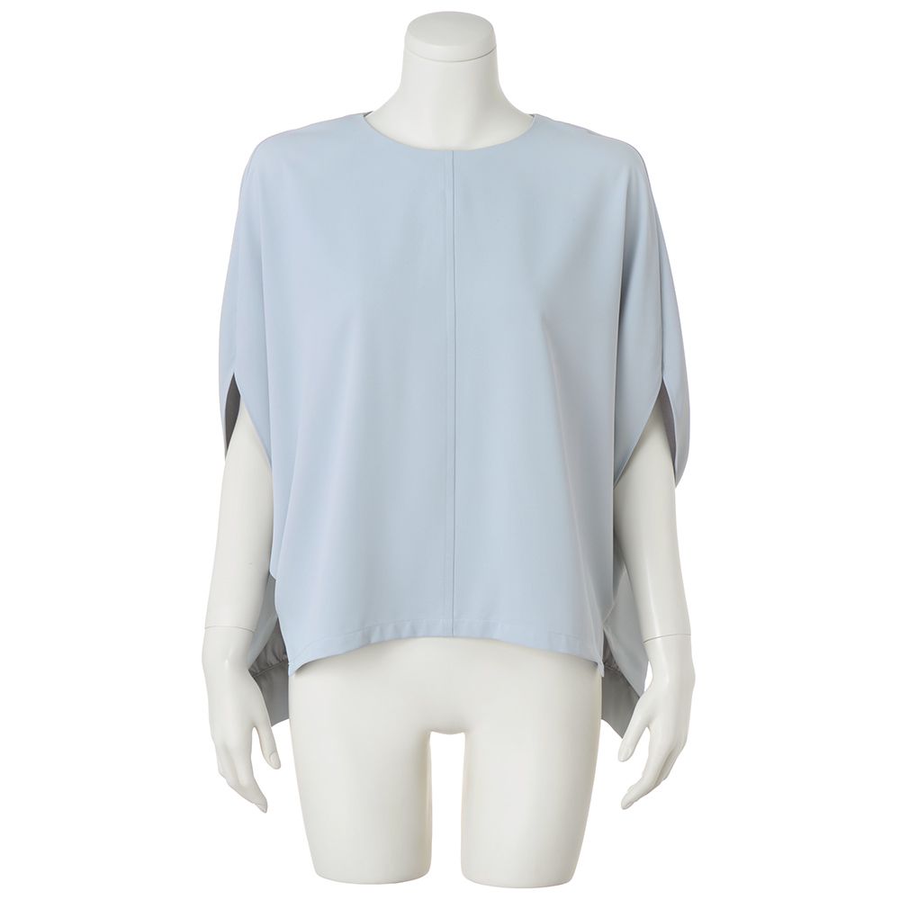 ジョーゼット生地のサラサラの肌触り、風が通り抜けるフォルム。ポンチョ風のゆったりとしたシルエットを、前裾はフラットですっきり、やや長めの後ろ裾は切り替えとギャザーでふんわりと。≫ POINTポンチョを羽織っているような、ユニークな横長フォルム。裾の前後差とスリットで、アウトでも前だけインでもバランスよく着こなせます。