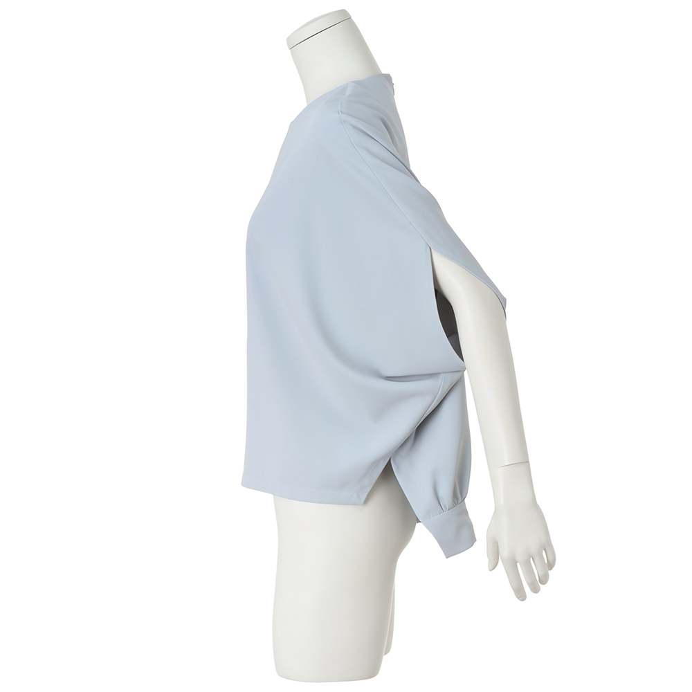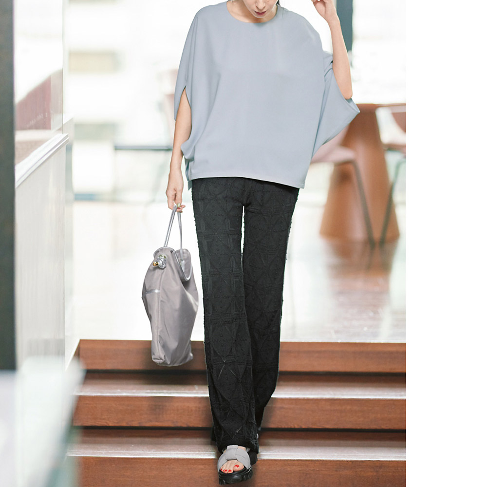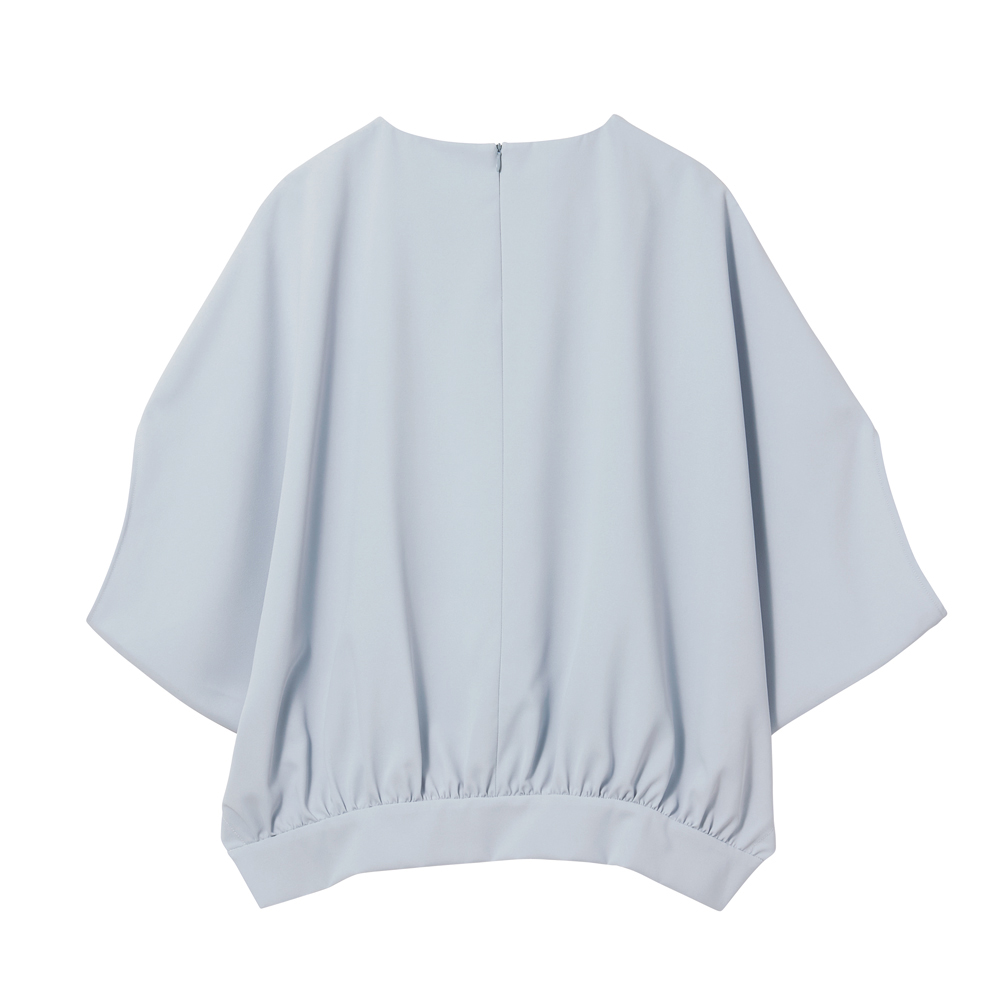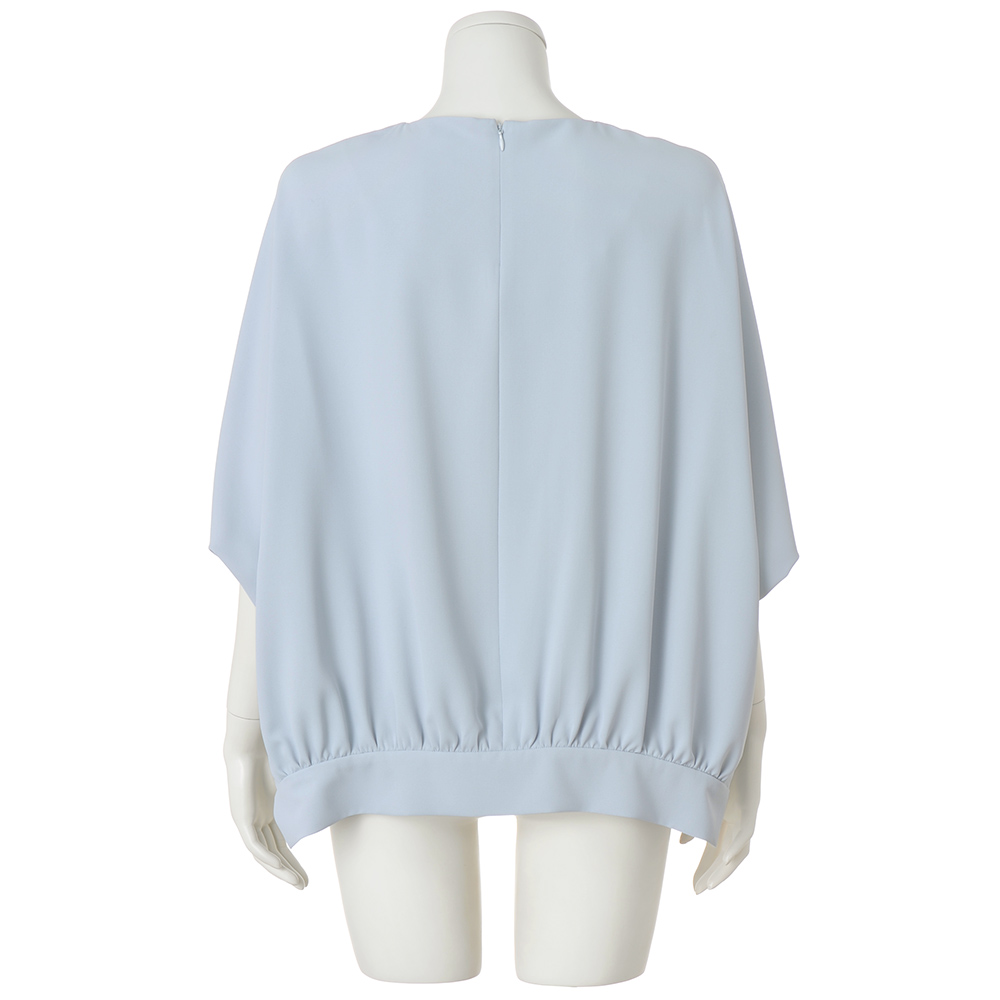 ジョーゼット生地のサラサラの肌触り、風が通り抜けるフォルム。ポンチョ風のゆったりとしたシルエットを、前裾はフラットですっきり、やや長めの後ろ裾は切り替えとギャザーでふんわりと。≫ POINTポンチョを羽織っているような、ユニークな横長フォルム。裾の前後差とスリットで、アウトでも前だけインでもバランスよく着こなせます。