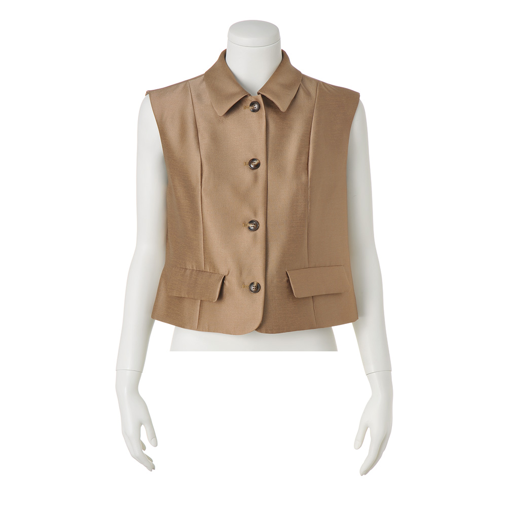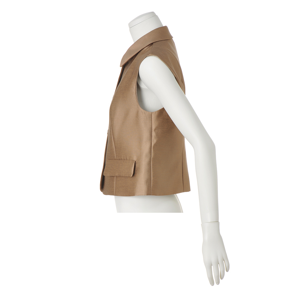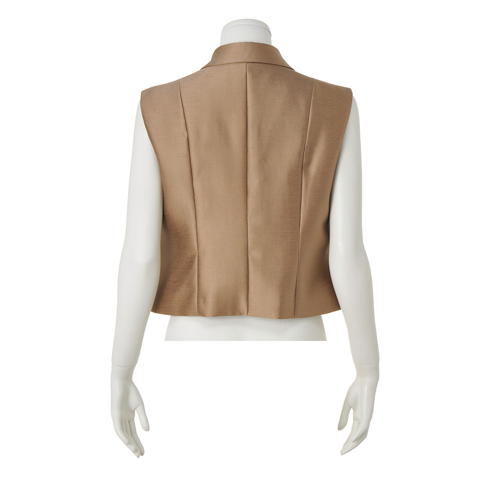 クラシック×カジュアルが新鮮で素敵程よくシェイプされたラインとフレアのふくらみで女性らしさが際立つクラシカルな服。それをカジュアルなアイテムと組み合わせるスタイルが、新鮮に映ります。クラシックで上質なマテリアルにも注目して。モカブラウンな大人のシャイニーシックな色味で、クラス感のあるシャイニー素材が今の気分。短めのジレはプリンセスライン&後ろに縦ラインありで、スタイルがよく見えるのも魅力。一枚でブラウスのようにも着られます。スカート(商品番号PC7187)とセットアップで着ると何段にも重なったように見えて、よりクラシカルかつエレガントに。
