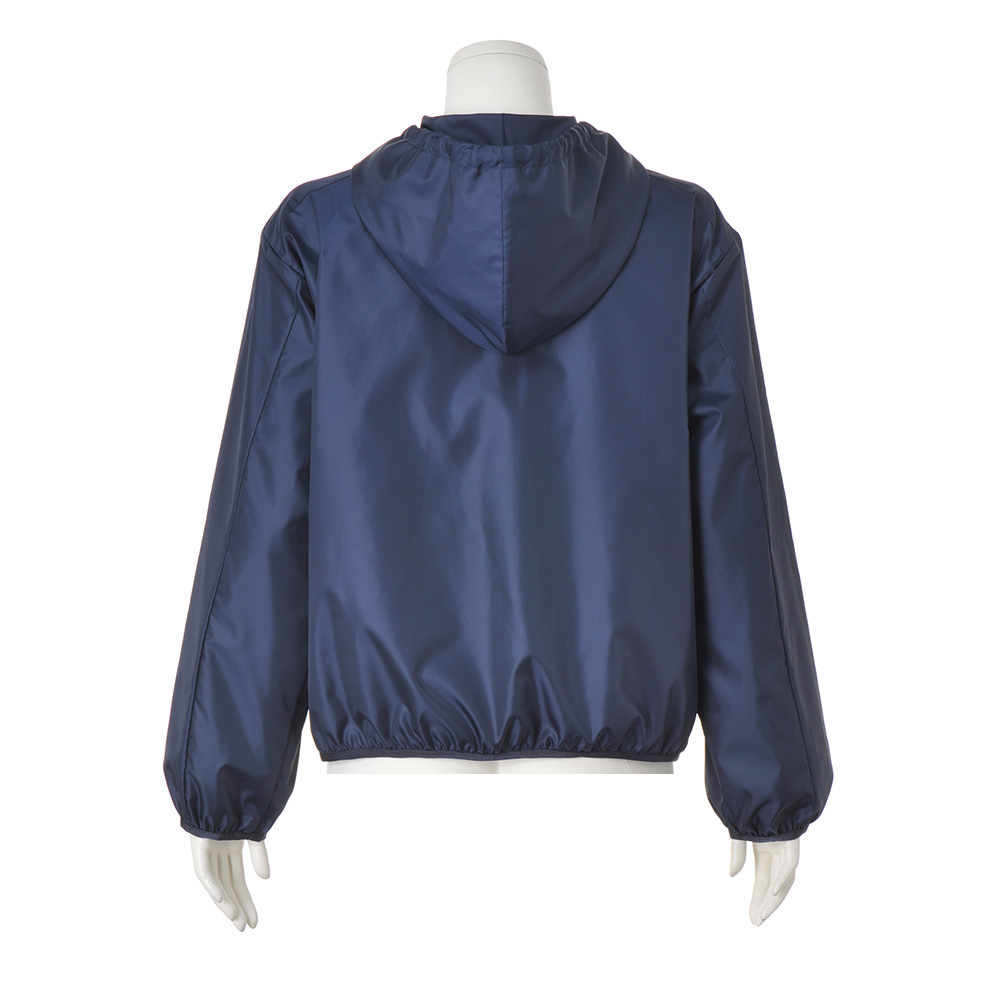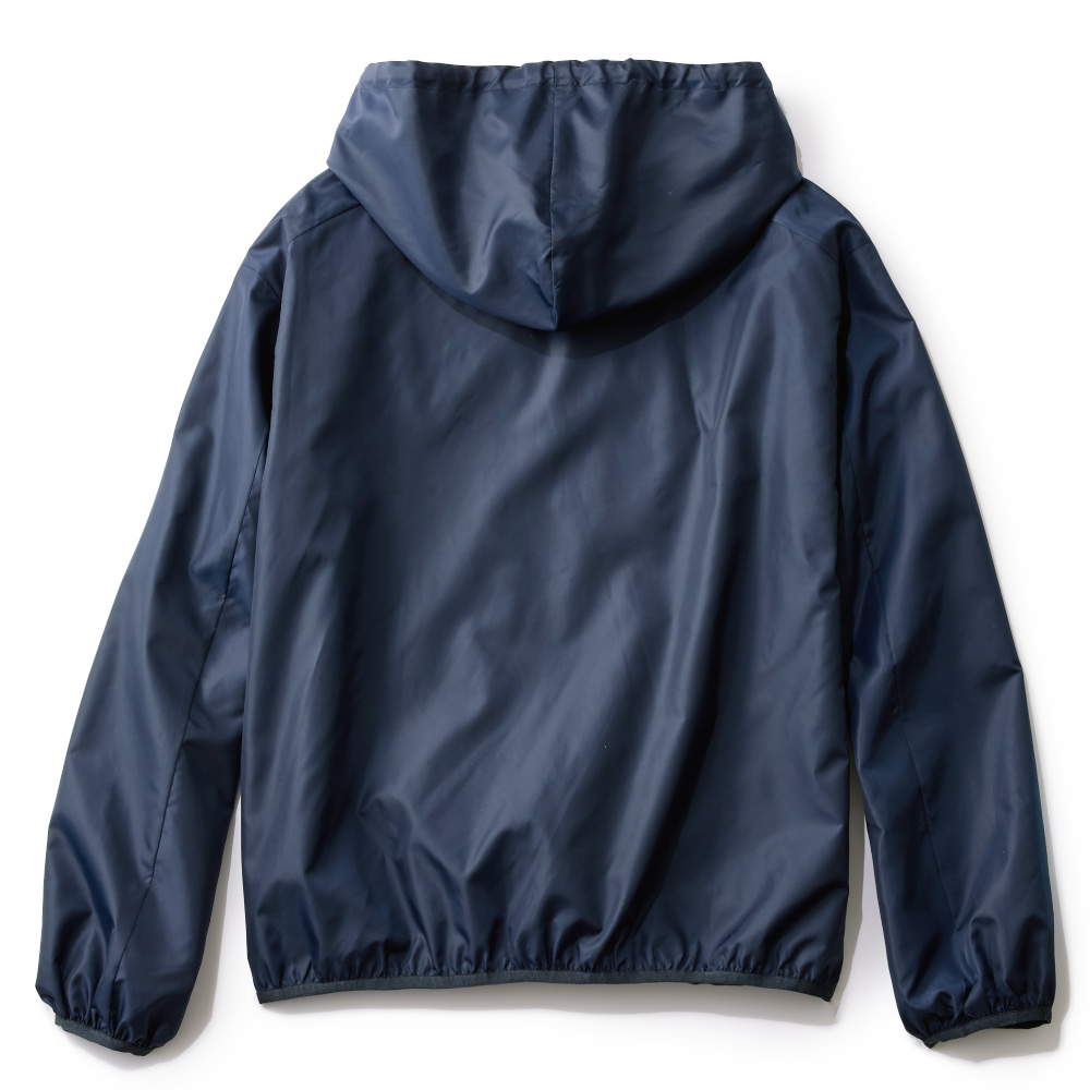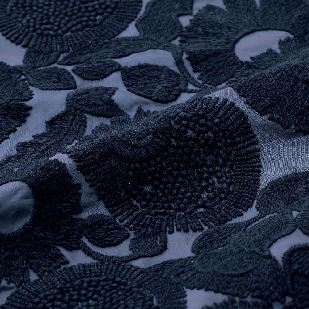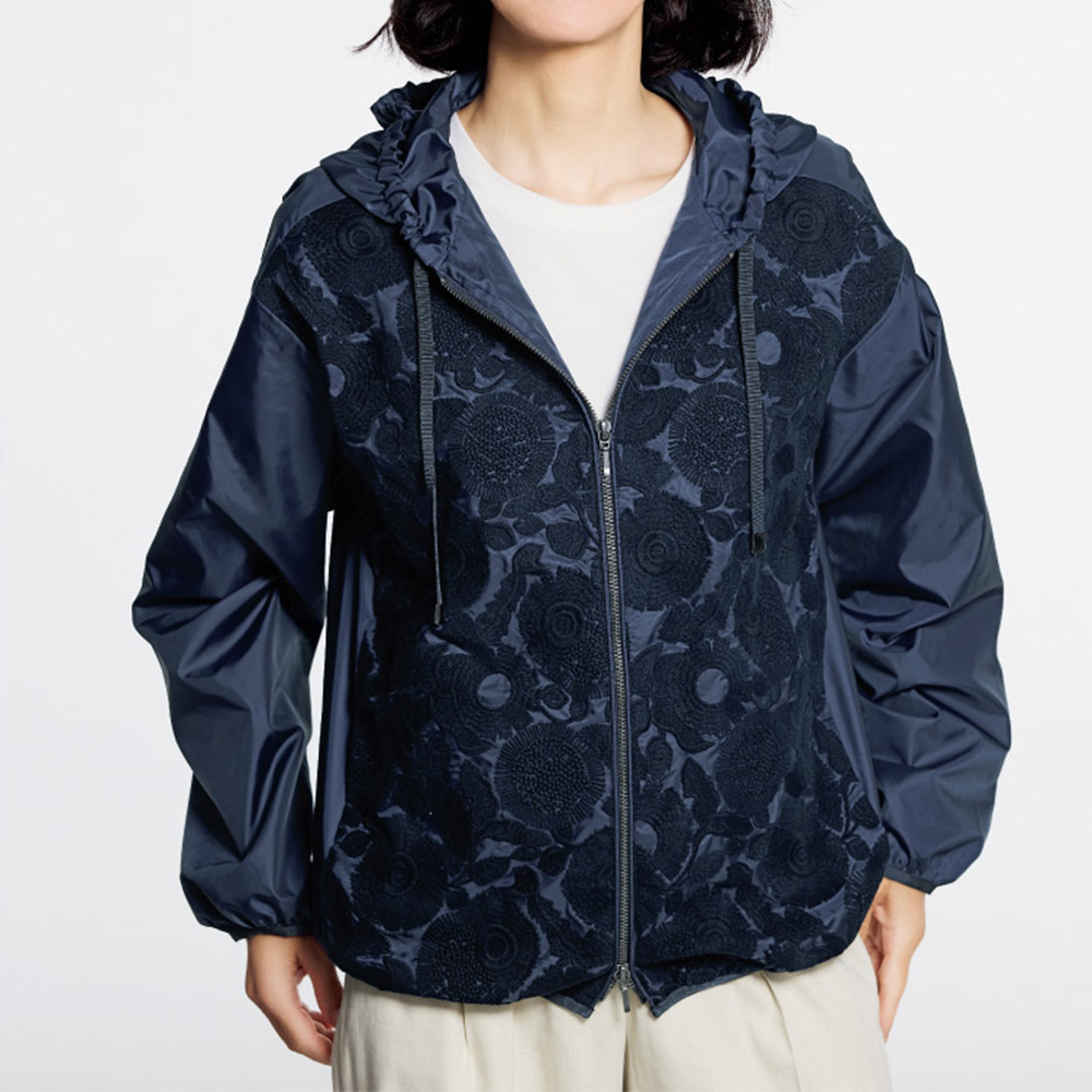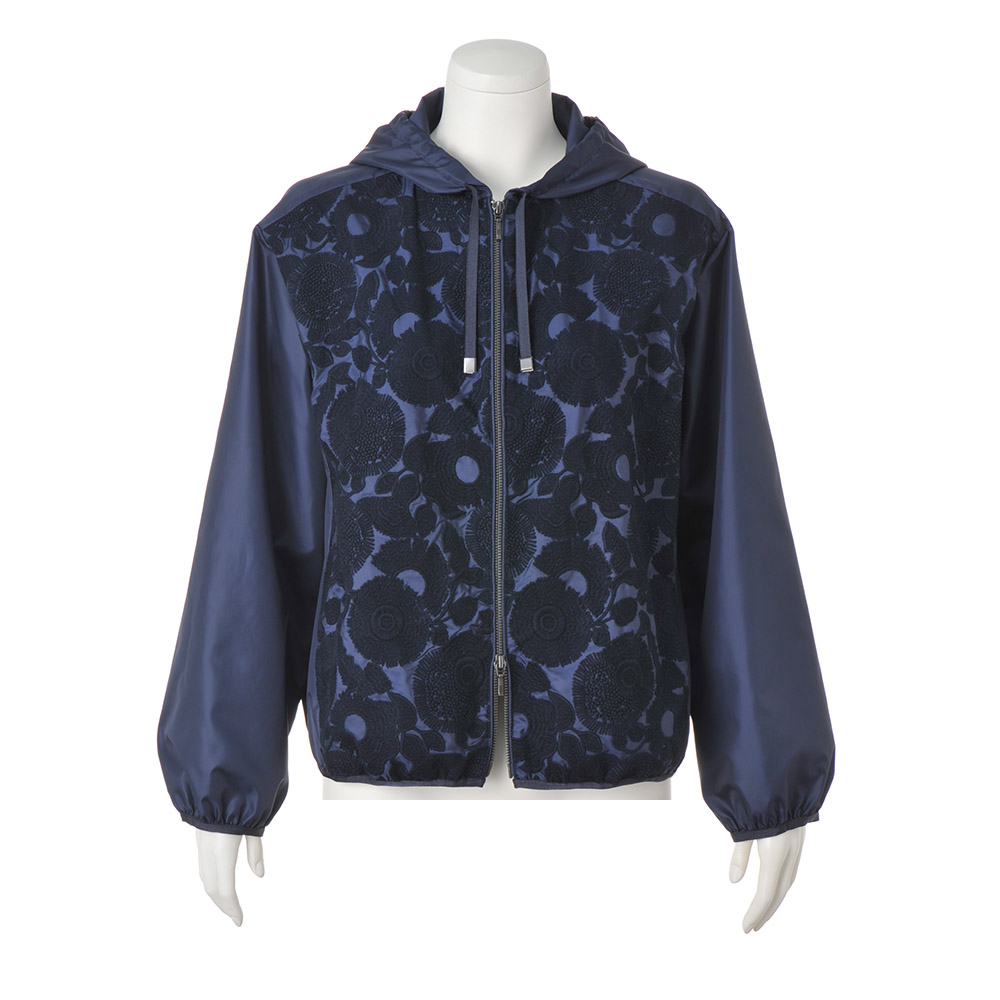 繊細な女性美、華やかさを纏う。ベースのタフタは紺、フロントのオリジナル刺しゅうは濃紺で陰影豊かに。ストレッチテープ入りの裾と袖口のパイピングはそのままに、肩や胸回りにゆとりを持たせることで、全体的に丸みのある旬のフォルムに仕立てました。肩に無地を効かせたメリハリ感、フード口の紐など細部にも拘って。バランス良く開閉できるダブルファスナー、薄手タフタの丁寧な二重仕立ても美しい。