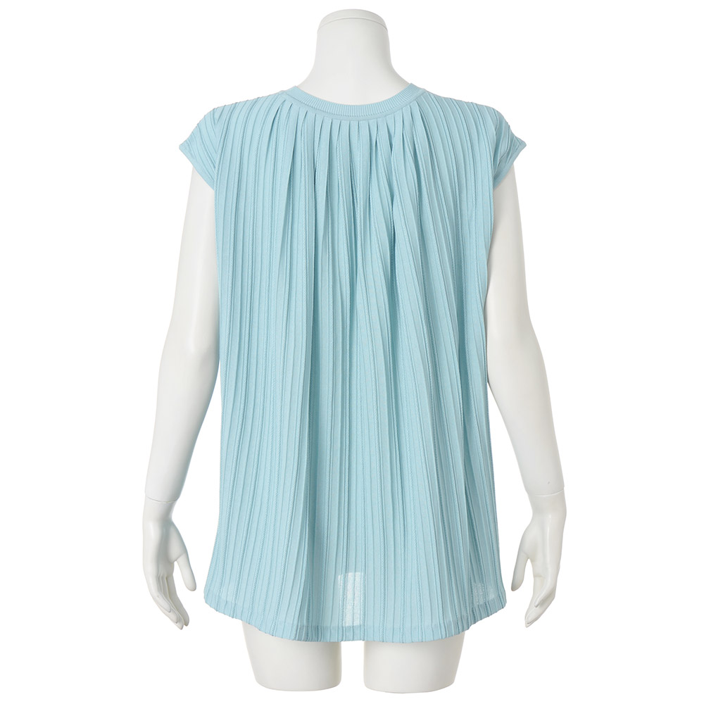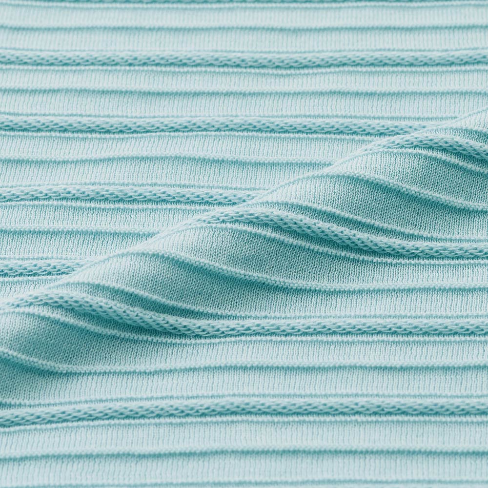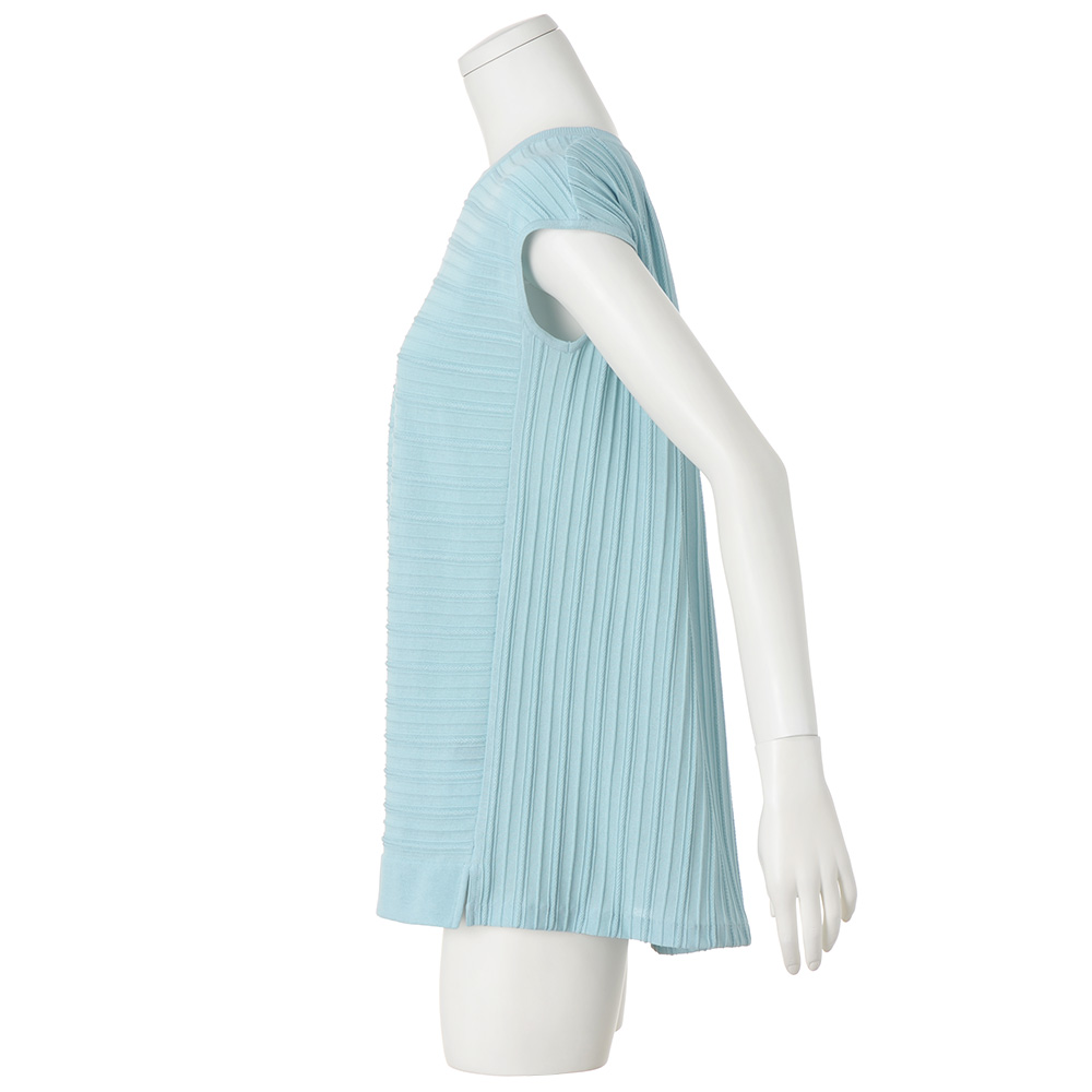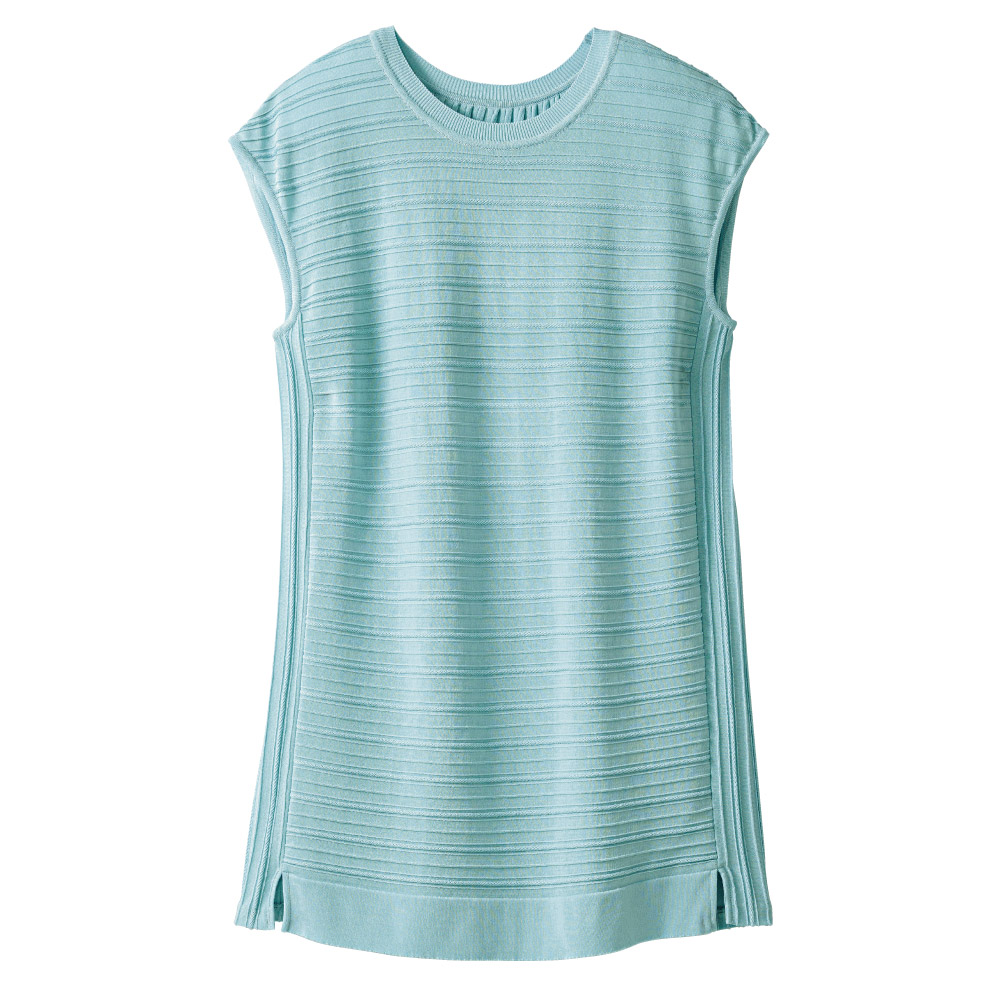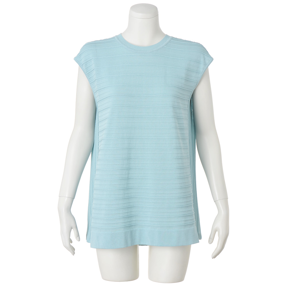 軽やかに涼しさを纏う。編み地は天竺編み×スレッド編み×ガーター編みを組み合わせた、凹凸のあるライン柄。前身頃はボーダー、後ろはストライプになるよう横地使いにしつつ、後ろ襟ぐりにタックを畳み、前後でがらりと表情を変えるニットチュニックに。脇線を前に寄せることで、両サイドが引き締まって見える効果も加味。毛羽立ちを抑えたコンパクトコットン混糸のクリアな目面と光沢感、ドライタッチも嬉しい。