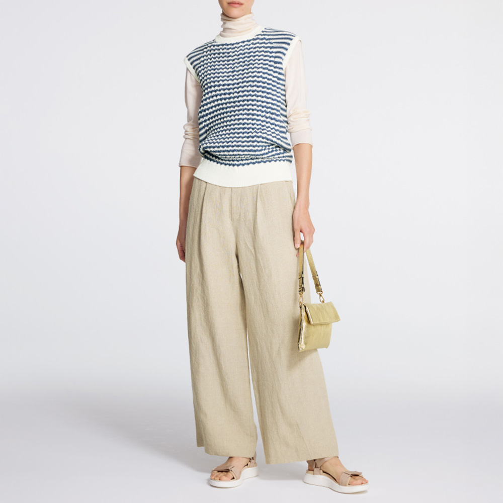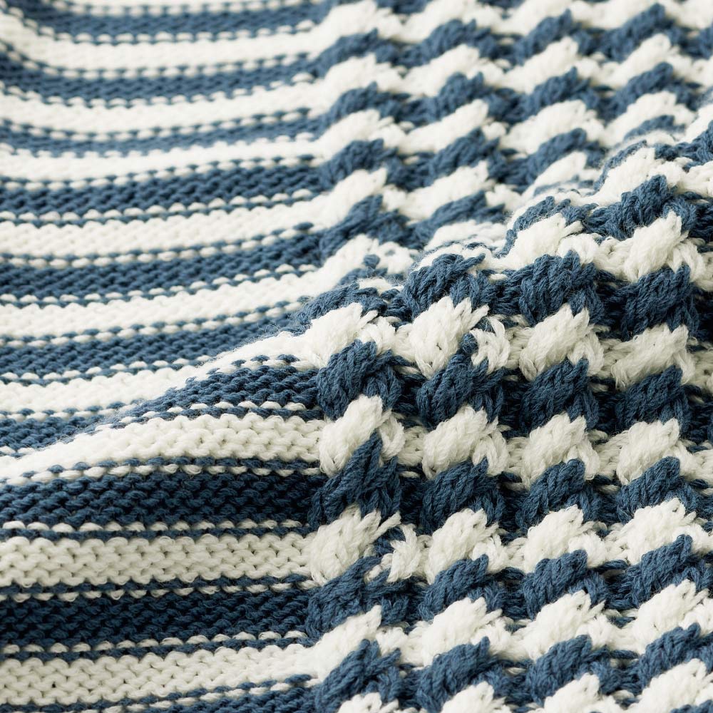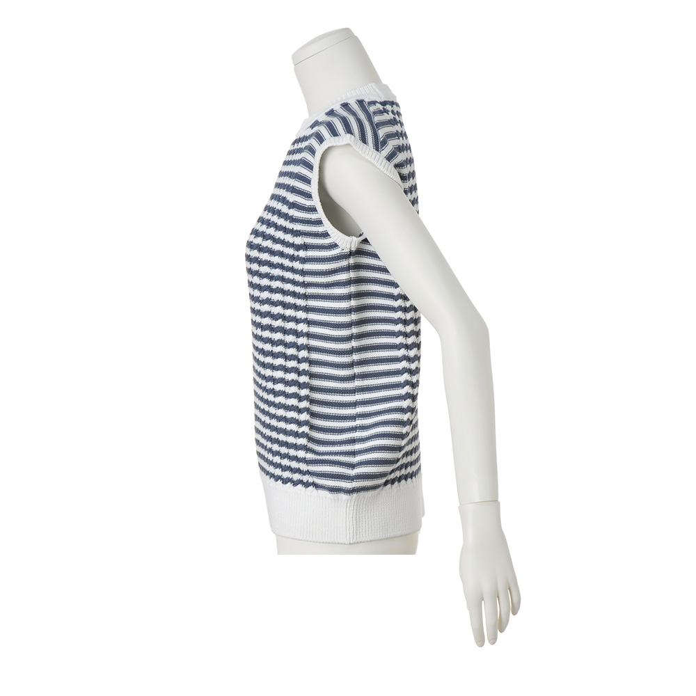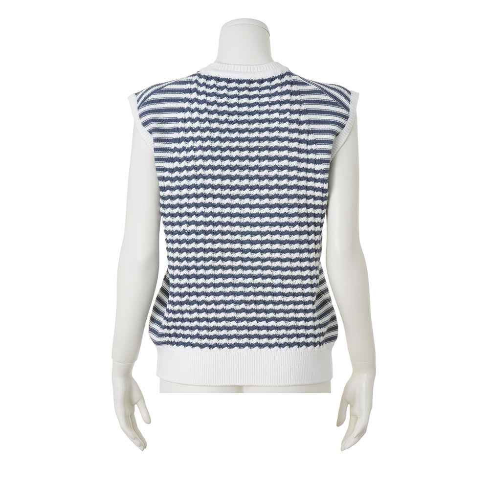 リアルクローズのチャーミングな個性は、レイヤードが決め手!着こなしがシンプルになる季節に頼りになるのが、一枚でもレイヤードでも活躍するワイドショルダーのニットベスト。さらりとしたポリエステルコットン糸でスモーキーブルー×白の爽やかなボーダー柄を表現。身頃中央はケーブル編み、脇から肩にかけては天竺裏目、と計算された編み地切り替えで、リッチ感とすっきり感を両立させています。
