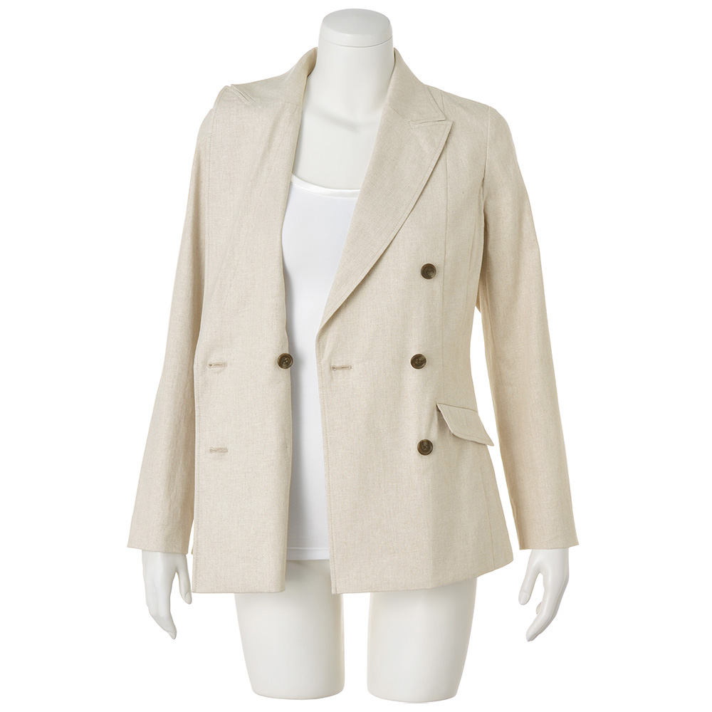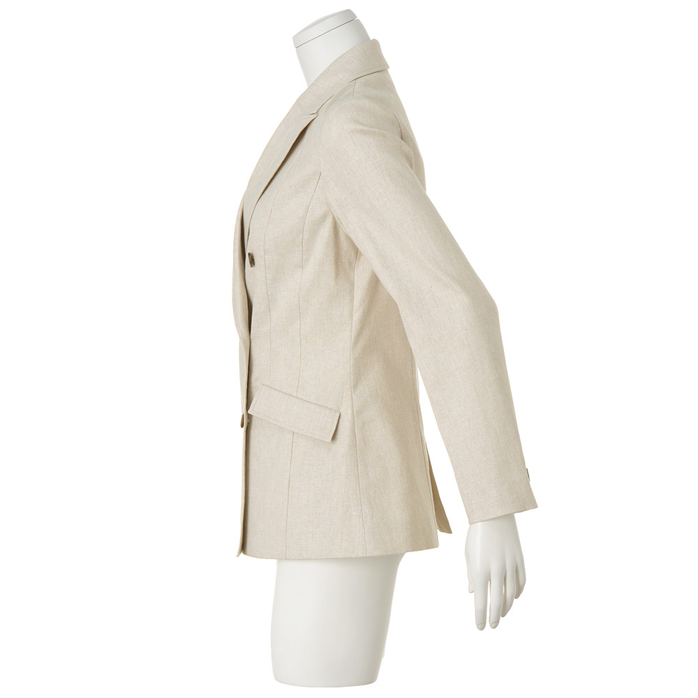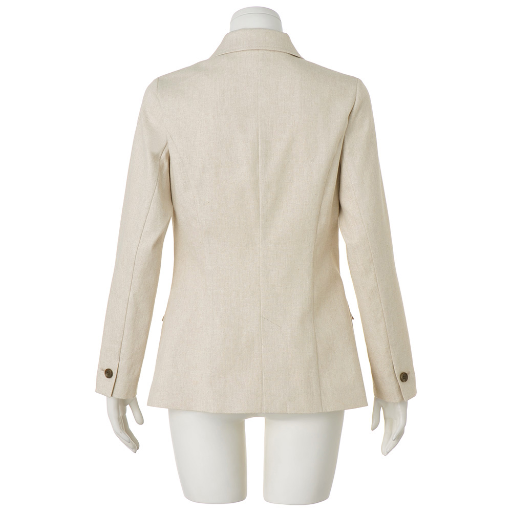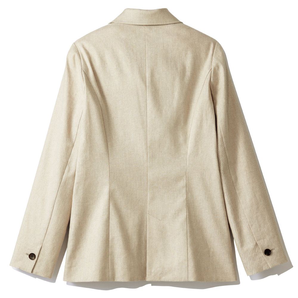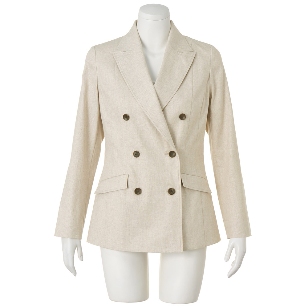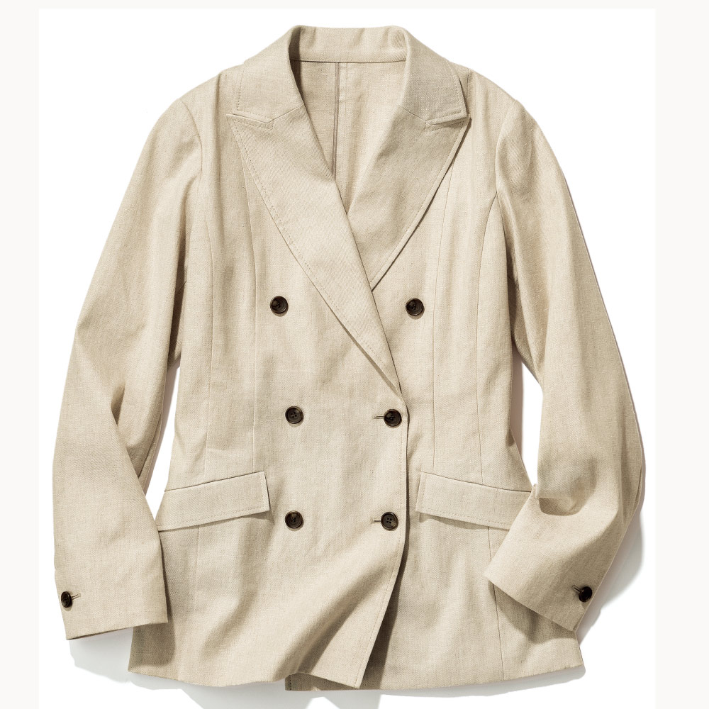 端正さとリラックス感が調和する、軽やかなジャケット。「帝国繊維(株)」のオリジナルのストレッチリネン。リネン本来の風合いを活かしつつ快適なストレッチ性やイージーケア性を備えたテキスタイルでDAMA プレミアム世代にふさわしいベーシックなアイテムを仕立てました。ストレッチリネンの魅力を満喫できるのが、軽やかな一重仕立てのピークドラペルのダブルブレストジャケットです。リネンの柔和な表情が活きたライトベージュや伸縮性のある着用感が、爽やかな気品と肩の力が抜けたかっこよさを演出。パネル切り替えやダーツで構築した立体的なフォルム、本開き仕様の袖口、奥玉縁付きフラップポケット、マーブル調ボタンが正統派の辛口テイストを新鮮な気分で着こなせます。≫ POINT縫い代を丁寧にパイピング始末した一重仕立て。太番手ステッチでシルエットを際立たせています。