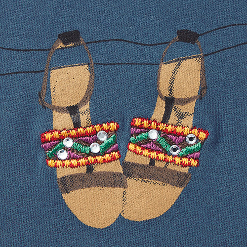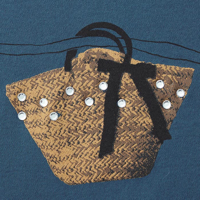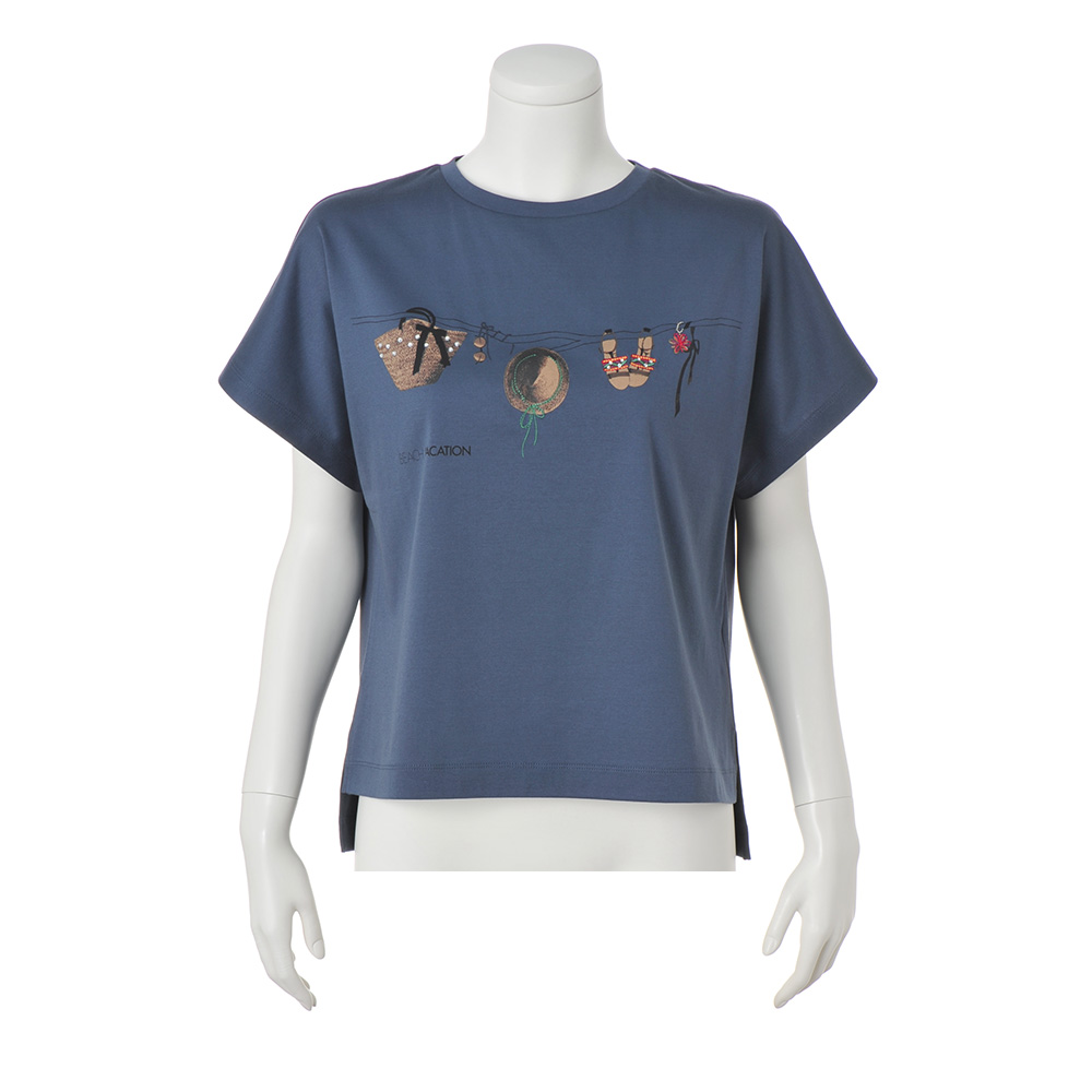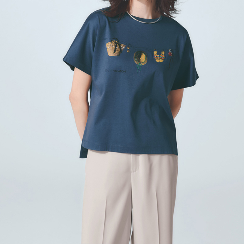 遊びの効いたアクセントでワンランク上のリュクスTシャツカゴバッグやサングラス、ストローハット、サンダル…。バカンスのお供がプリントされたハッピーなデザイン。刺しゅう使いやラインストーン、ボールチェーンもプラスしてクラス感をアップ。