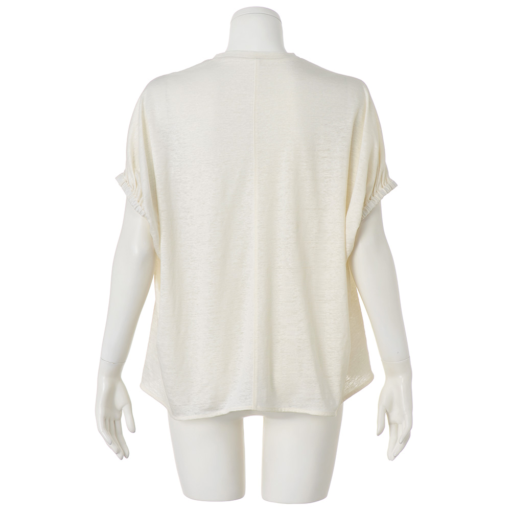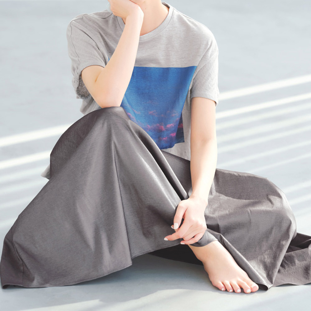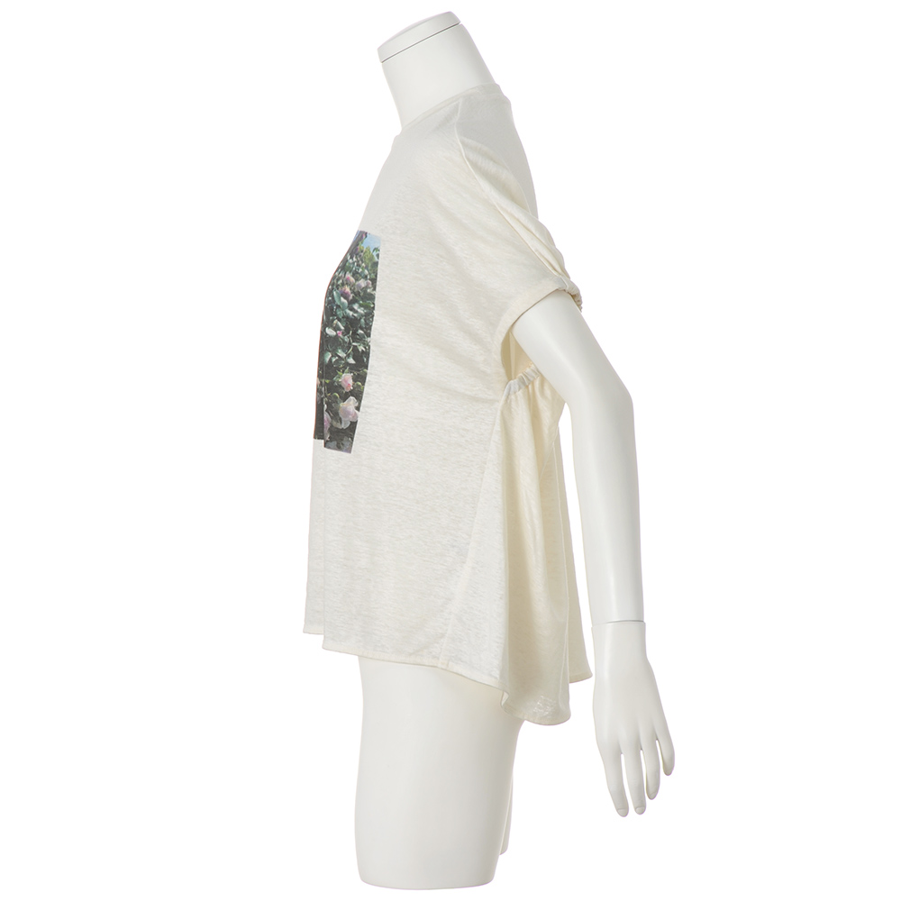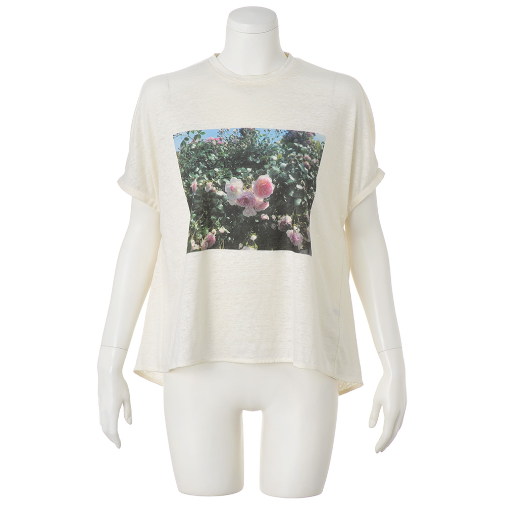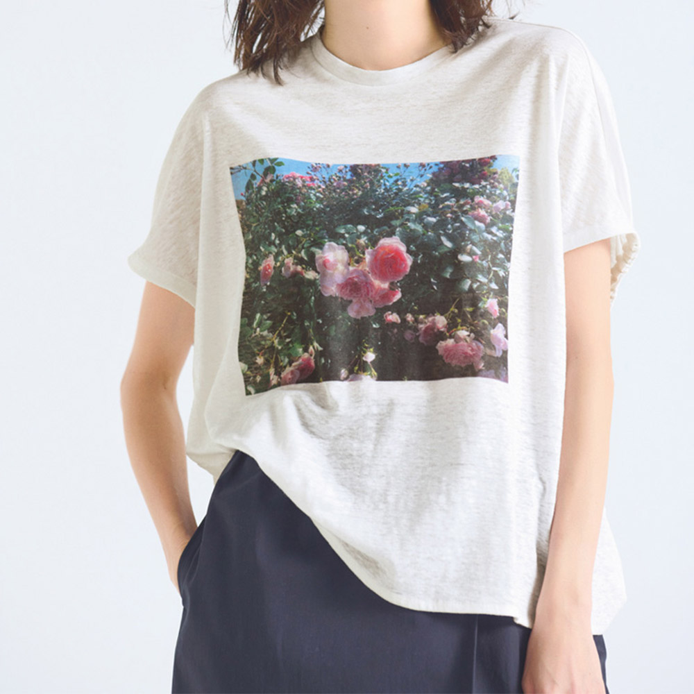 肌になじむ柔らかな着心地一枚で映えるTシャツが登場。フレンチリネン100%の糸を使ったジャージー素材に、繊維の新たな特性を引き出す特殊加工をほどこし、リネンならではの粗野な印象を抑え、適度なハリ感を保ちつつ柔らかな風合いと上質な光沢感を生み出します。シルエットはゆとりがあり、リラクシーなムード。身頃から続きのフレンチスリーブは肩まわりの窮屈さを回避しながらきゃしゃに見せてくれます。さらに袖後ろに入れたゴムギャザーが自然なドレープを生み、着用するとわかる立体感が魅力です。プリントが美しく映える生地の特性を生かし、オフホワイトにはバラの花を、アイスグレーには青空のフォトプリントをセレクト。大人の女性が着てさまになる、品のあるTシャツです。