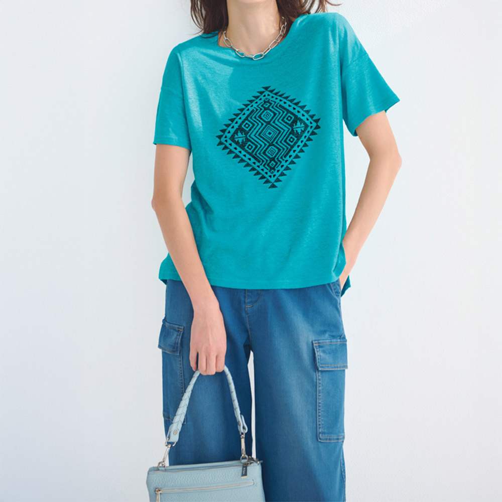 暑い季節に嬉しい機能付き!リネン100%が心地いい!大人のためのプルオーバーリネンジャージーのさらりとナチュラルな風合いで、カジュアルなプルオーバーにラグジュアリー感をプラス。前身頃にあしらったプリミティブな柄の刺しゅうがアクセントです。ゆったりめのシルエットと、前後差をつけた着丈&脇スリット、ドロップショルダーで、大人も着やすいこなれた一着に仕上げました。鮮やかなターコイズブルーと、落ち着いたブラウンの2色をご用意。[速乾 / 接触冷感]