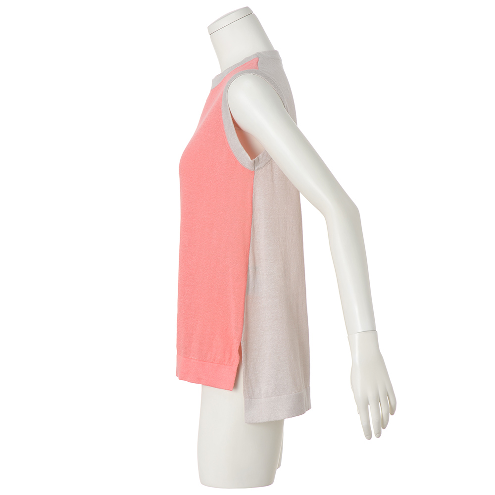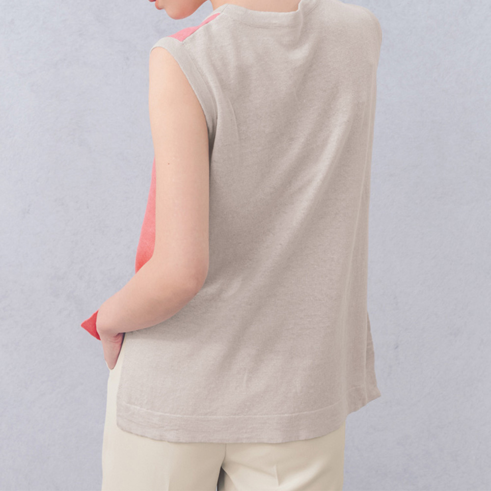 ずっと着ていたくなる、素肌に心地いい素材気温が高くなる季節に必要なのは、肌がよろこぶ快適さと心躍るデザインがマッチしたアイテム。暑さを乗り切りながら、おしゃれも満喫する装いを手に入れませんか?リネンならではのドライタッチな肌あたりが心地いい優しげなサーモンピンク×ベージュのバイカラーデザインが着映える一着。着丈は前後差をつけ、後ろはヒップにかかる少し長め丈で体型カバーを叶えます。ハイゲージの天竺編みがすっきりとしたムードを、脇のスリットが軽快な印象に導きます。[接触冷感]