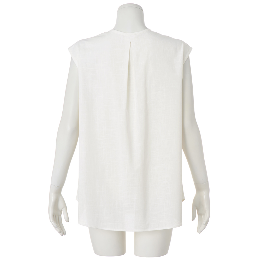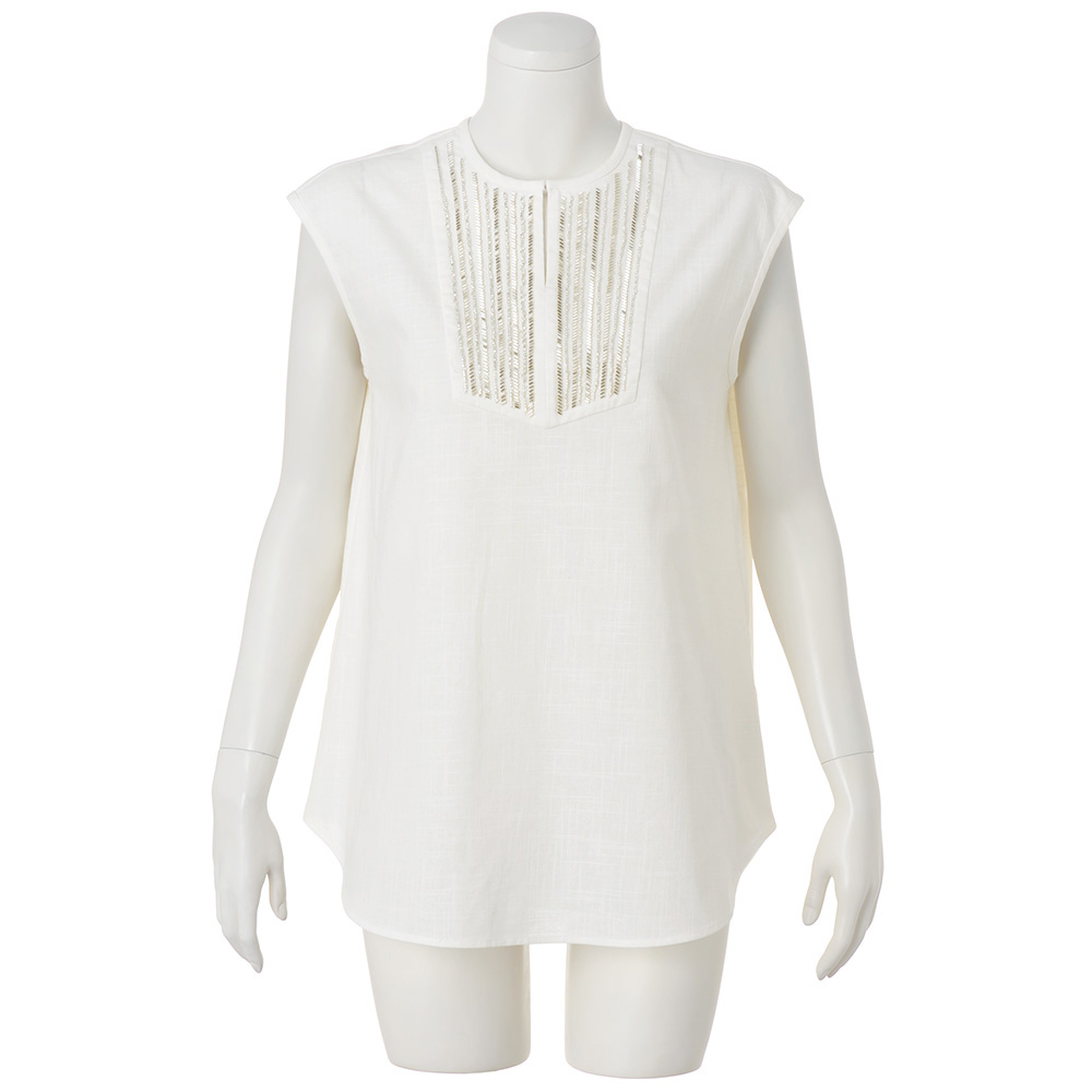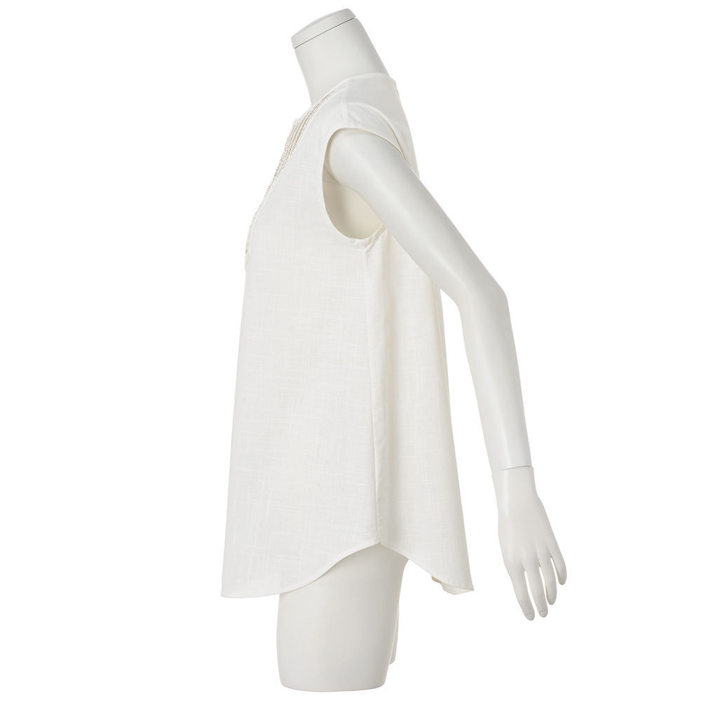 フロントに配したビーズ刺しゅうが華やかさを加速する一着。ラウンドネックにスリット&ホックをつけ、抜け感を添えました。肩幅広めのノースリーブがさりげなく肩まわりをカバー。ややAラインなシルエットと長めの丈感で、着こなしやすい汎用性の高さが魅力。