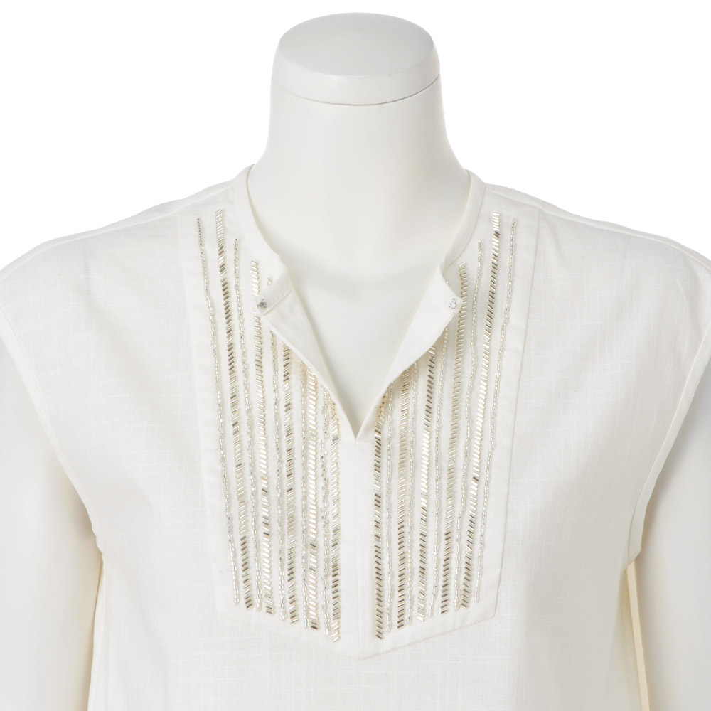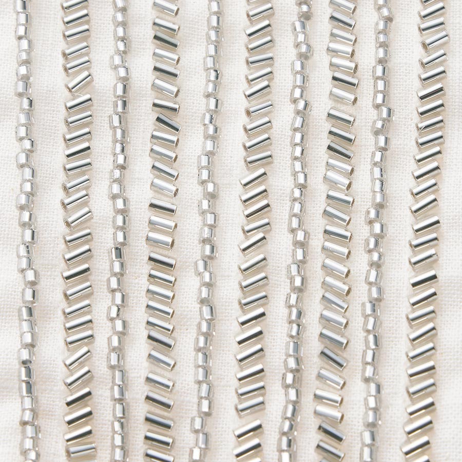 輝きを放つ形の異なるシルバービーズで、胸元に刺しゅうをほどこし印象的に。