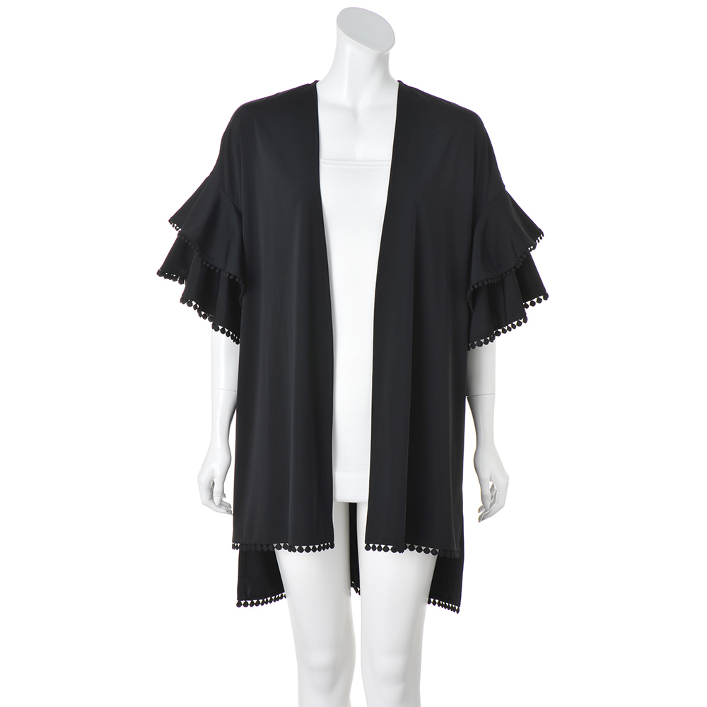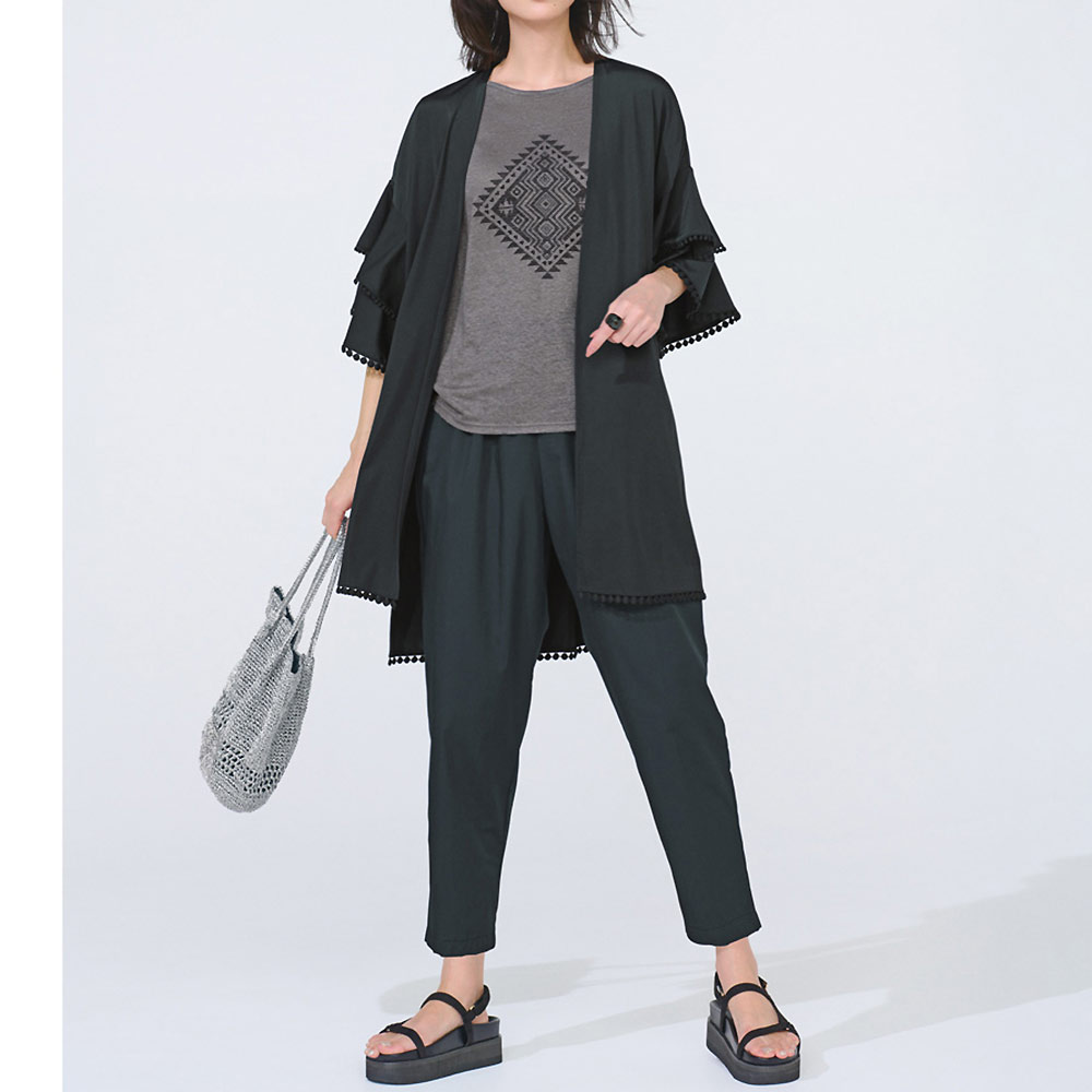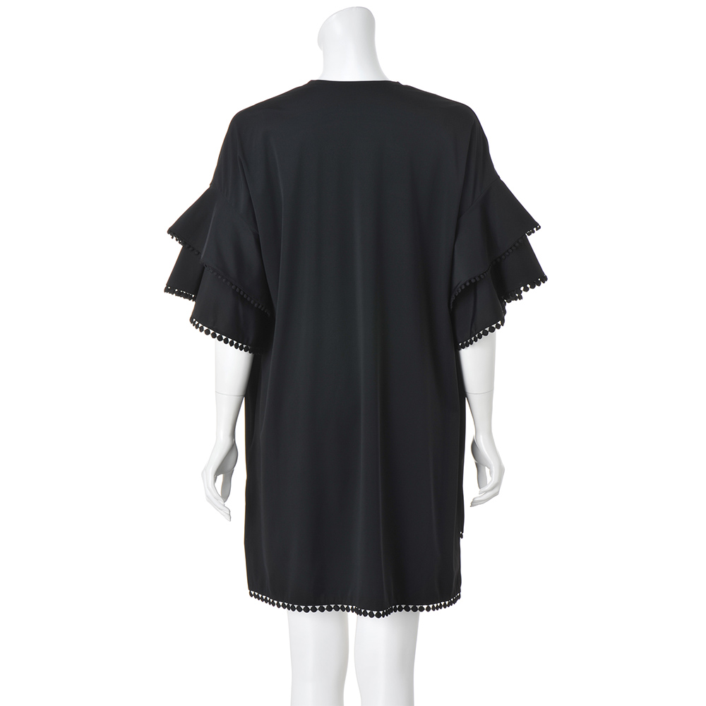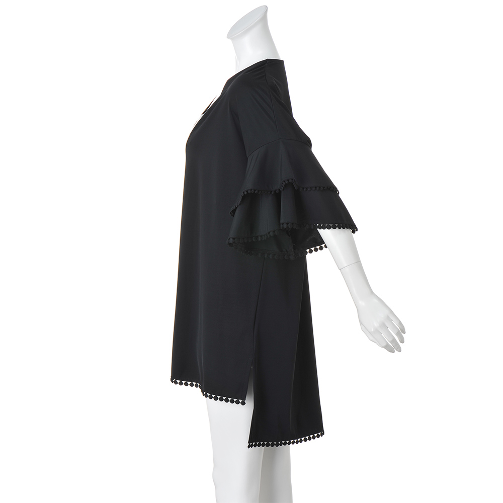 手で触れるとひんやりするのがわかるほどの接触冷感と、UVカット機能を備えたジャージー生地で心地よく。ラッフルデザインの袖と、前後差をつけた裾には、ドットモチーフのレーステープをあしらってアクセントに。歩くたびに軽快に揺れて、こなれ感を演出します。ふだん使いにはもちろん、リゾートにもおすすめの一着です。[UVカット / 接触冷感 / ウォッシャブル]