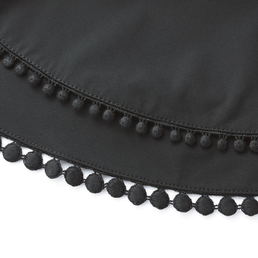 ドットモチーフのレーステープを袖には大小2種類、裾は1種類を使用。