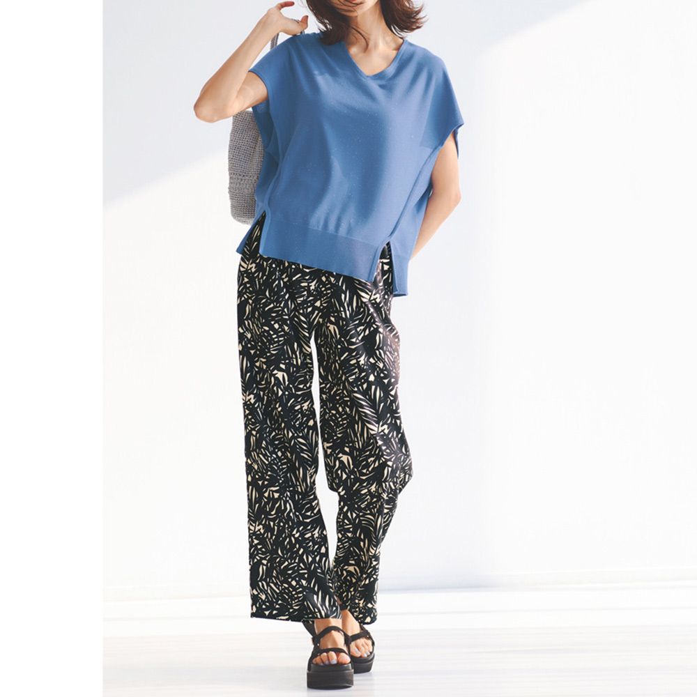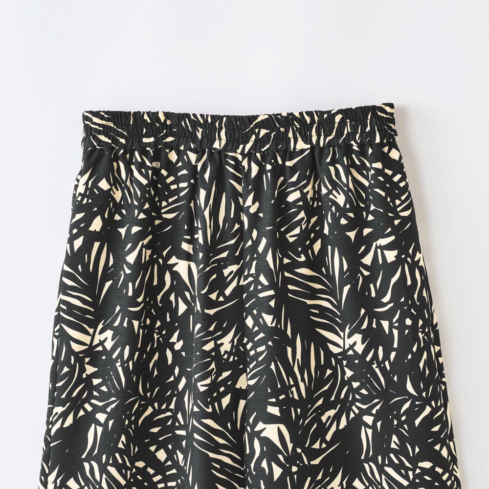 太陽に映えるアクセントが魅力!思わず出かけたくなるような、気分の上がるアイテムをご紹介。旅先の相棒にもぴったりです。リラクシーなムードに大人ならではのこだわりをちりばめてアイボリーをベースにブラックのリーフ柄をプリントしたSo Close,オリジナルの柄。リラックス感のあるワイドシルエットにプルオンタイプで楽なはき心地。さらりとした落ち感のある素材は、肌離れもよく快適です。