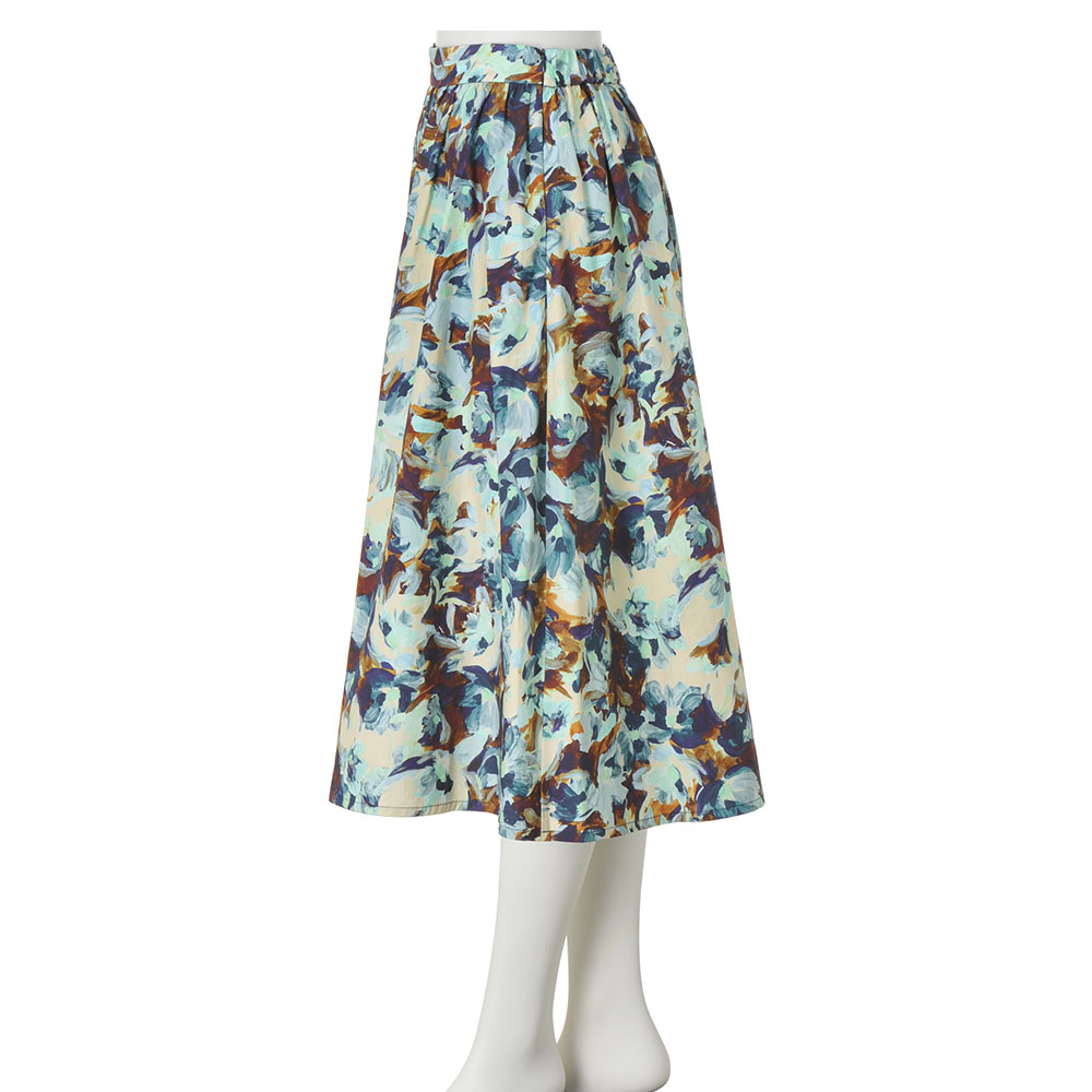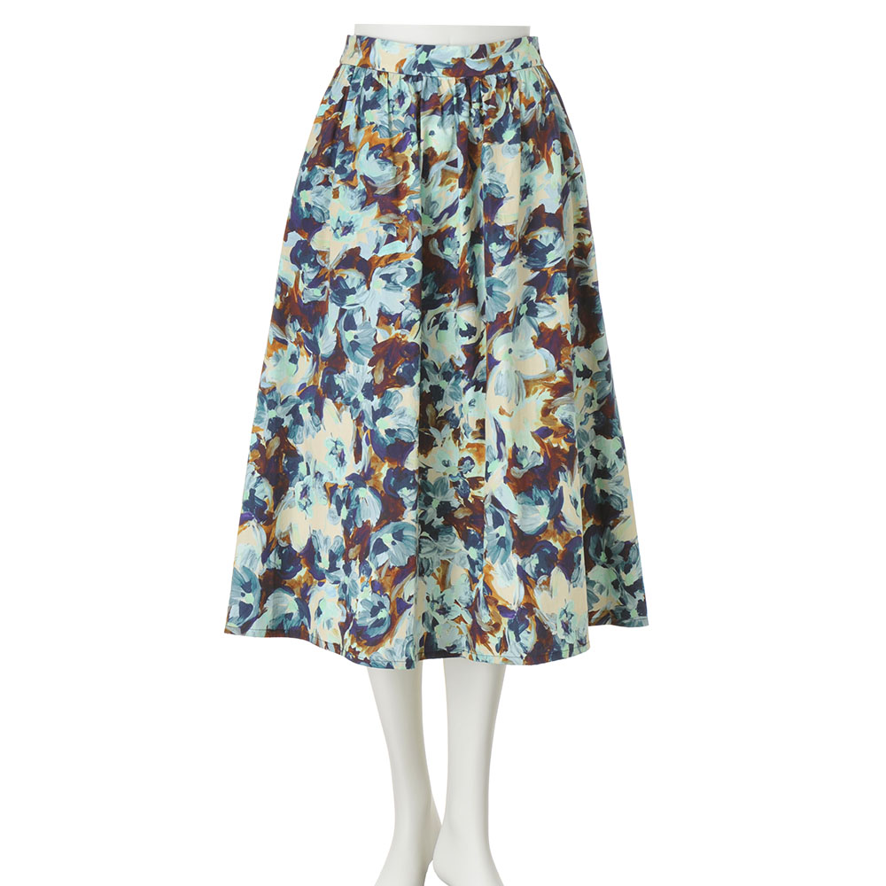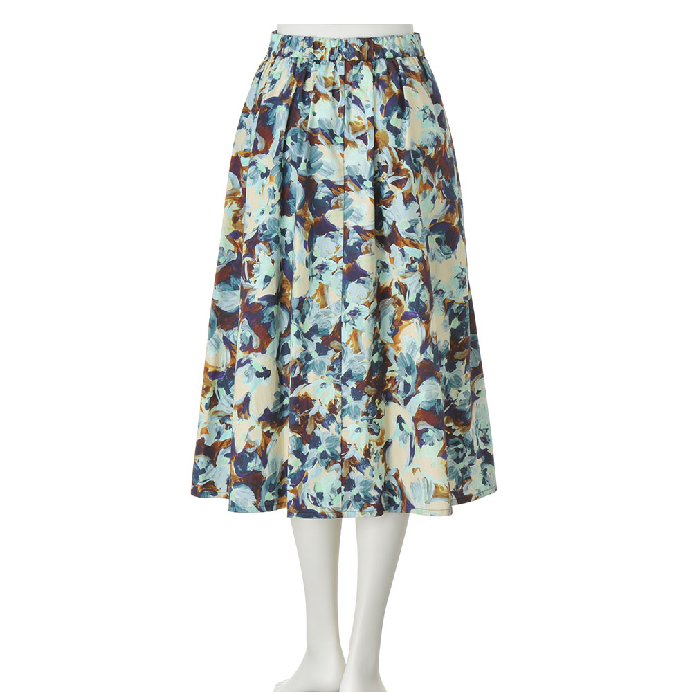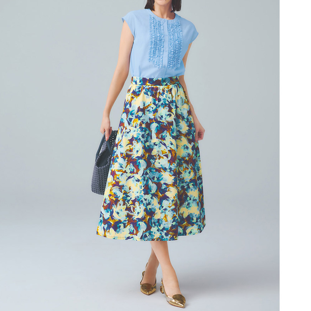 上品で甘い大人の着こなし SWEET LADY LOOK優雅で洗練された装いの中に、ほんのり甘いエッセンスを。理想的な“大人可愛い”を叶えるアイテムをご紹介します。フランス「DEVEAUX」社の生地を使ったスカート。パッと目を引く華やかさで、スタイリングの主役に。ブルーを基調にサックスやブラウンなどを組み合わせたカラーリングは、インポートならでは。ウエスト下にギャザーを寄せ、ふわりと広がるフレア感を表現しました。