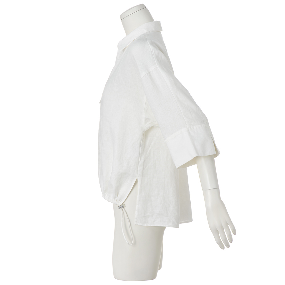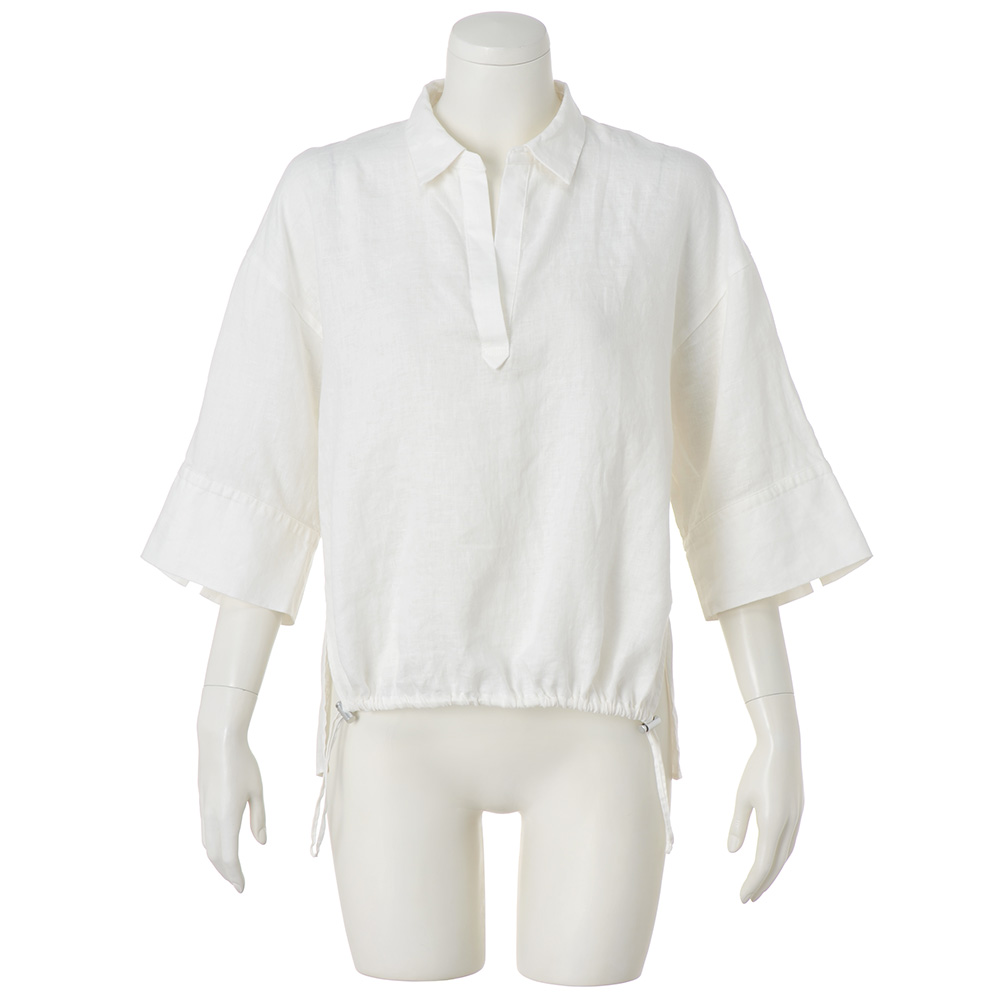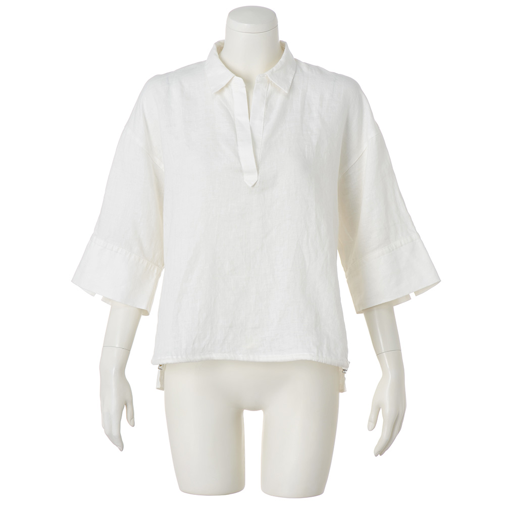 軽やかなフレンチリネンのブラウスでこなれる風が通るゆったりしたシルエットで、暑い時期でも心地よく過ごせるブラウス。着るたびに生地が柔らかくなり、自然にからだになじんでいく、フレンチリネンならではの風合いが楽しめます。デコルテが美しく見えるスキッパーの襟や、前裾のドローストリング仕様など、ゆとりがありつつも全体をすっきりした印象に見せるデザインの工夫も秀逸。[ウォッシャブル]