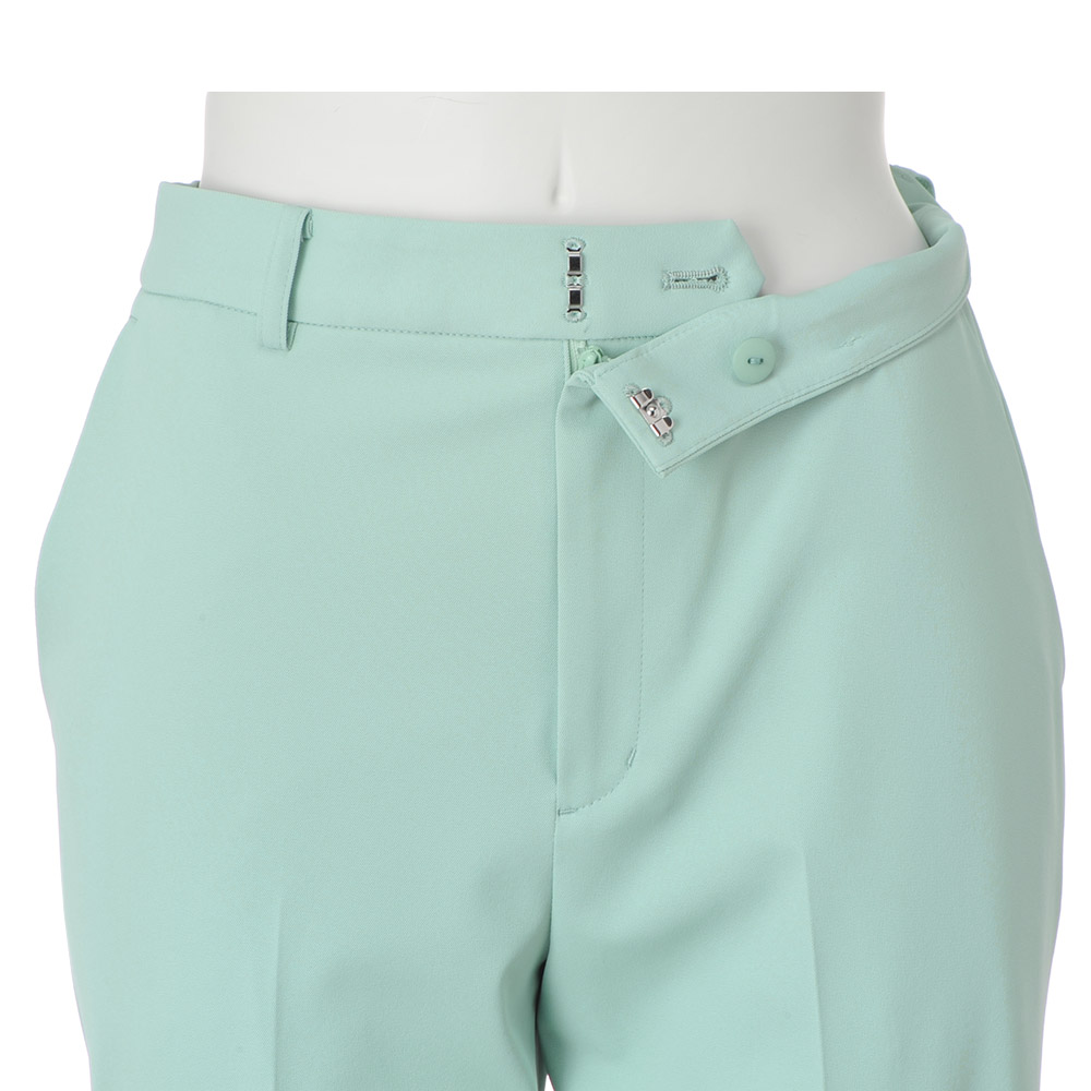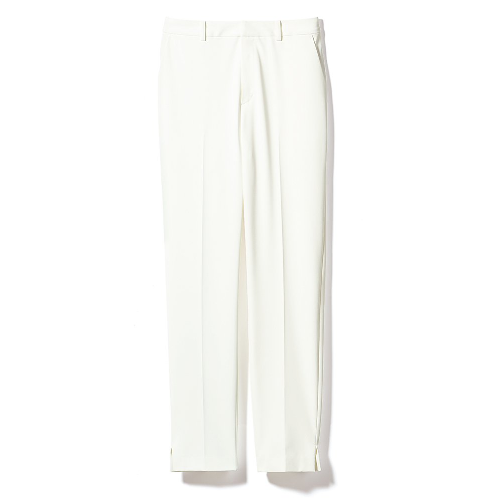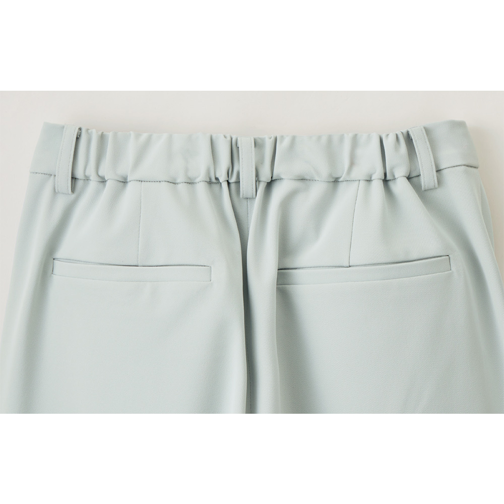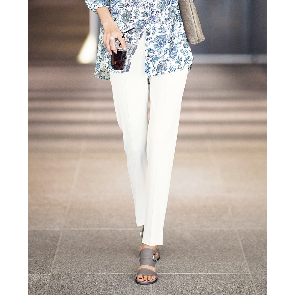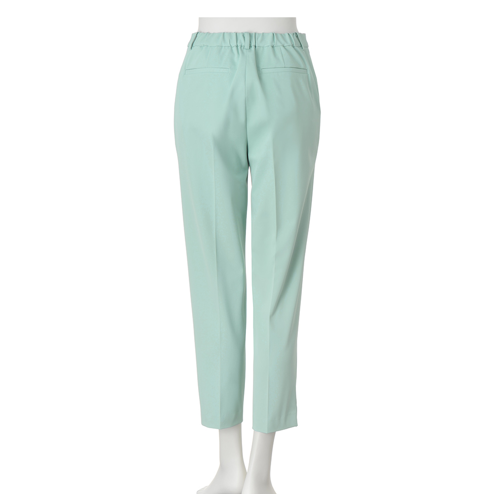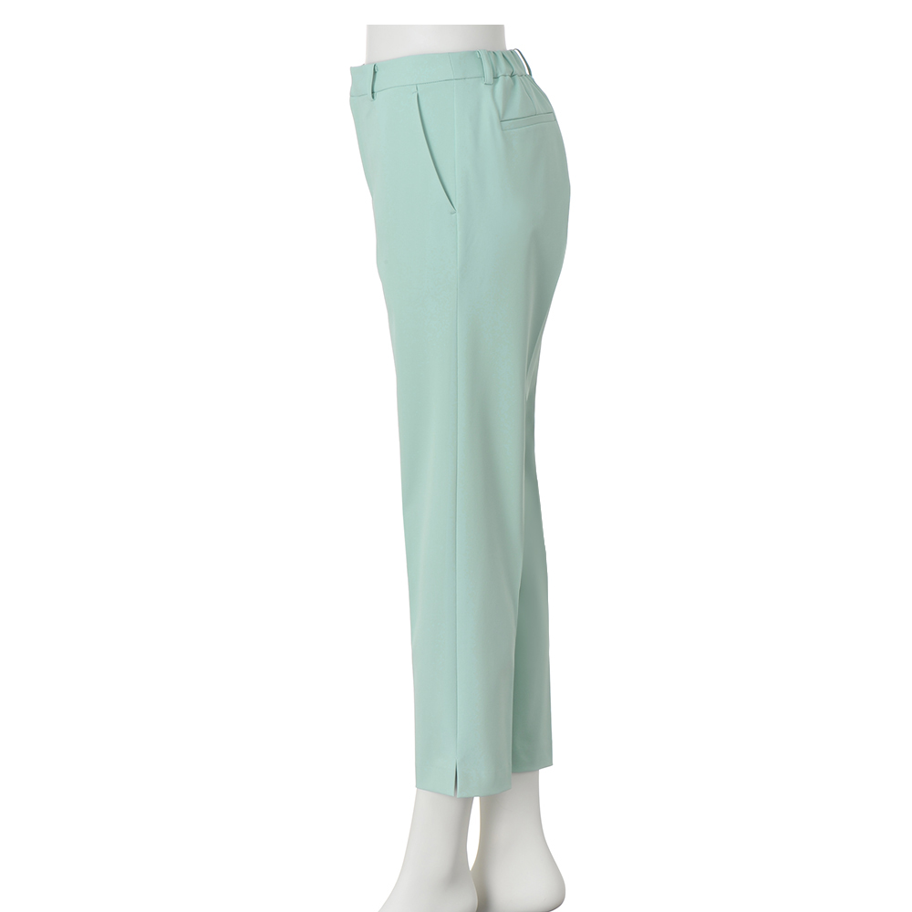 なにげなく纏うだけで爽やかさがあふれる服生地は接触冷感、UVカット、透け防止、防シワ、ウォッシャブルと暖かい季節に嬉しい機能満載のポリエステル糸「シェルプラス」を織り上げた縦横ストレッチツイル。テーパードラインにセンタープレス、裾スリットを入れて美脚効果も。≫ POINTウエストは後ろのみゴム仕様、腰高に見せるヒップダーツや玉縁ポケットもあしらったきれいめパンツ。