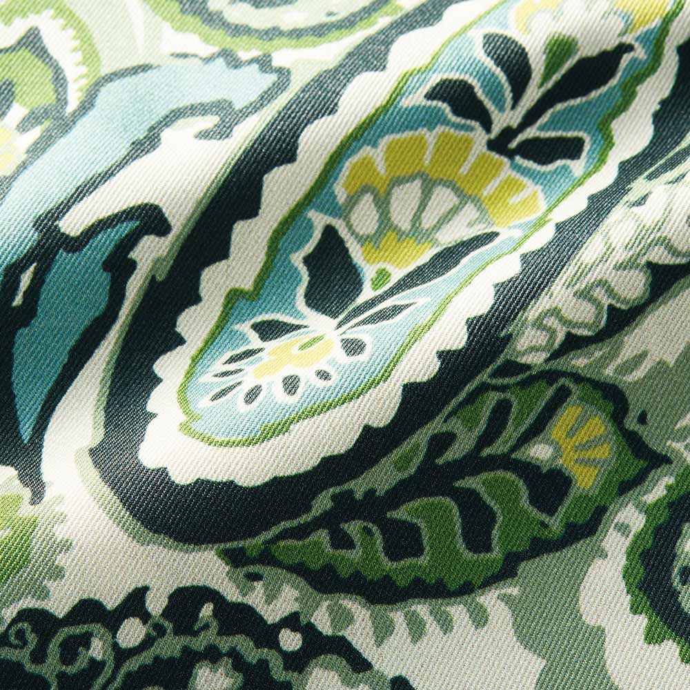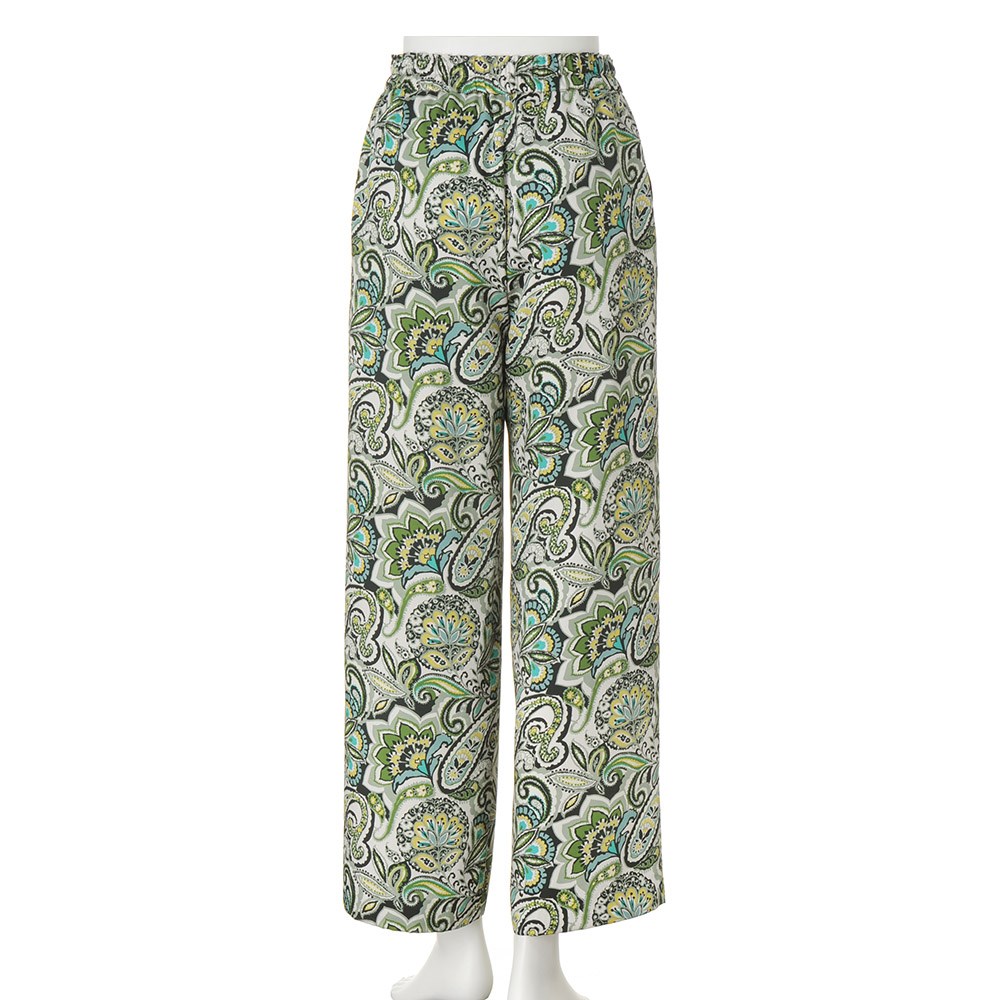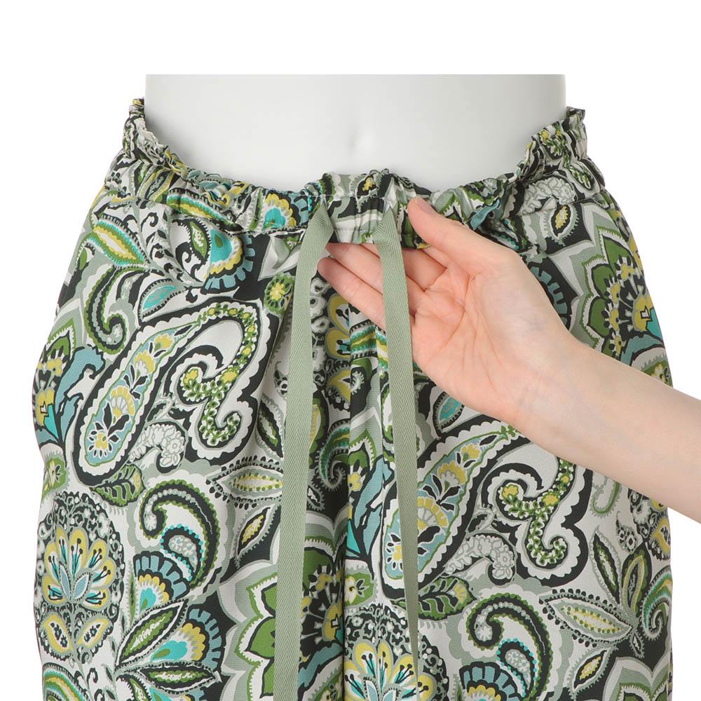 マテリアルの清涼美でスタイルを新鮮に。デイリーに役立つベーシックアイテムをエフォートレスなモード感で再解釈。パンツはイタリア「ERICA」社の更紗&ペイズリープリントのツイル素材で仕立てたプルオン仕様のセミワイドシルエット。上品な光沢としなやかさ、グリーンを基調にした濃淡やイエローを利かせたシックでナチュラルな配色が絶妙に調和した、優雅なリラックス感が大人好みです。≫ POINTウエストの内側の紐でサイズ調節できる仕様。下着の透けを気にせず、裾周りがもたつかない、膝下丈の裏地付きです。