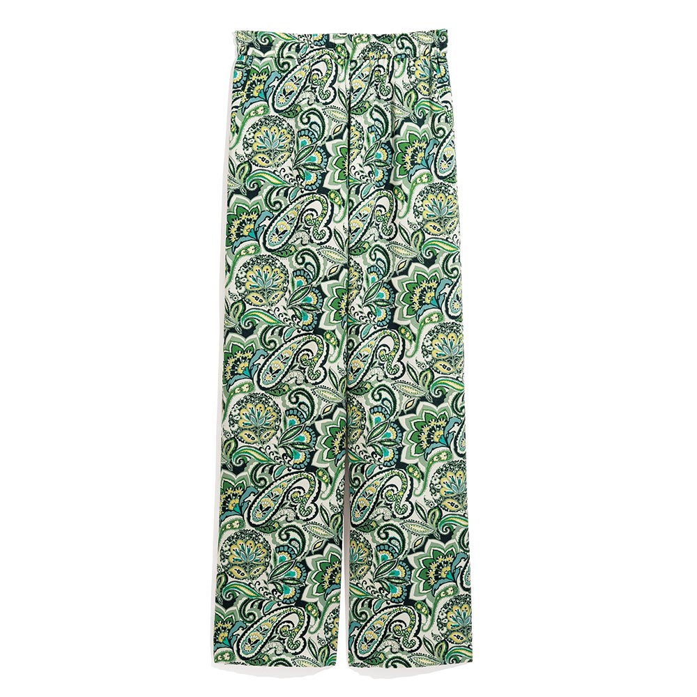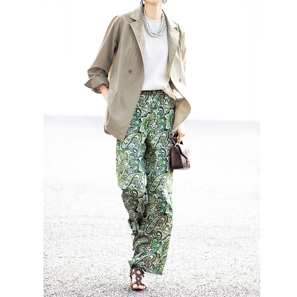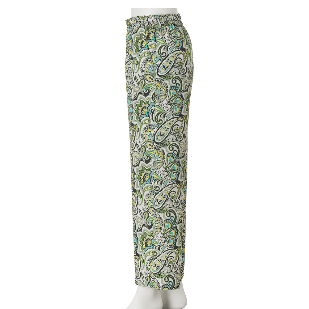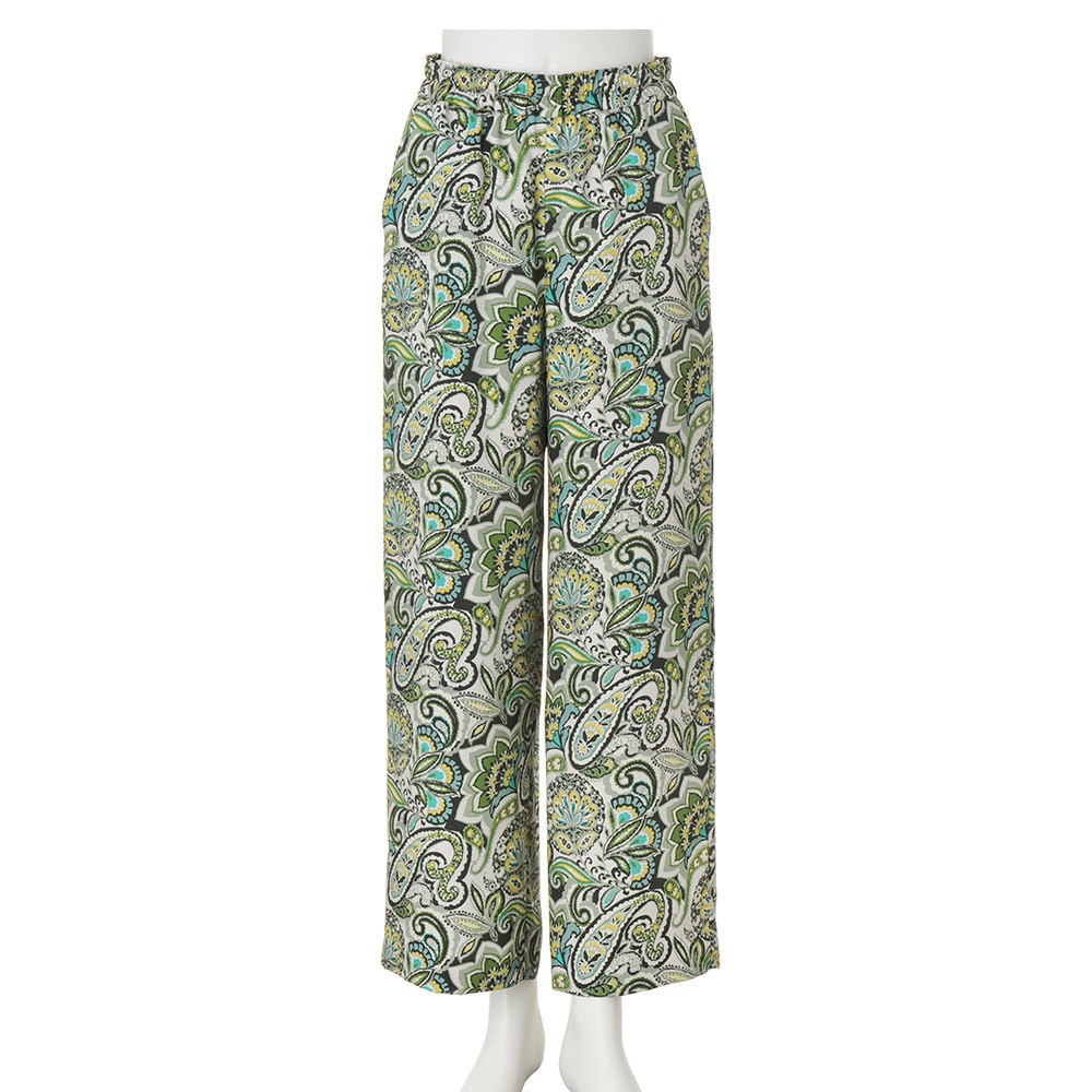 マテリアルの清涼美でスタイルを新鮮に。デイリーに役立つベーシックアイテムをエフォートレスなモード感で再解釈。パンツはイタリア「ERICA」社の更紗&ペイズリープリントのツイル素材で仕立てたプルオン仕様のセミワイドシルエット。上品な光沢としなやかさ、グリーンを基調にした濃淡やイエローを利かせたシックでナチュラルな配色が絶妙に調和した、優雅なリラックス感が大人好みです。≫ POINTウエストの内側の紐でサイズ調節できる仕様。下着の透けを気にせず、裾周りがもたつかない、膝下丈の裏地付きです。