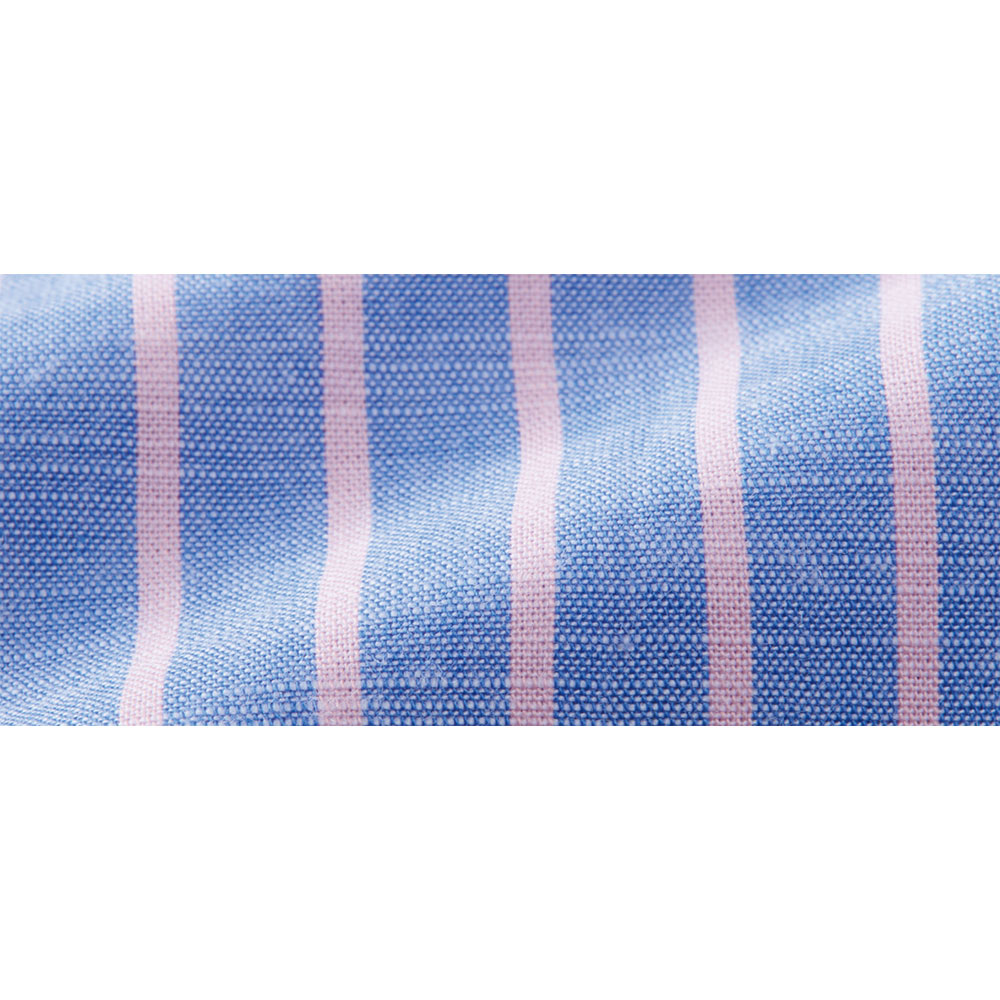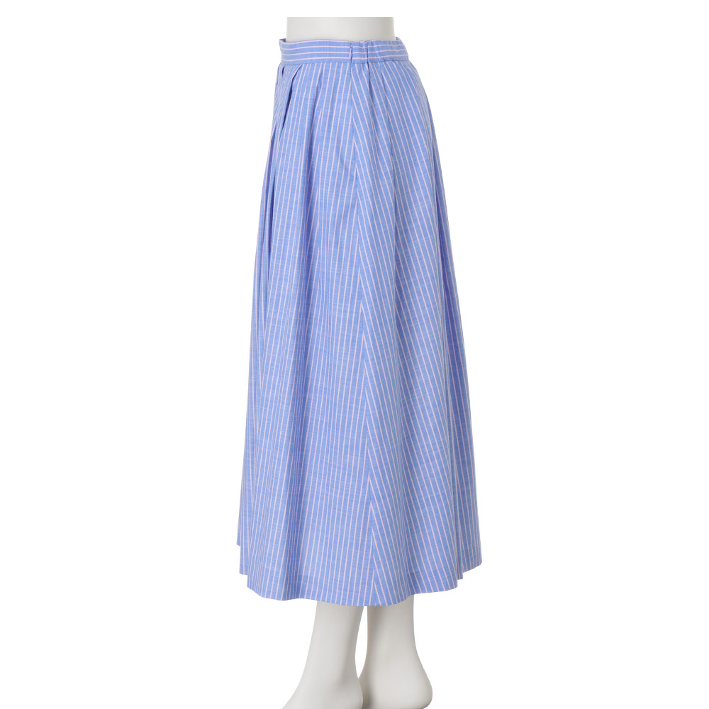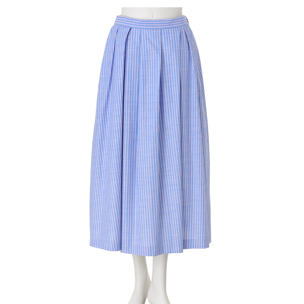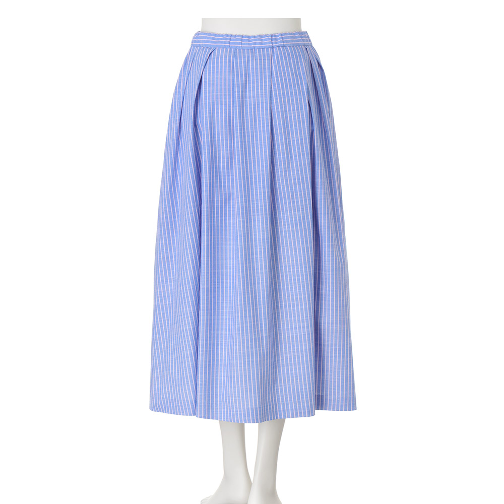 清潔感と愛らしさを色と柄で、心行くまでピンクの色がニットにリンクするライトブルー×ピンクのストライプ柄スカートで、カジュアルな印象に。手摘みのエーゲ海コットンを先染めしたテキスタイルは、プリントでは出せない自然なシャンブレー感がニュアンスを表現。この生地を贅沢に使い、ランダムに寄せたタックが自由な動きを生むスカートに。トラッドカジュアルをモードな感性で崩した、遊び心溢れる着こなしをお楽しみください。≫ POINTアシンメトリーに配したタックが、ストライプ柄に動きとモダンな表情を加えます。通気性に優れた爽快な裏地付きも快適ポイント。