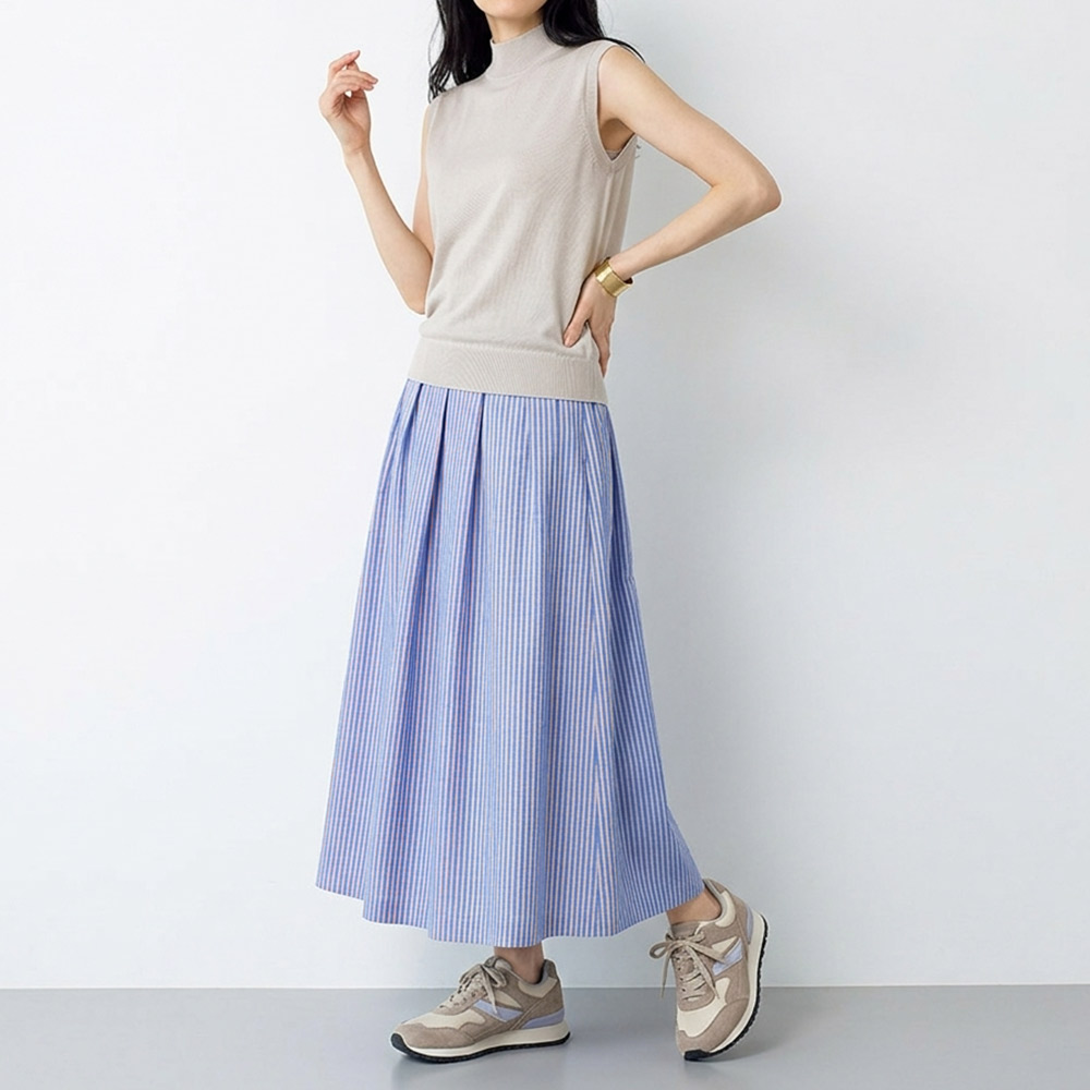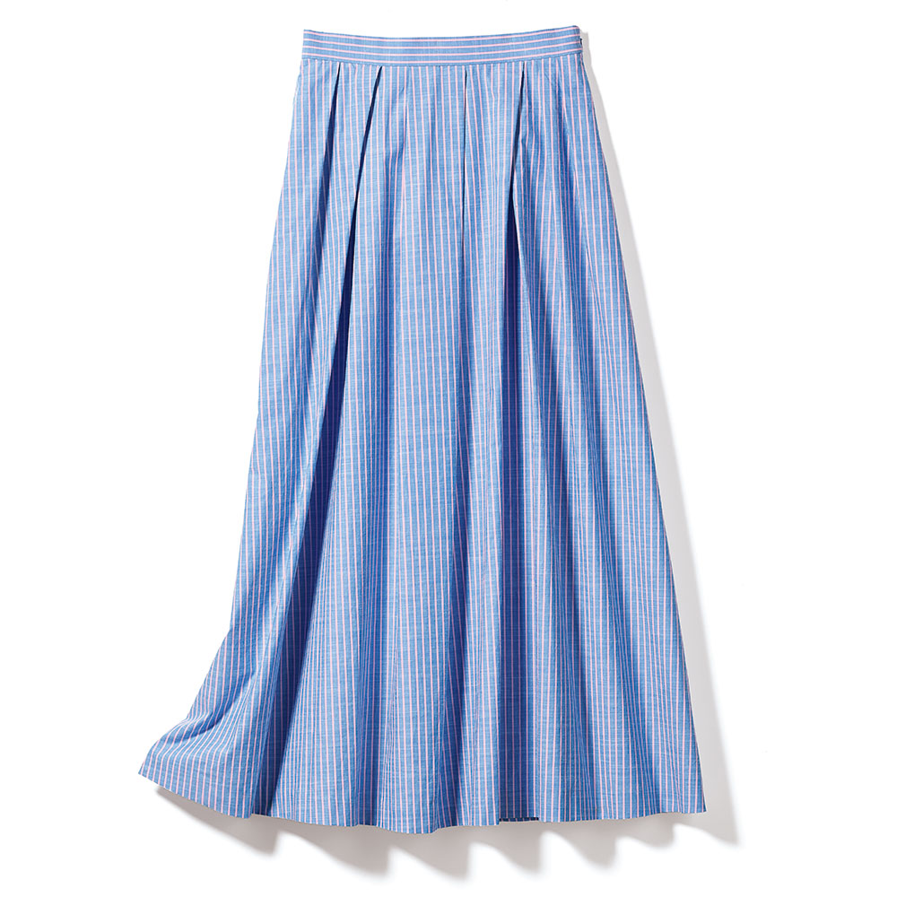 清潔感と愛らしさを色と柄で、心行くまでピンクの色がニットにリンクするライトブルー×ピンクのストライプ柄スカートで、カジュアルな印象に。手摘みのエーゲ海コットンを先染めしたテキスタイルは、プリントでは出せない自然なシャンブレー感がニュアンスを表現。この生地を贅沢に使い、ランダムに寄せたタックが自由な動きを生むスカートに。トラッドカジュアルをモードな感性で崩した、遊び心溢れる着こなしをお楽しみください。≫ POINTアシンメトリーに配したタックが、ストライプ柄に動きとモダンな表情を加えます。通気性に優れた爽快な裏地付きも快適ポイント。