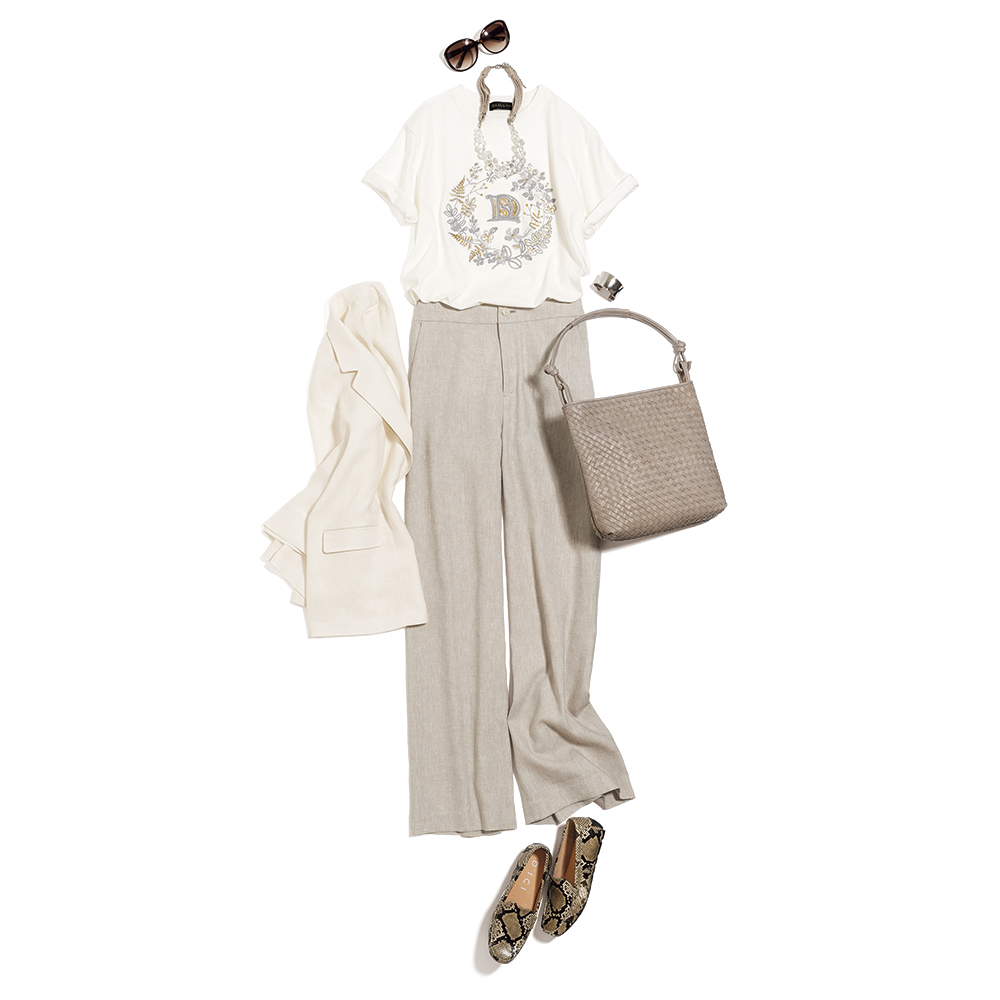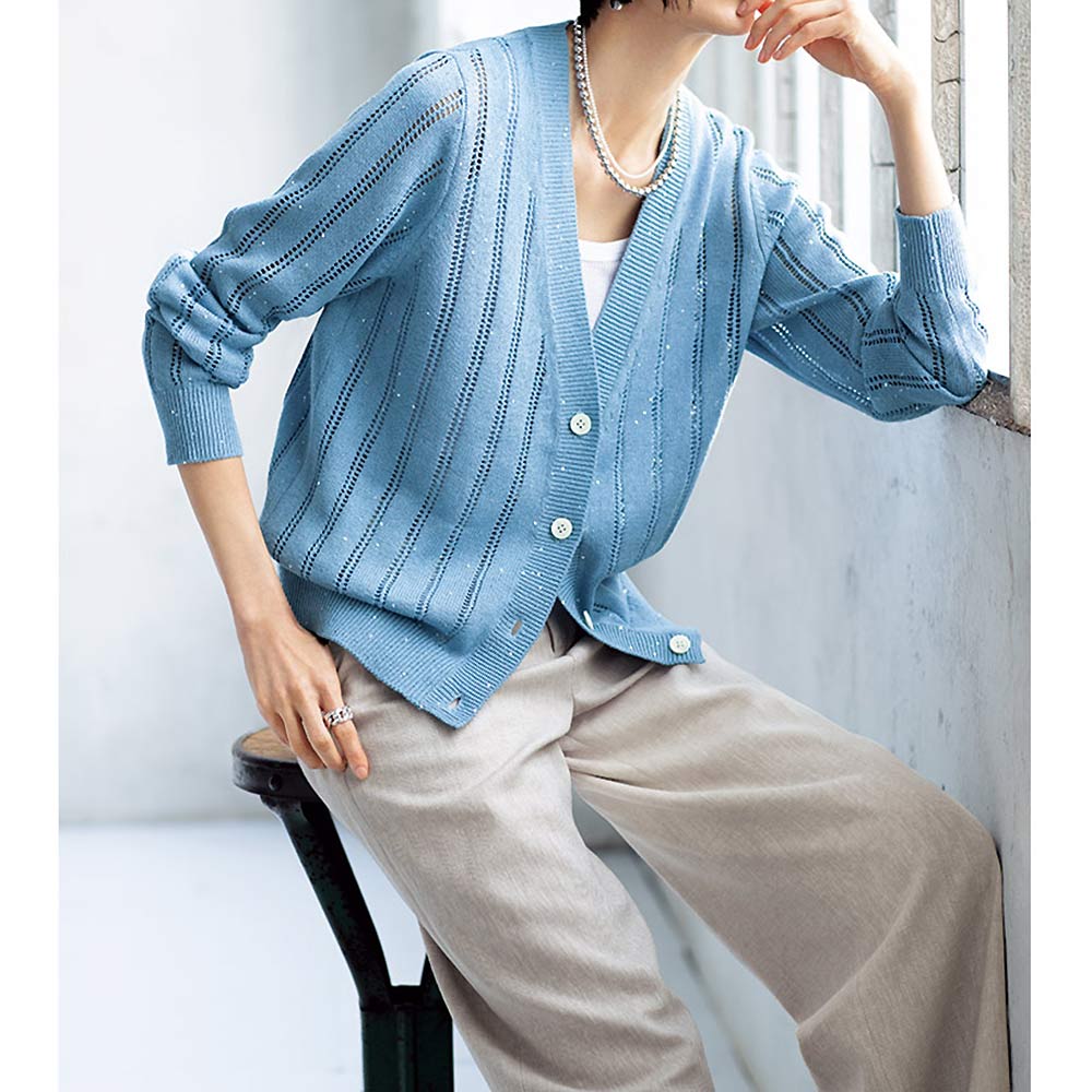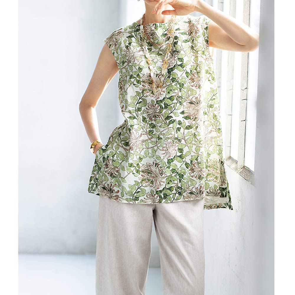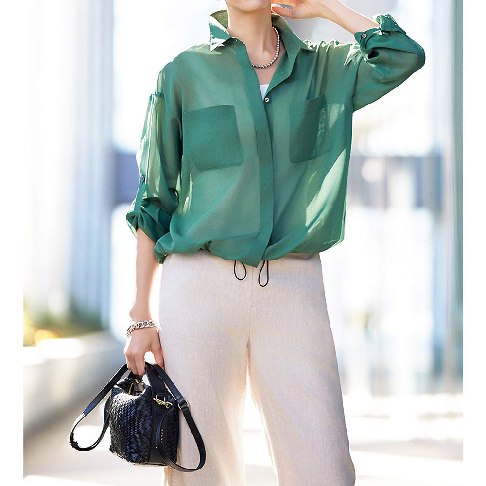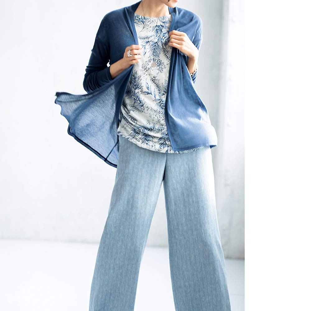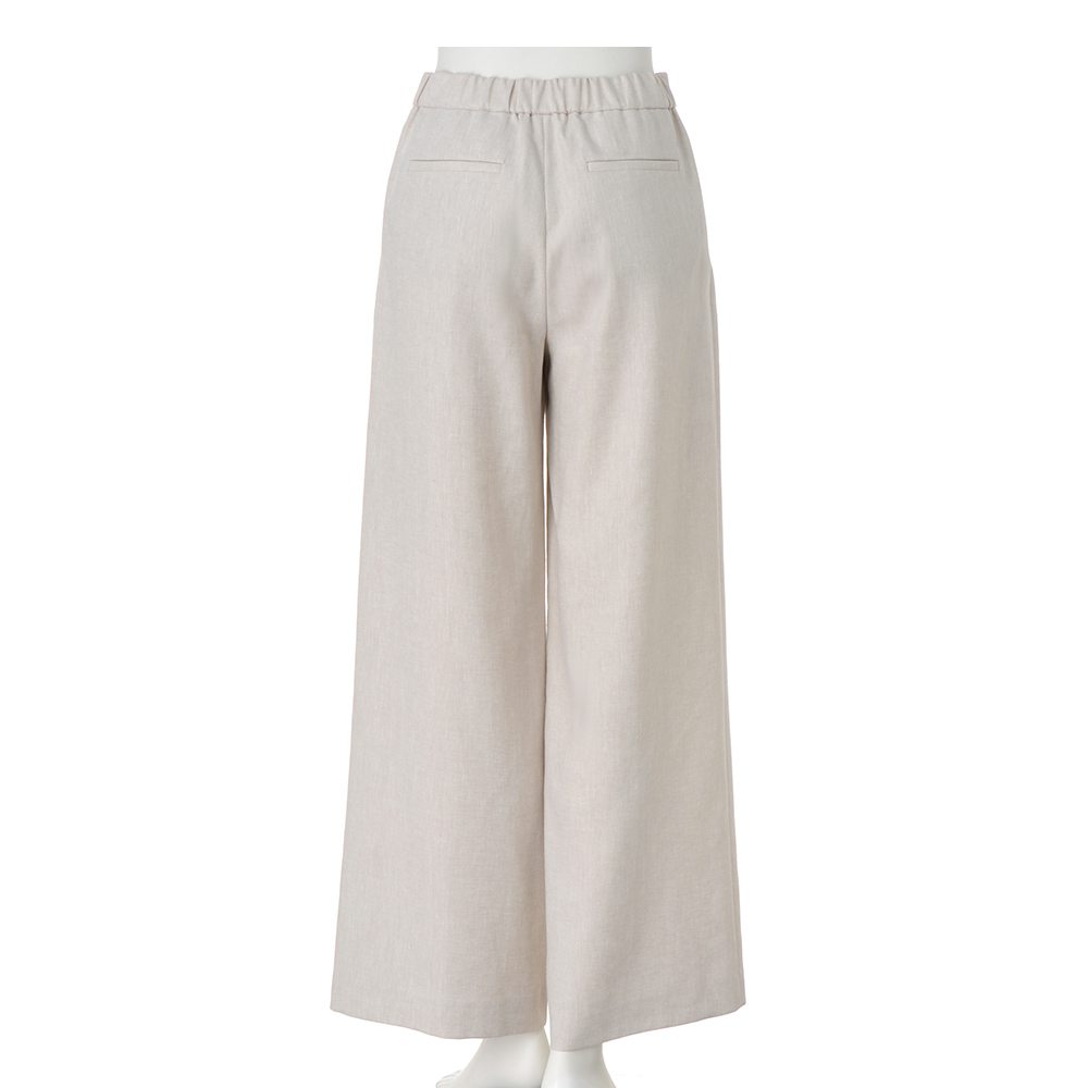 着回し万能なパンツDAMAコレクション自慢のワイドシルエットのパンツを、リネン業界で世界トップ5に入るオランダ「NORTHERN LINEN」社企画のリネン生地で仕立てました。リネンの爽やかさはそのままに、ポリエステルをブレンドすることでシワを軽減。薄く柔らかな風合いから生まれる落ち感が、シルエットに女性らしさとスラリとした美脚効果を与えてくれます。繊細なヘリンボーン織りの素材感が際立つようフロントはノータック、後ろウエストのみゴム仕様にしたシンプルかつリラクシーなデザインで。