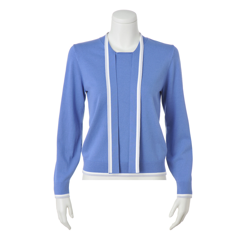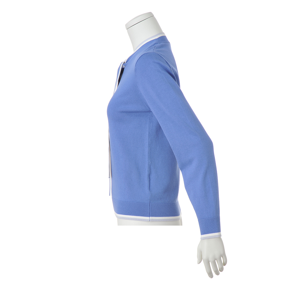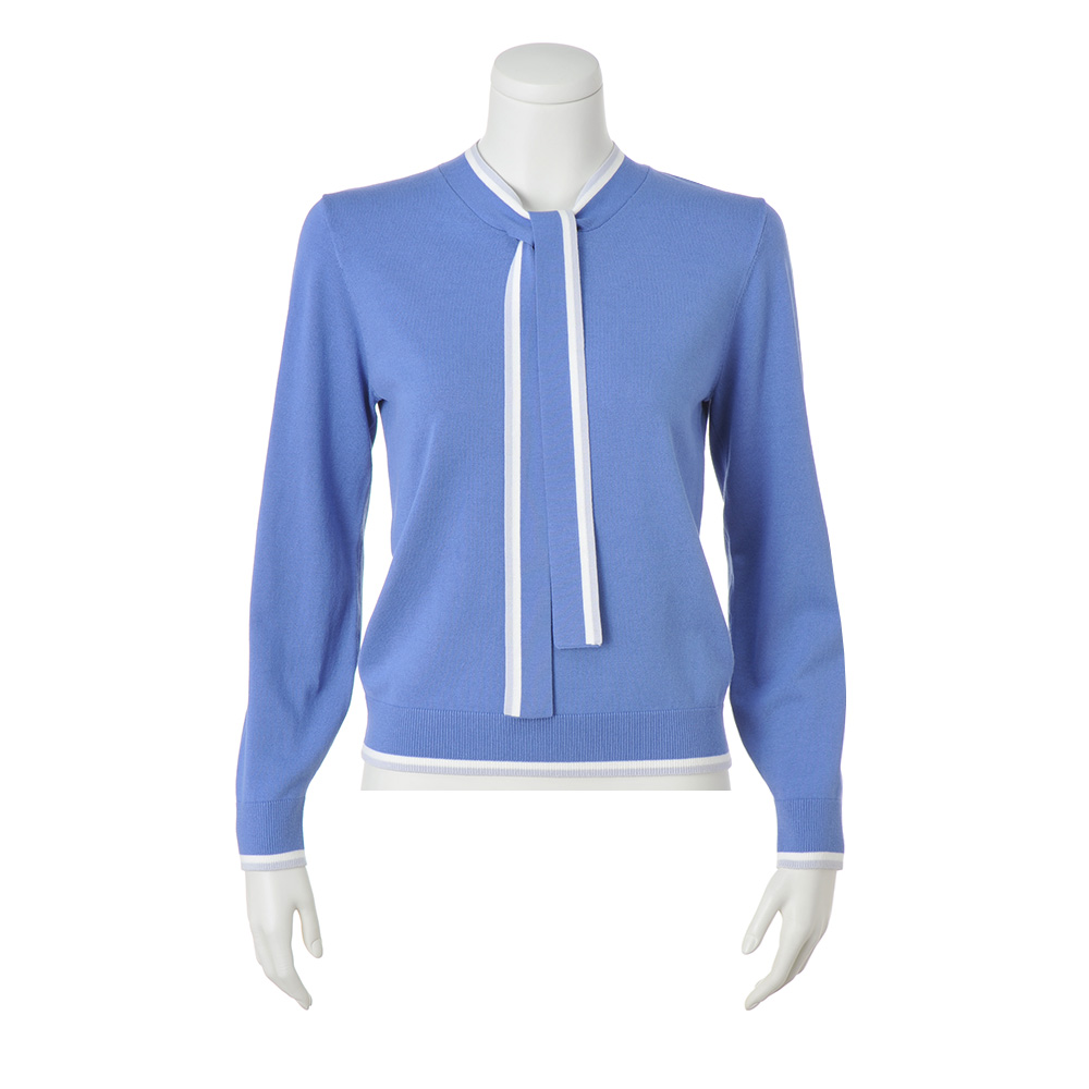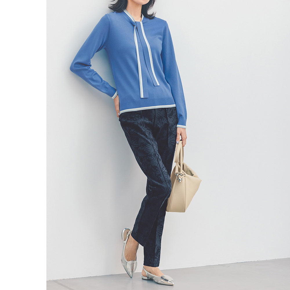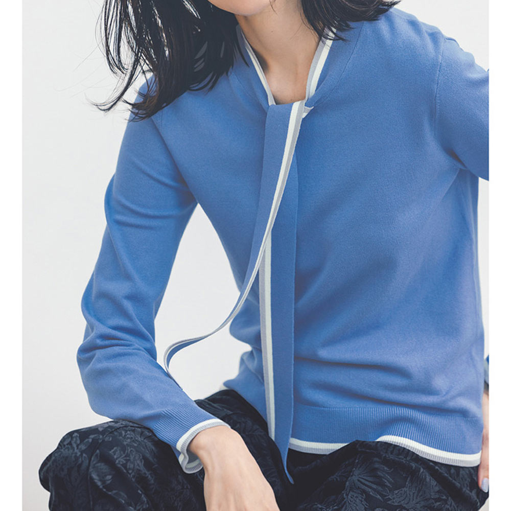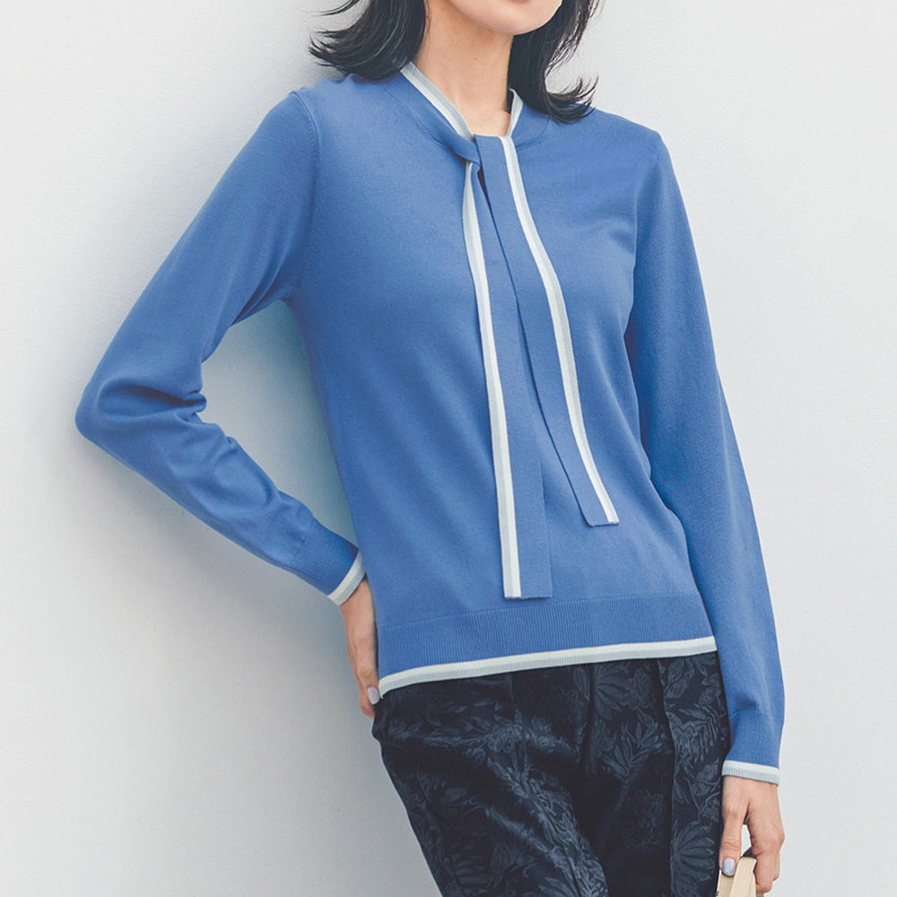 ブルー、グレー、白の3色のグラデーションを、タイと袖口、裾にあしらいました。リボンを結んでも可愛く、そのまま垂らしても装いのアクセントに。一着でも、ジャケットなどのインにも映えるデザイン。嬉しい機能性も◎。≫ POINTブルー、グレー、白の3色が絶妙なグラデーションに。差し色になって爽やかに映えます。