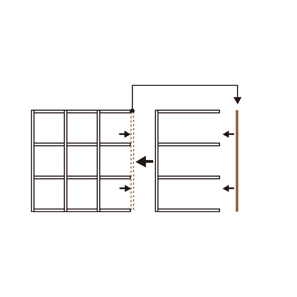 2連セットに幅71cm・幅37cm×3の連結用パーツを組み合わせれば、幅259cmの6連シェルフに。