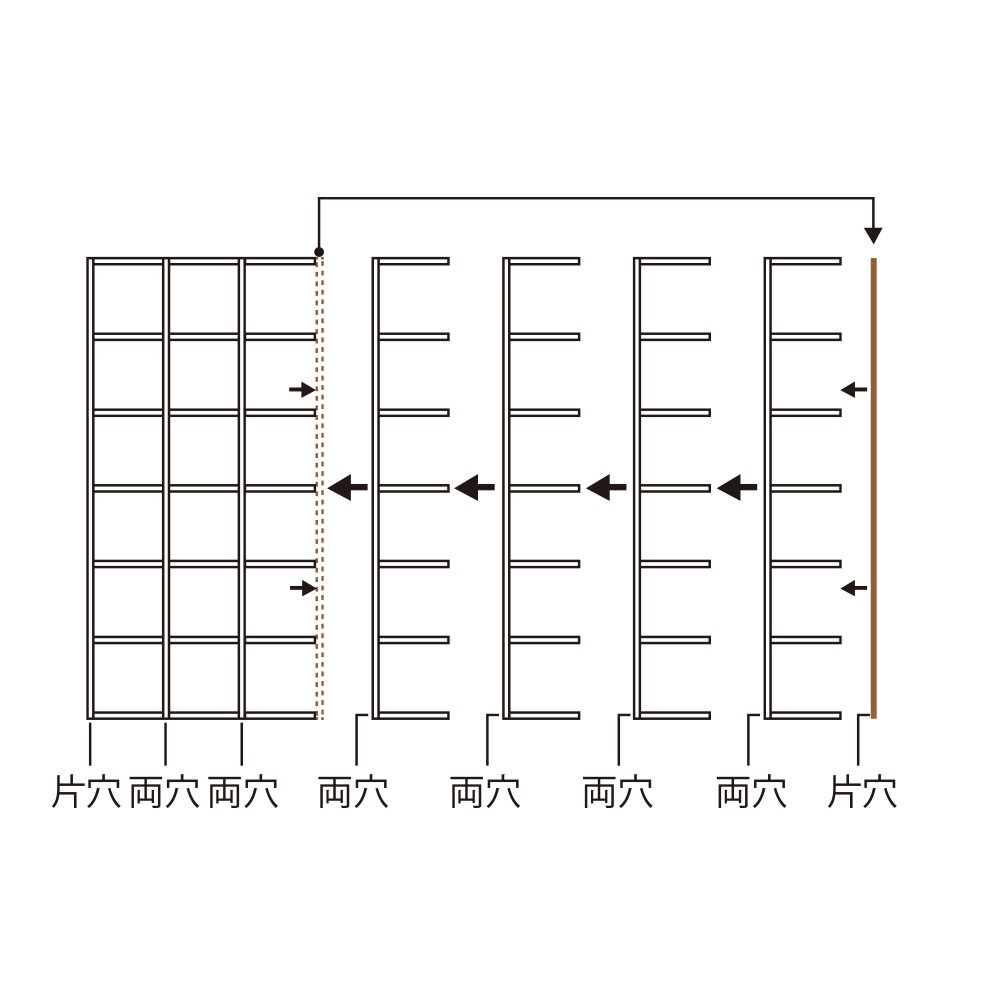写真はダークブラウン色高さ224の別売5連セット+別売連結用パーツ2台の7連でのコーディネート例