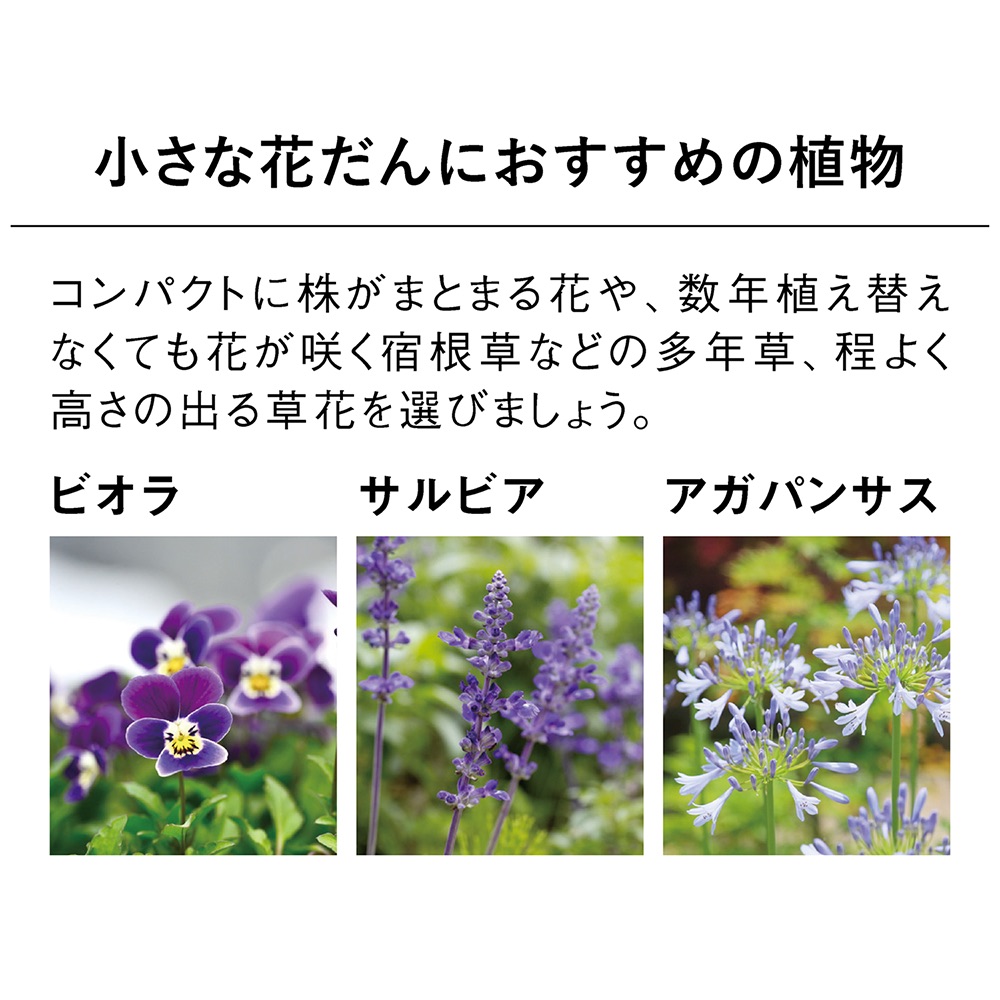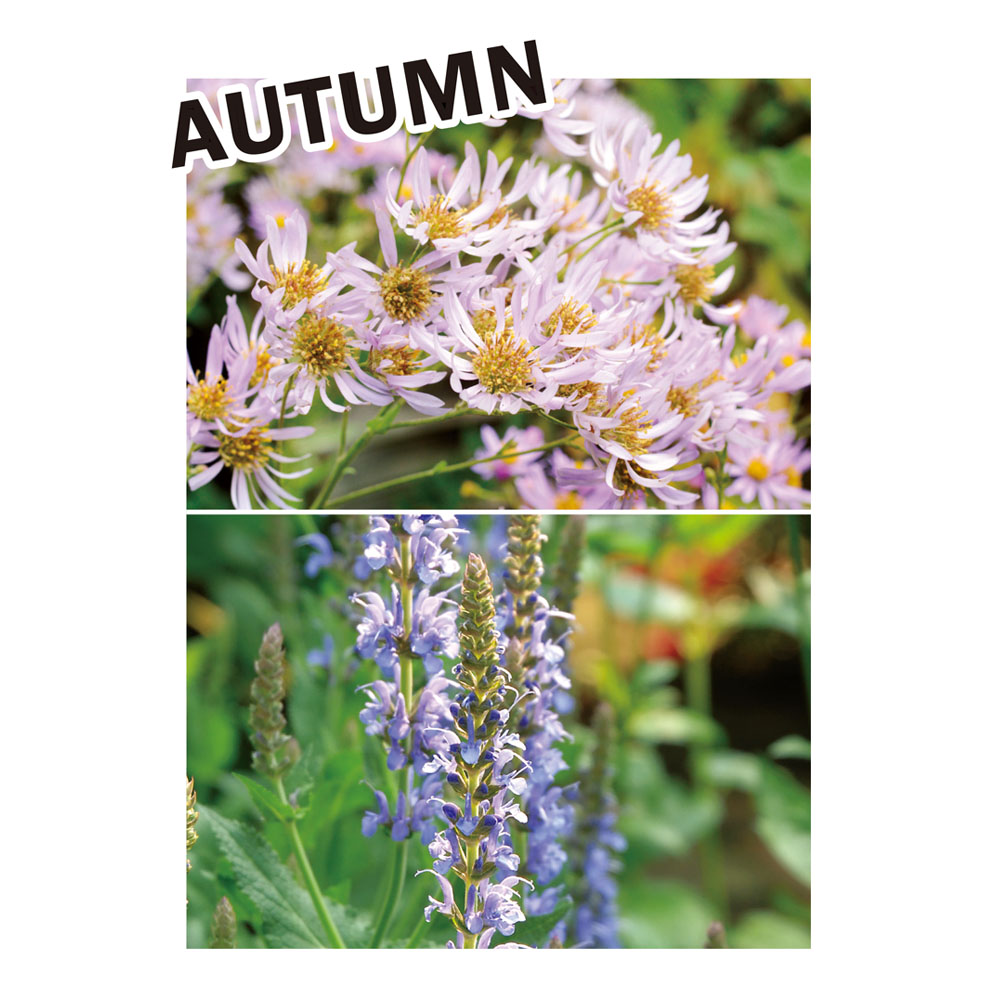 おすすめのナチュラル植栽コーディネート:晩夏から秋まで長く楽しめるアスターやサルビアが活躍。色づく葉が美しいコリウスやグラス類で秋の風情を演出しても。