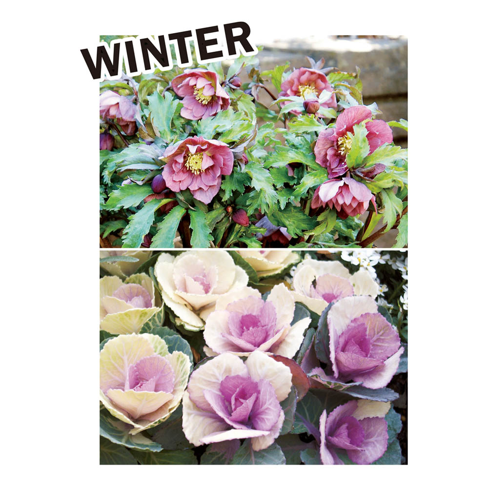 おすすめのナチュラル植栽コーディネート:花の少ない冬におすすめなのはクリスマスローズやパンジー、ビオラ。葉色が美しく、鑑賞期が長いハボタンも重宝します。