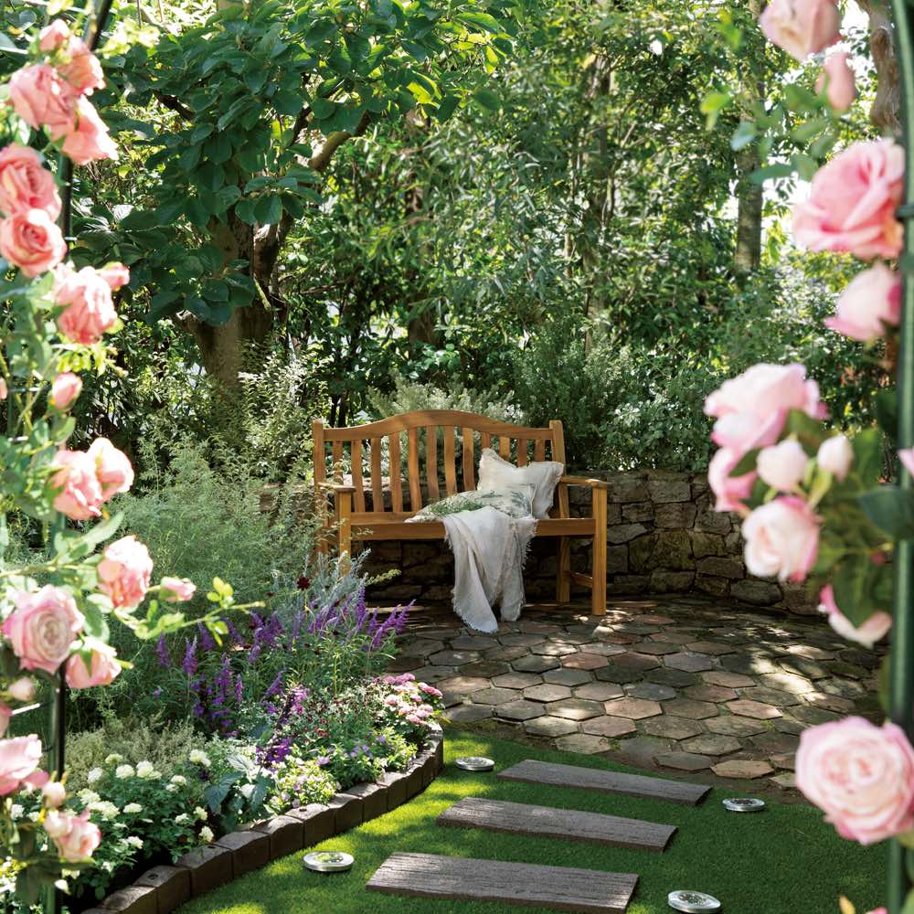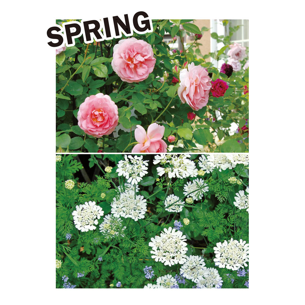 おすすめのナチュラル植栽コーディネート:あこがれのバラを主役に足元には楚々としたオルラヤを。バラと花期が揃うジギタリス、クレマチスを合わせて華やかに。