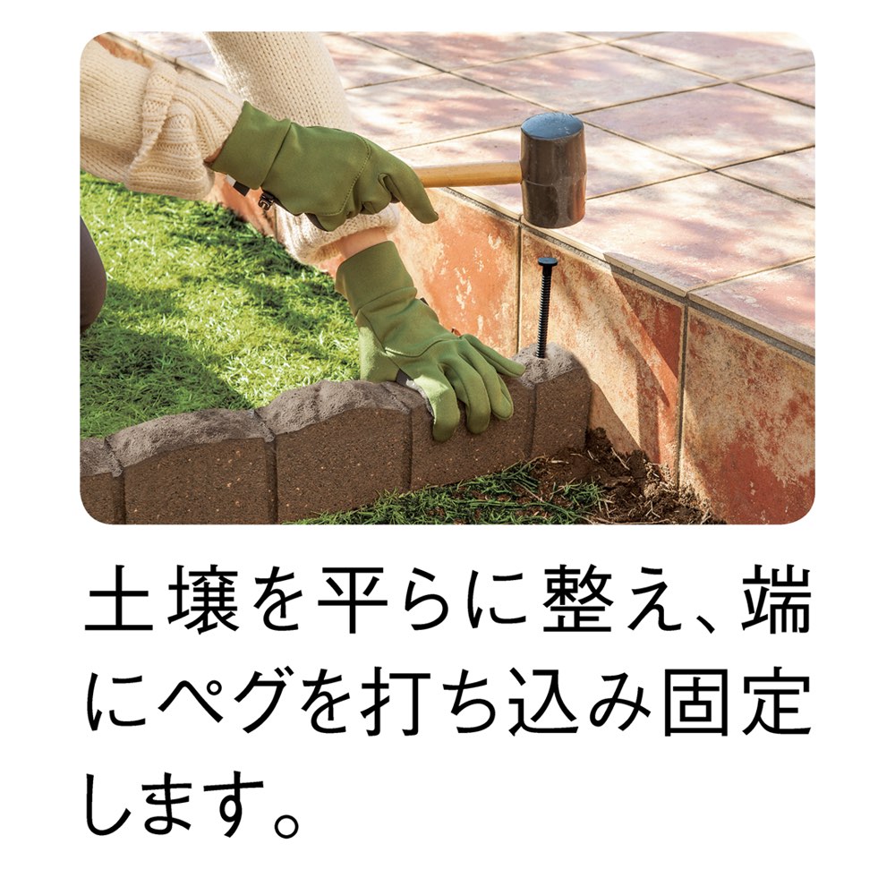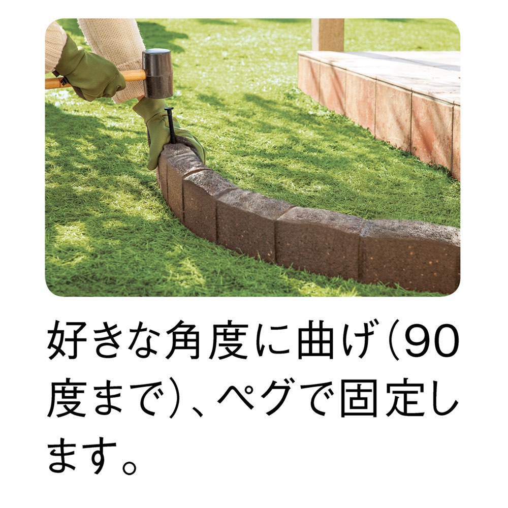 レンガ調ラバーなら手軽に花壇のスペースを実現できます。小さなお庭でも花壇スペースが可能に!!お届けは幅120cm×2個(幅240cm分)になります。直線も曲線も自由自在にエッジング手間もワザもいらずにレンガ調花壇が簡単につくれます。耐久性に優れ、比較的軽量なラバー製の仕切り材。設置も簡単、土止めにも。本体を土に固定するだけ、木材のように朽ちる心配がないなど、扱いやすいのが特長です。レンガ調でナチュラルな植栽になじみます。のこぎりでカット可能長さは必要なところでのこぎり等でカットが出来ます。【使用方法】(1)土壌を平らに整え隅にペグを打ちます。(2)好きな角度に曲げ(90度まで)ペグで固定します。カナダ・トロントに拠点を置くマルティホーム社床材のリーディングメーカー、マルティホーム社の企画商品。デザイン、機能、耐久性が備わったガーデニング用品を製造しています。