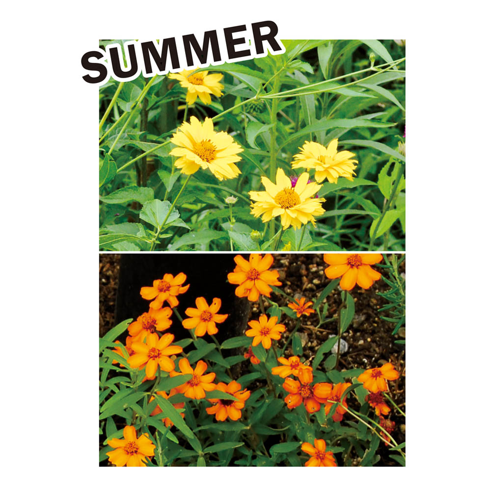 おすすめのナチュラル植栽コーディネート:草丈があるヘリアンサスをメインに。暑さや乾燥に強いジニア、ペンタスなどもおすすめ。ホスタで瑞々しさを添えて。