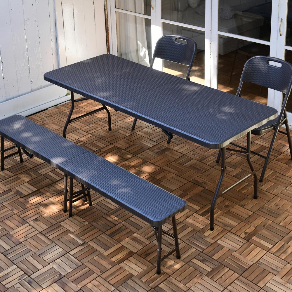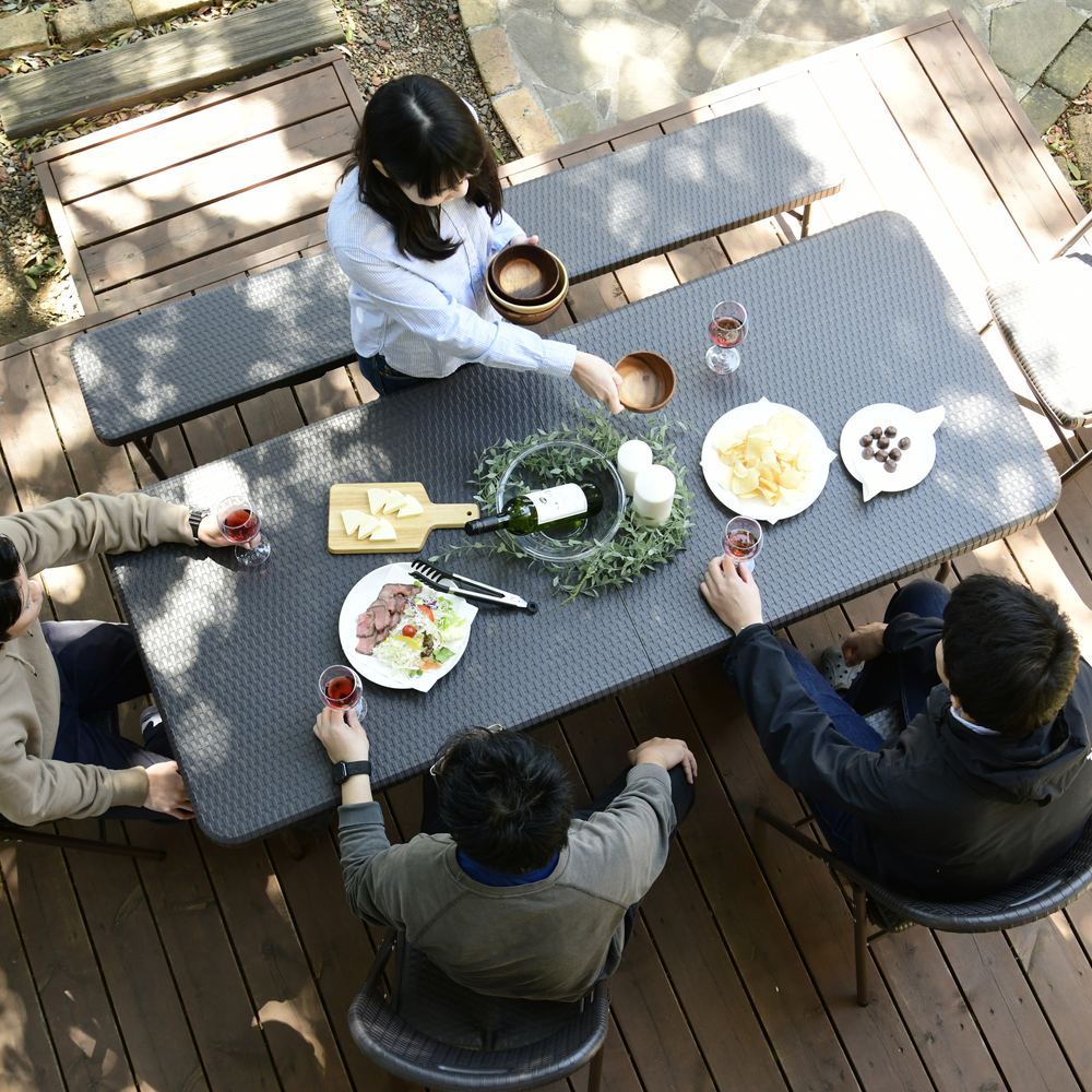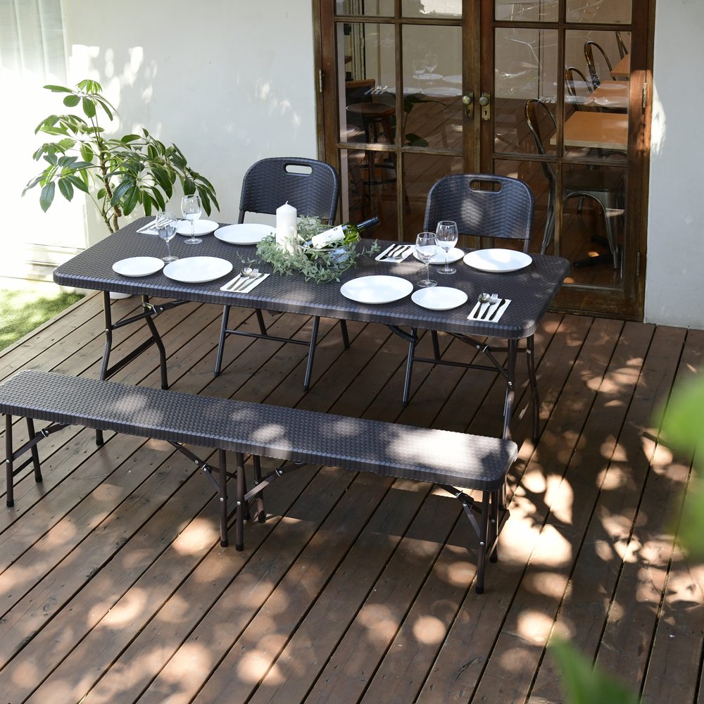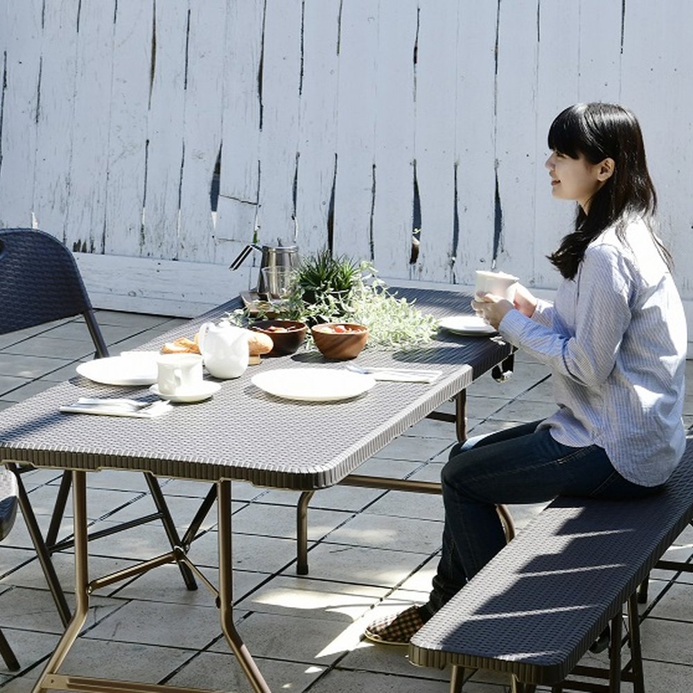 ※スチール製品は素材の特性上、経年変化でサビが発生致します。長くお使い頂くために、お届け直後の錆止め材の塗布をお薦めしております。 また、ご使用開始後も定期的なお手入れをお薦めします。(お手入れ方法&取り付け方法)特大ワイドサイズで作業がしやすく、使わない時には折りたたんでコンパクトに収納できる屋外用テーブル。ラタンのような高級感があり、樹脂製なので汚れても水洗いができてお手入れも簡単。 テーブル、チェア2脚、ベンチのお買い得4点セットです。寄せ植えづくりから、BBQのサブテーブルや立食パーティ、フリマにもとっても便利な折り畳みテーブル。幅180cmのワイドサイズは何をするにも広々ゆったり使うことができます。お得な4点セットはワイドサイズのテーブルと、折り畳みチェア2脚、幅広ベンチがセットになっています。ラタン調折りたたみ作業台シリーズはすべて折り畳んでコンパクトに収納可能なので、車のトランクにも入り、レジャーにぴったり。持ち手が付いているので持ち運びも簡単です。BBQやピクニック時に最適。ラタンの風合いを再現した樹脂製のウィッカー調ガーデンファニチャー。樹脂製なので、汚れても水洗いができてお手入れも簡単。