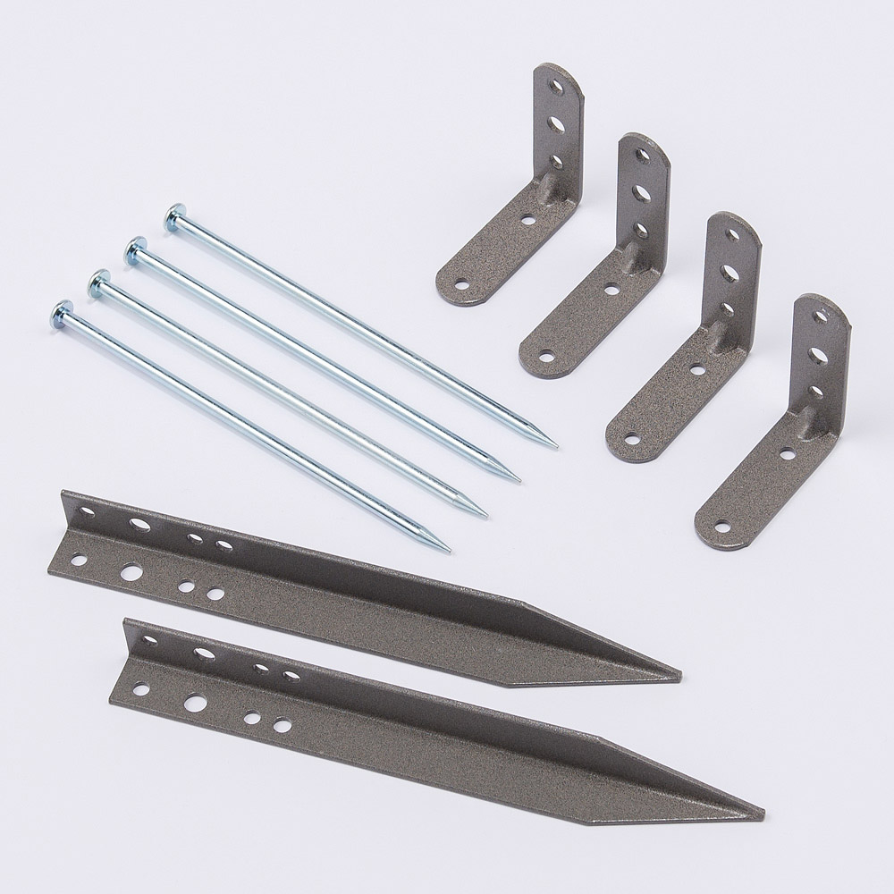 土や芝生など柔らかい場所には、付属のL字金具と固定用ペグで簡単に設置可能。