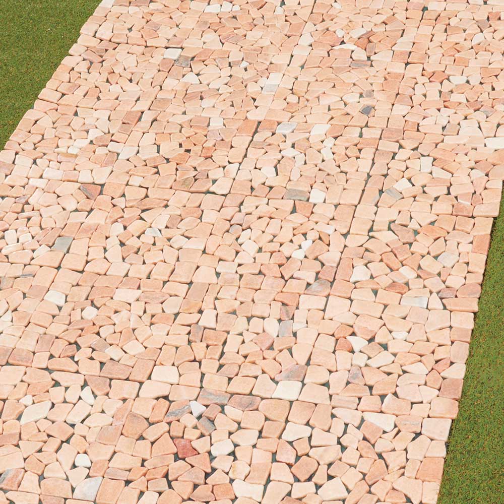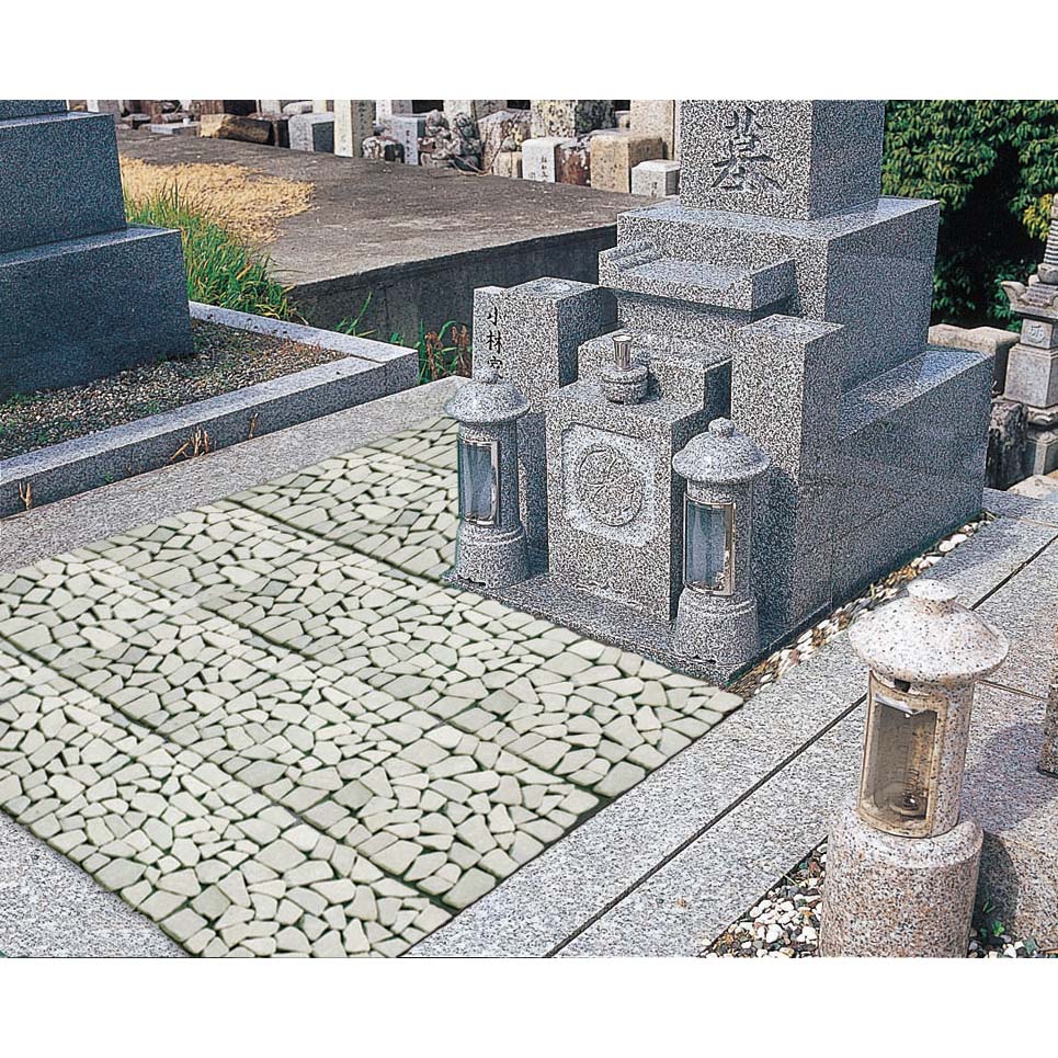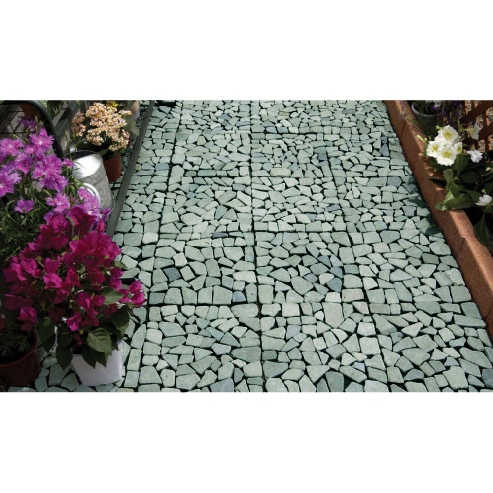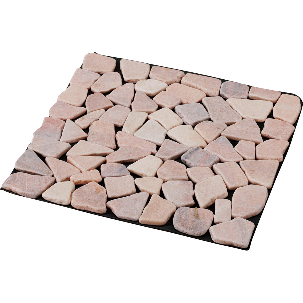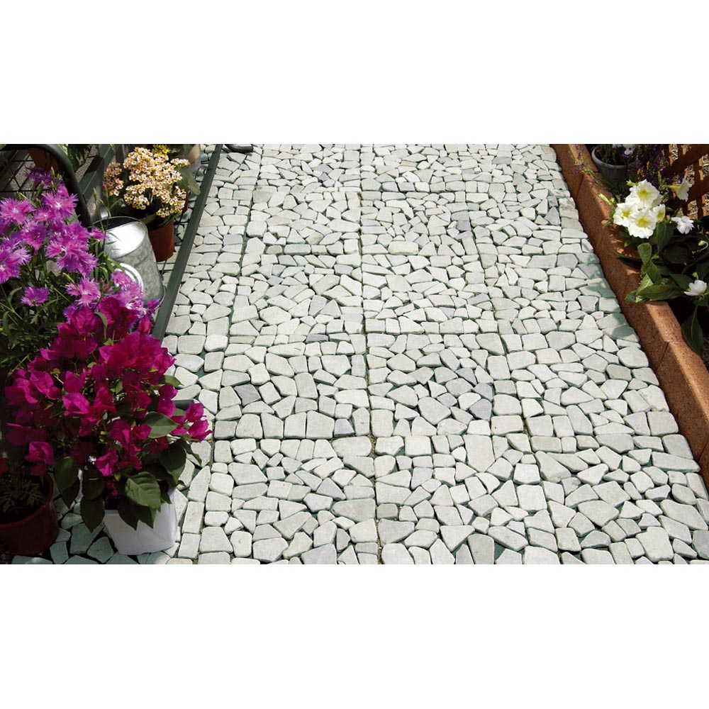 お庭の草抜きが大変!という方におススメ!雑草防止シートを裏張りした天然石のマット。敷くだけでめんどうな草むしりの手間が解消&お庭を美しく整えるます。庭にはびこる雑草の悩みを解決!◆何度手入れしても、何度でも生えてくるお庭の雑草。◆土壌部分を手軽に隠すマットタイプのペイピング材で「生えない対策」を!◆本来先に設置すべき雑草防止シートがすでに裏面に付いていて、設置も楽々。◆雑草の育成に必要な日光を99%以上カット、成長を阻止します。◆除草シートととして、除草剤などの薬剤を一切使用していないので環境にもやさしい。タイル状の天然石マットをただ敷き詰めるだけで、空間をおしゃれに変身!◆機能はもちろん、高級感のある見た目も大好評。◆石と石の間は簡単にカットできるので、設置するスペースに合わせて調節することができます◆一辺が約30cmの正方形マットで女性にも扱いやすく、簡単に設置できます。◆お庭はもちろん、玄関周りや裏庭、ベランダでもご使用いただけます。
