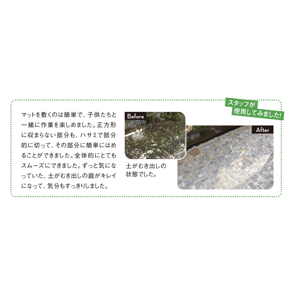 簡単・手軽に美しく雑草防止。 敷き詰めるだけなので女性でも簡単。カッターでカットして、設置するスペースに大きさを合わせられます。